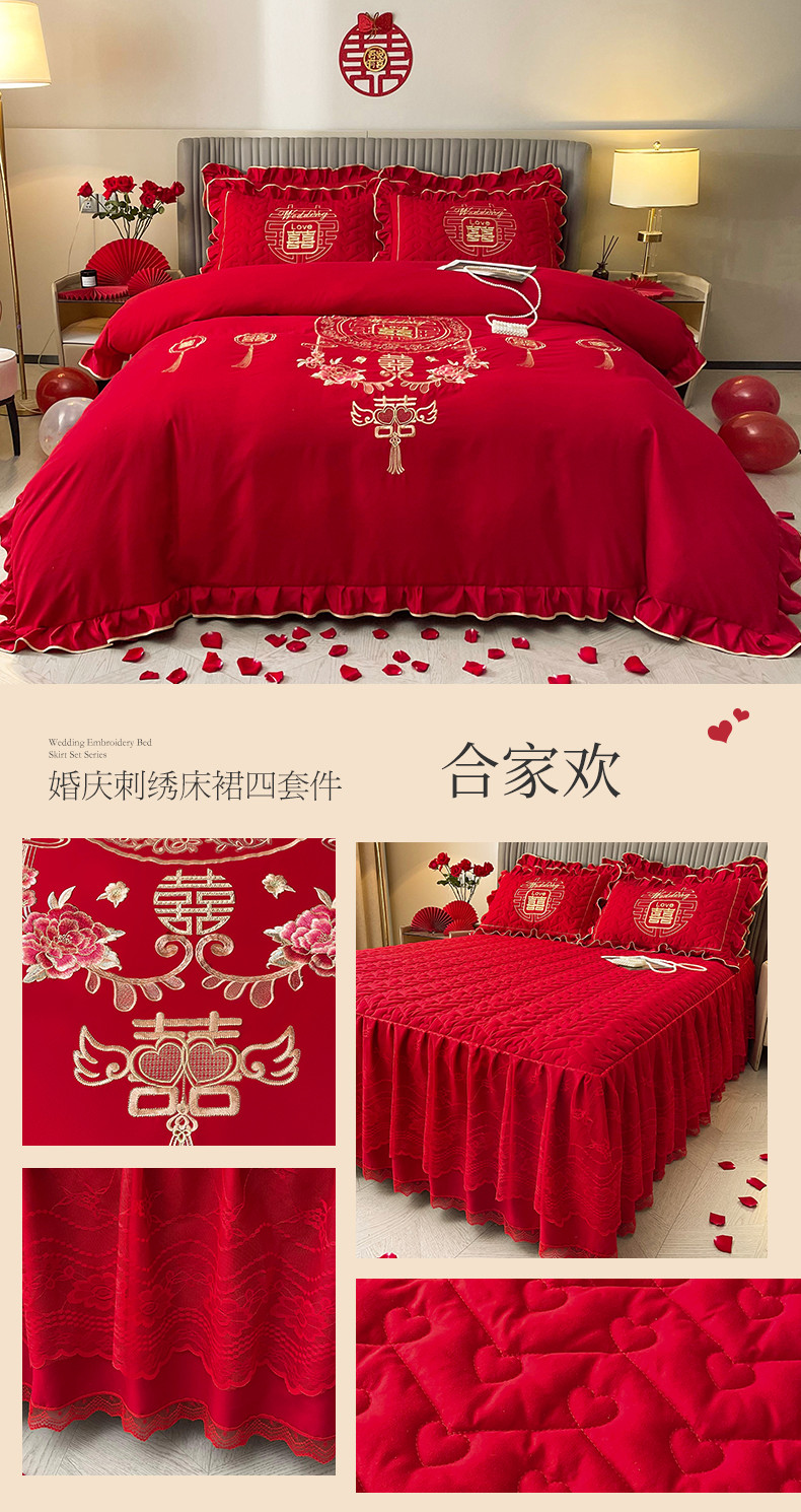 当前位置: 91家纺网 > 商品网购 > 床品套件 > 四件套 > 普通磨毛四件套 > 宜凡家纺 2023新款亲肤磨毛婚庆夹棉床裙四件套 合家欢
