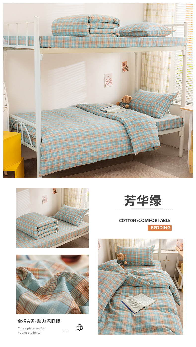 当前位置: 91家纺网 > 商品网购 > 床品套件 > 四件套 > 全棉普通四件套 > 柠萌 A类全棉色织水洗棉简约条纹格子学生季宿舍上下铺三件套 芳华绿