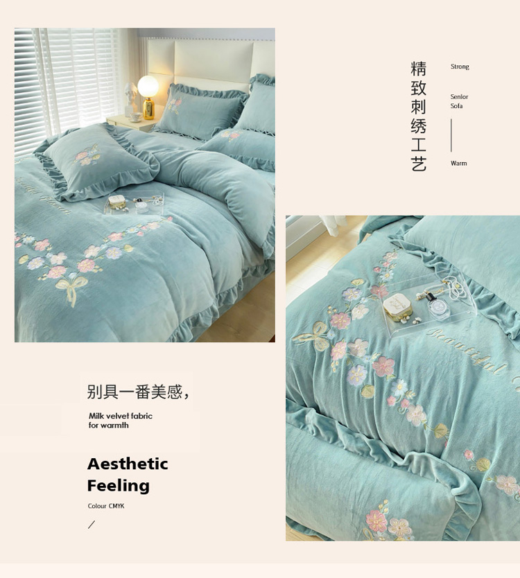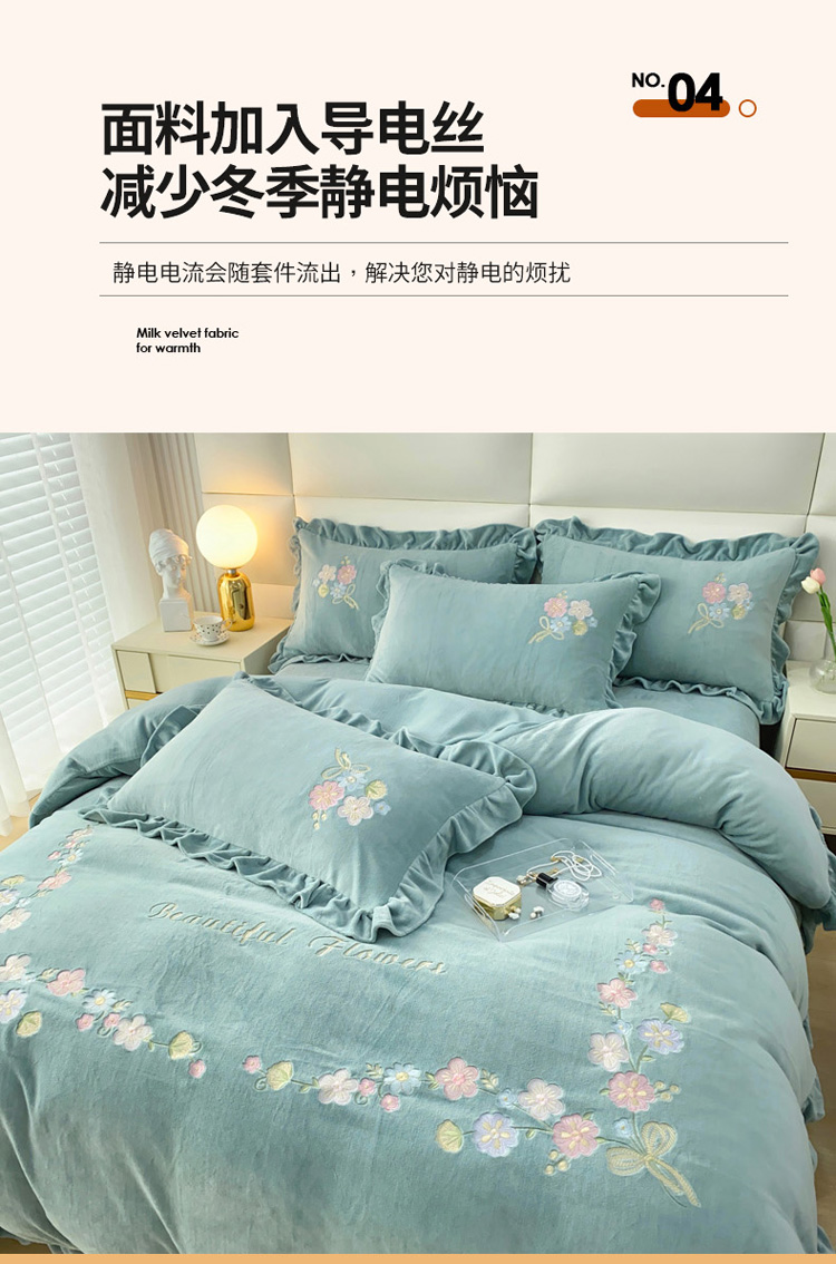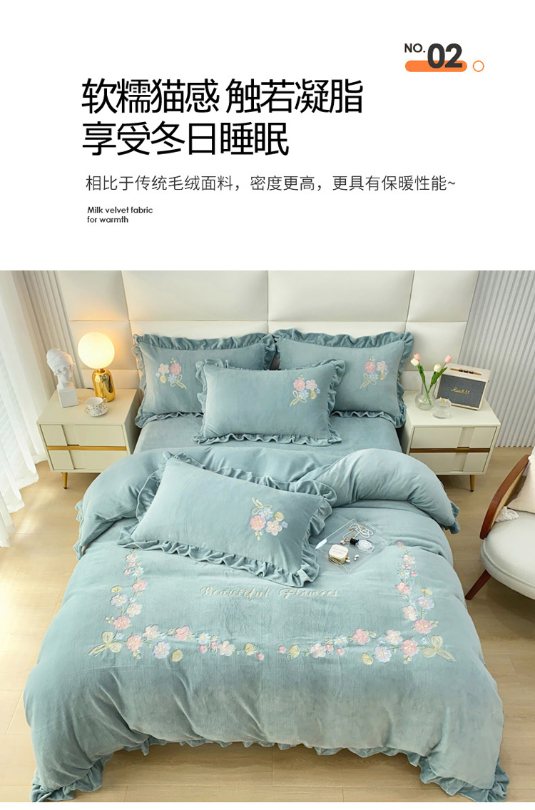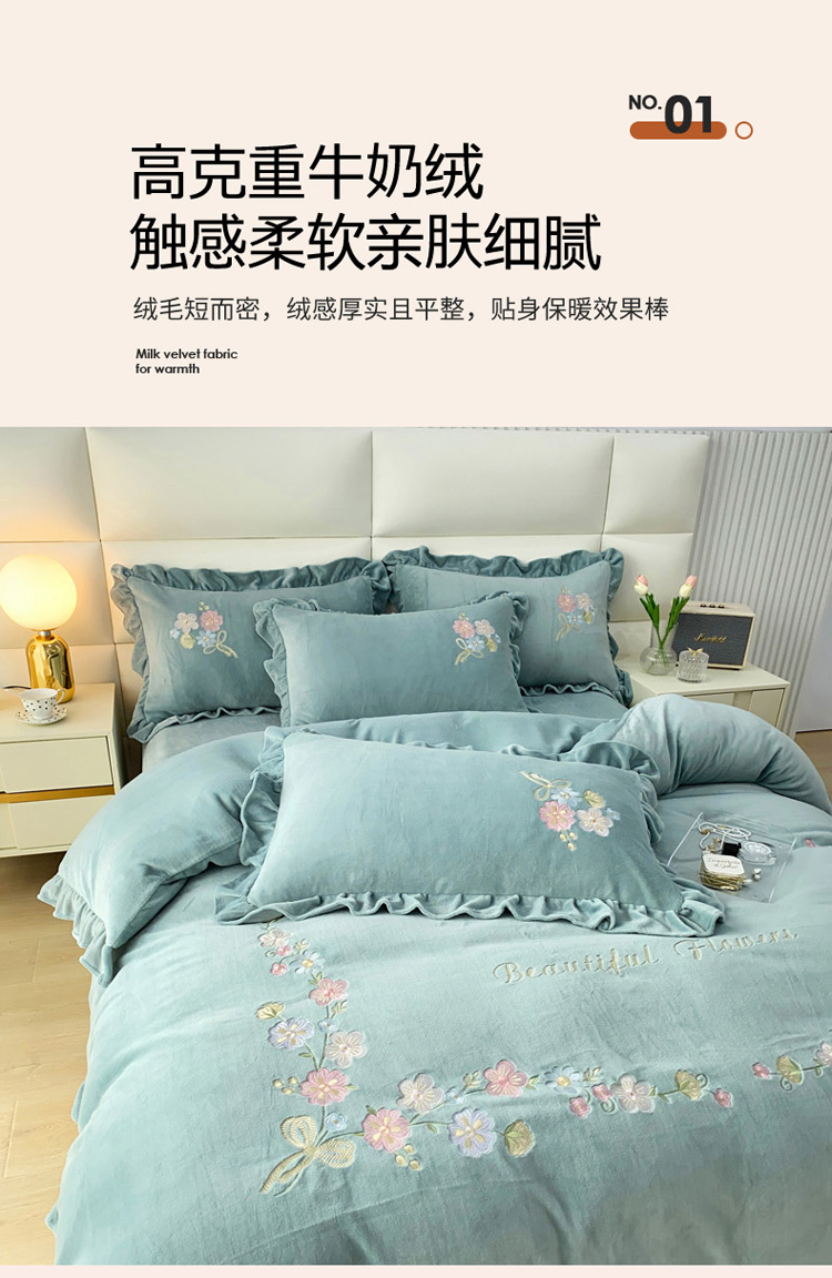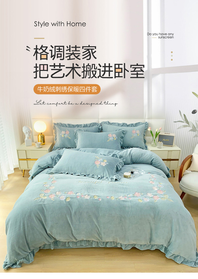(总)星尚家纺 2024新款保暖全消光A类230g牛奶绒绣花绒四件套-曼妙花园,豆沙粉,孔雀蓝,清新绿,绅士灰,香芋紫,樱花粉