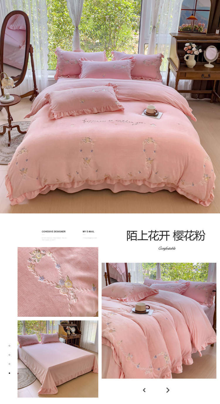 (总)星尚家纺 2024新款全消光230g牛奶绒刺绣保暖四件套-花漾,晨雾绿,豆沙粉,樱花粉