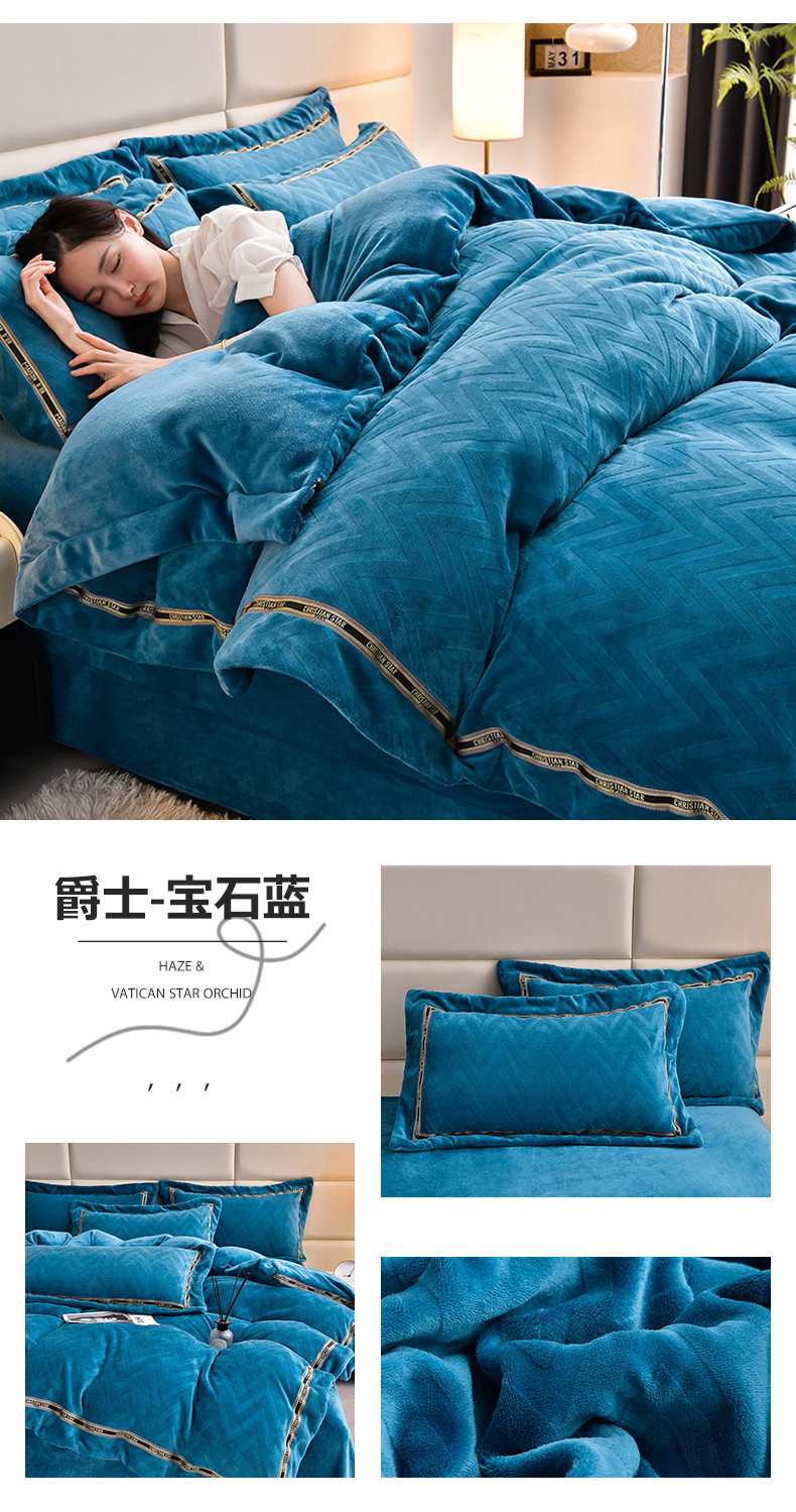 商品名称:妮恒美 2023新款牛奶绒雕花压线款四件套 爵士-宝石蓝