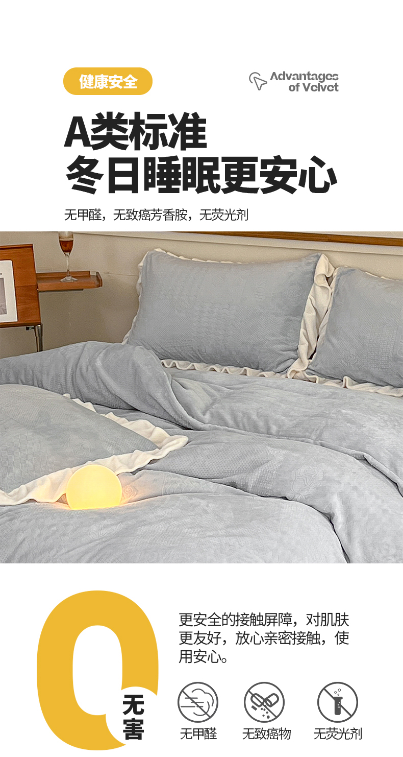 商品名称:(总)桃子家居 2023新款A类高克重230克法式烂花雕花提花加厚韩版花边牛奶绒四件套