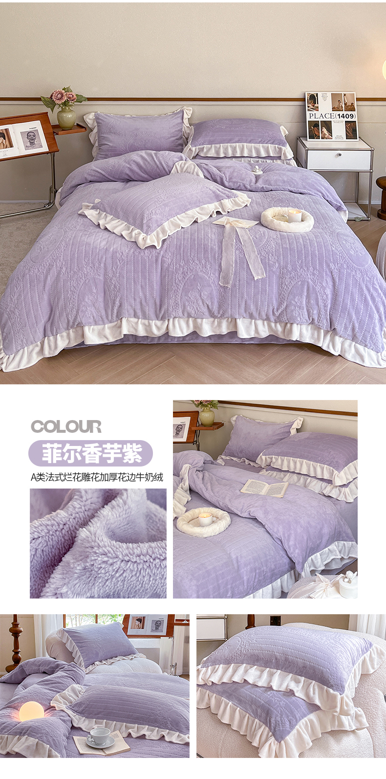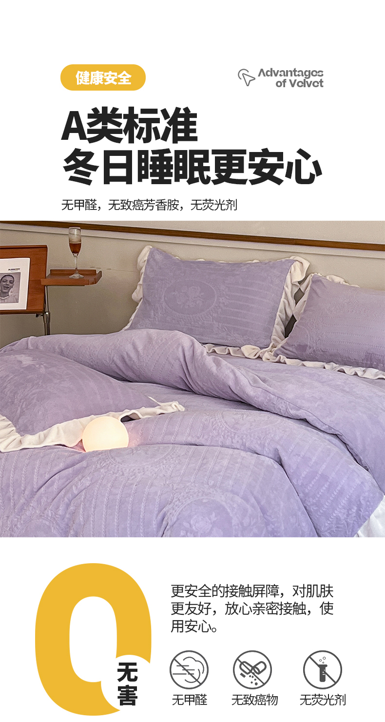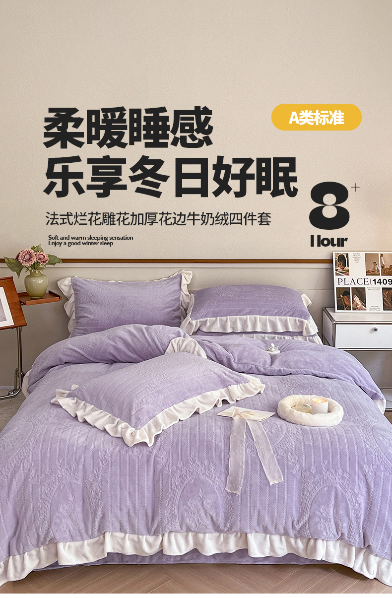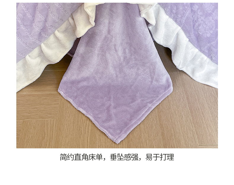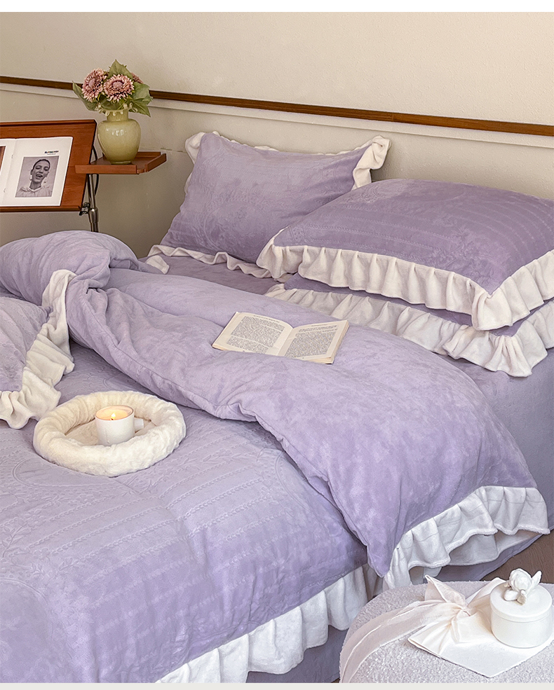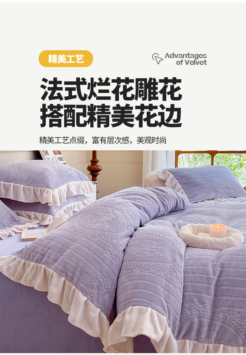 商品名称:桃子家居 2023新款A类高克重230克法式烂花雕花提花加厚韩版花边牛奶绒四件套 绒烂花-菲尔香芋紫