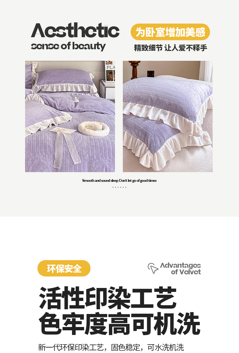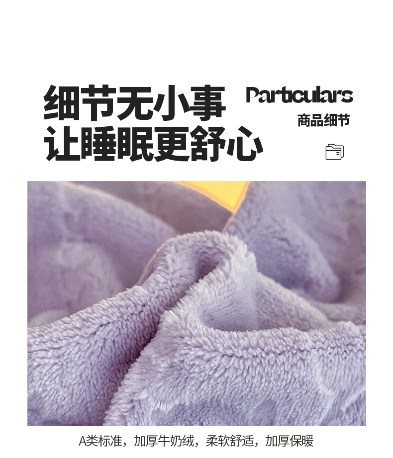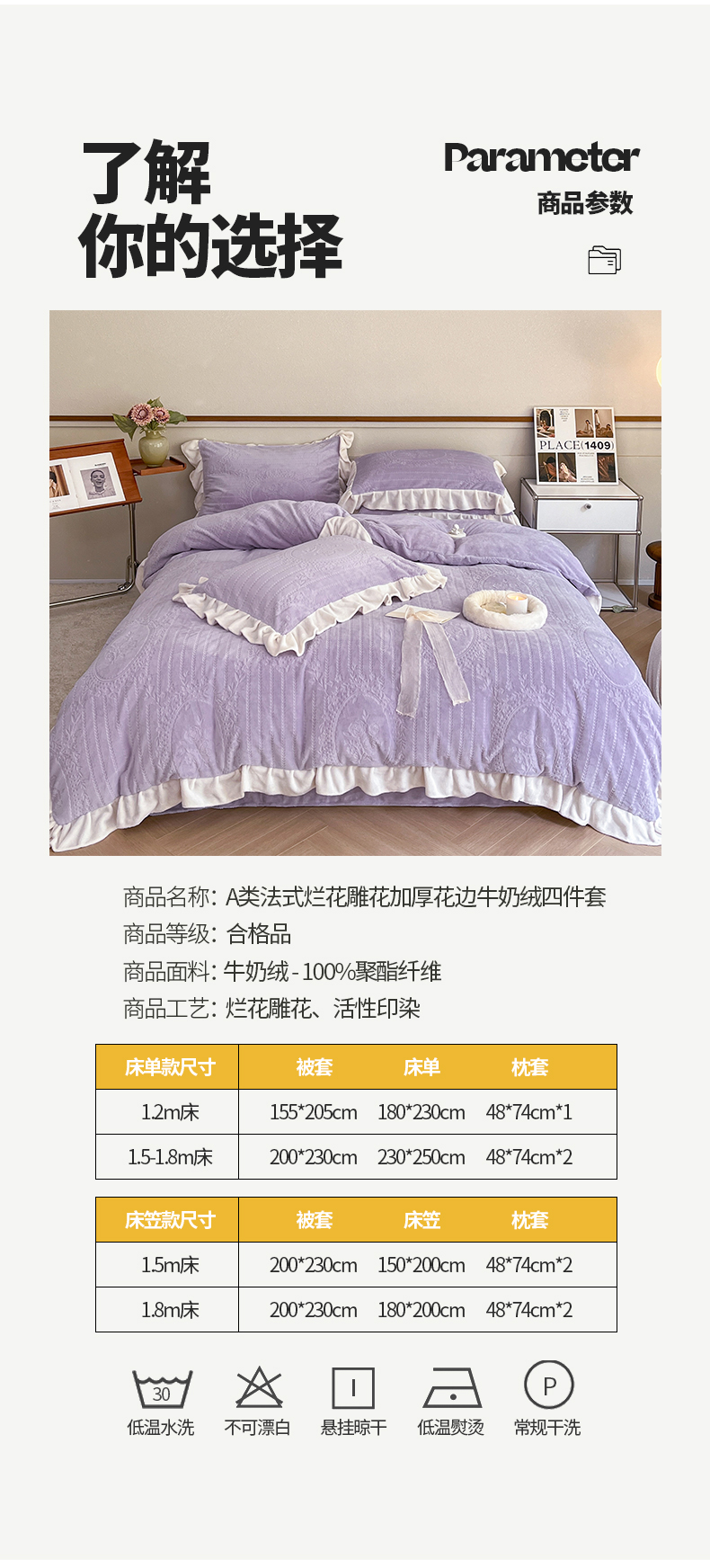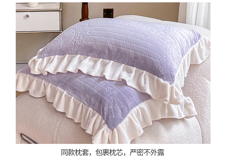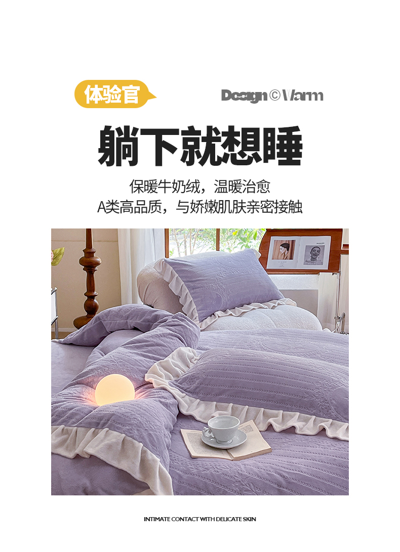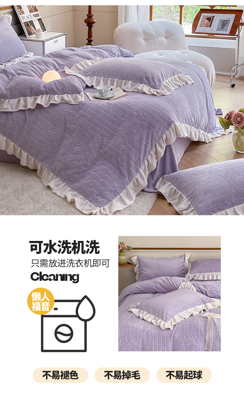 商品名称:桃子家居 2023新款A类高克重230克法式烂花雕花提花加厚韩版花边牛奶绒四件套 绒烂花-菲尔香芋紫