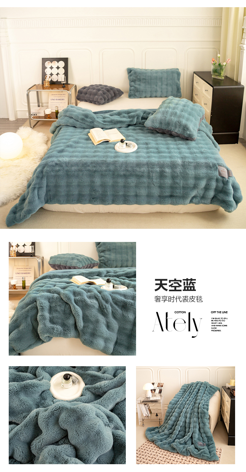 商品名称:尚品绵羊毛毯 2025新款仿裘皮皮草貂皮毛毯轻奢高端婚庆加厚双层拉舍尔毛毯 天空蓝