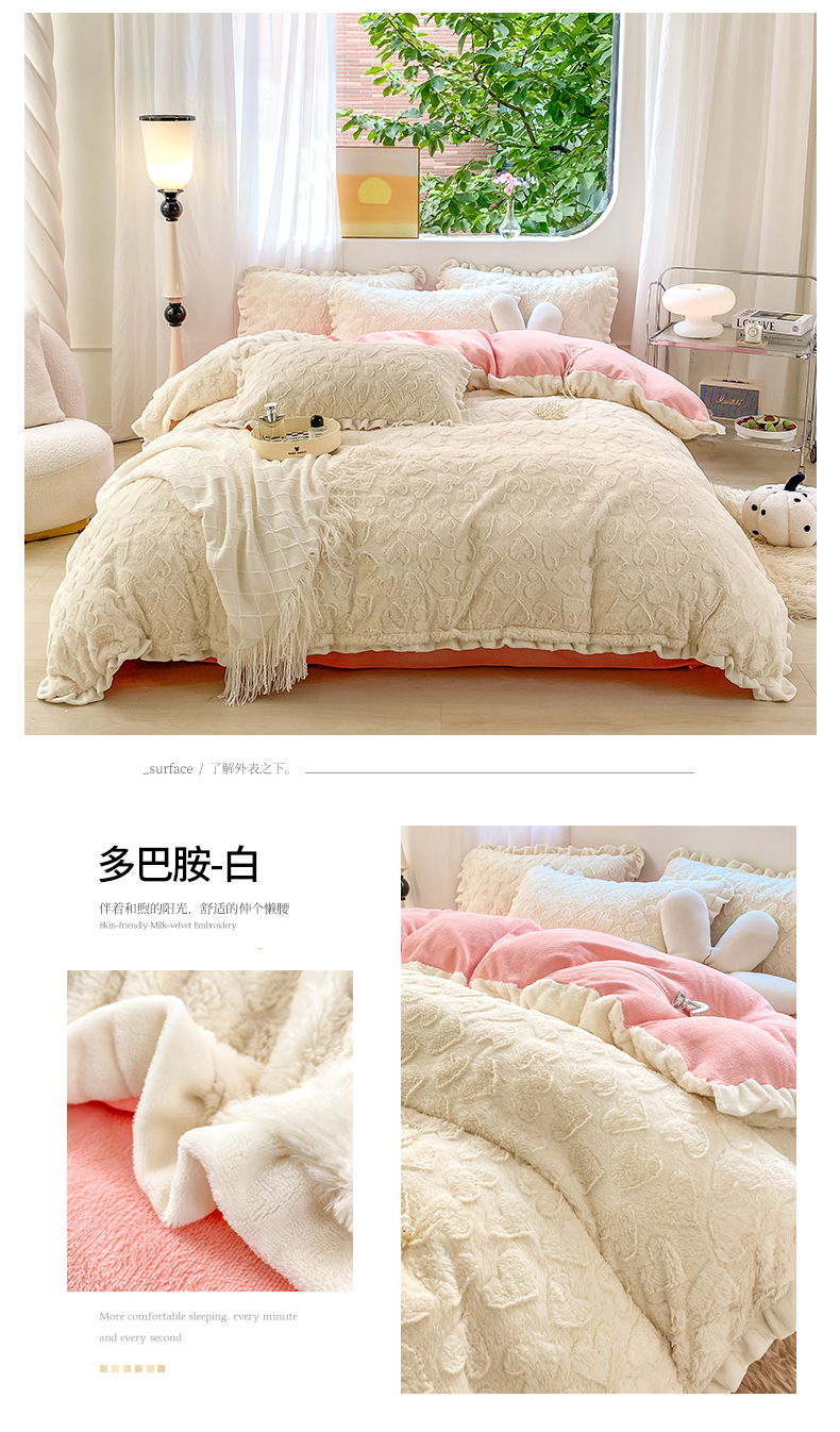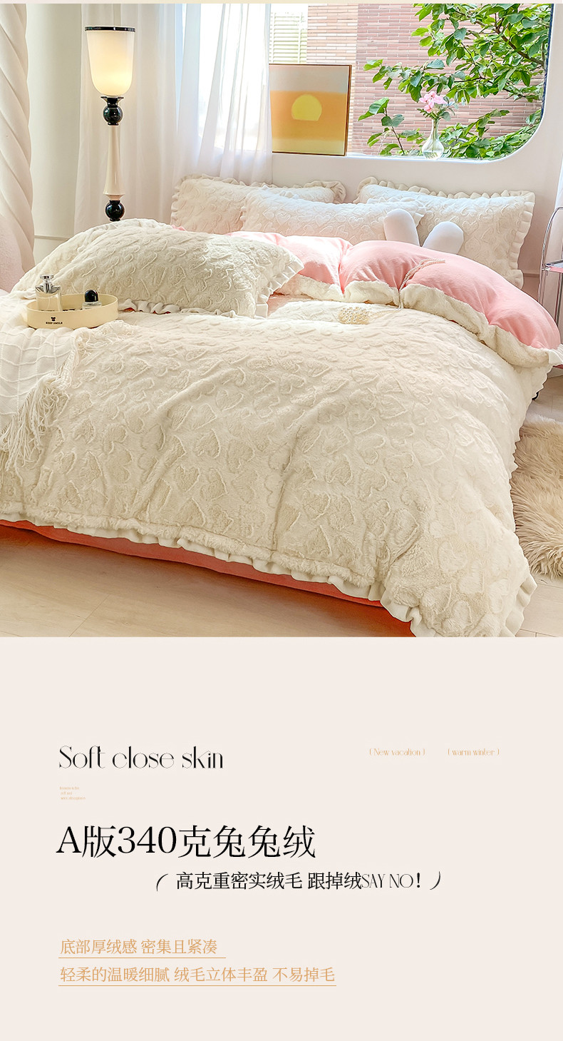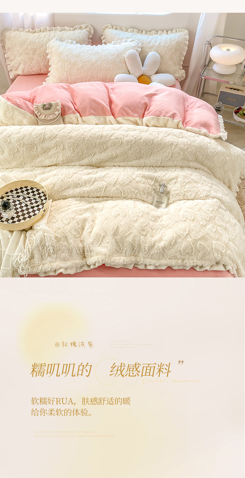 总大米家居2024款爱心兔兔绒双层牛奶绒花边雕花绒兔毛四件套多巴胺色系,多巴胺-绿,多巴胺-白,多巴胺-粉,多巴胺-黄,多巴胺-蓝