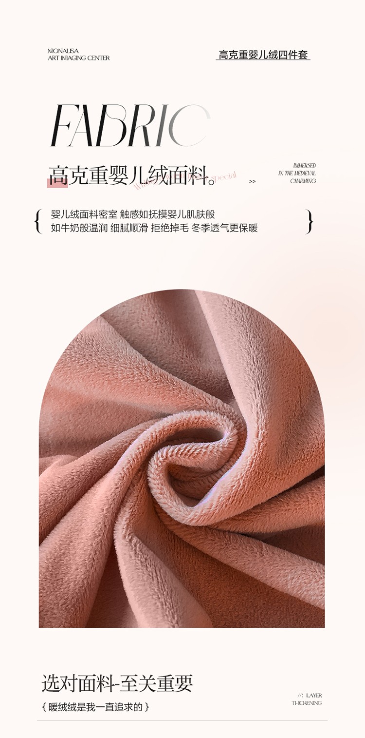 商品名称:嗯呢2023新款A类高克重婴儿绒牛奶绒埋绳保暖绒四件套 茶粉