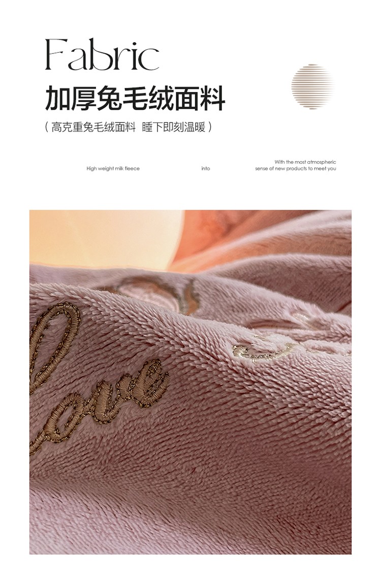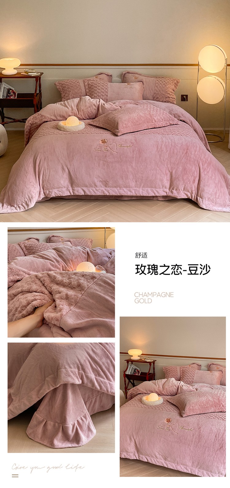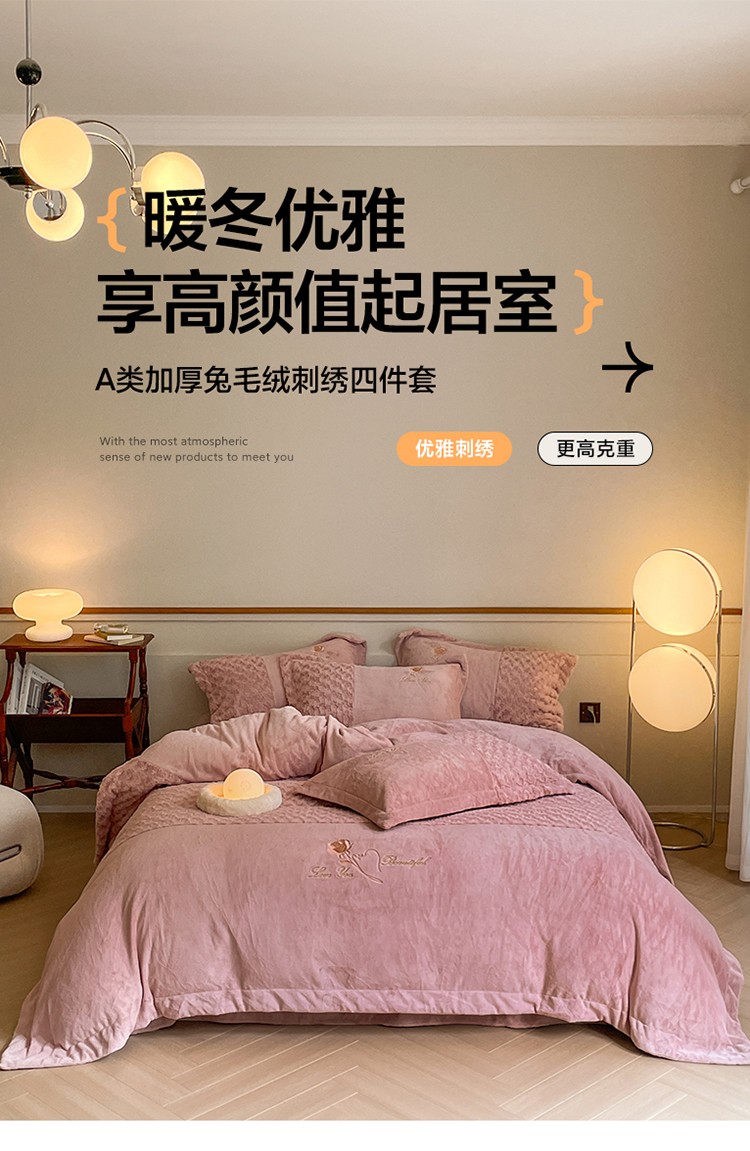 商品名称:嗯呢2023新款高克重双拼兔毛绒牛奶绒保暖刺绣绒四件套 玫瑰之恋-豆沙
