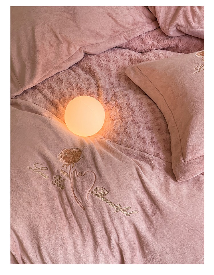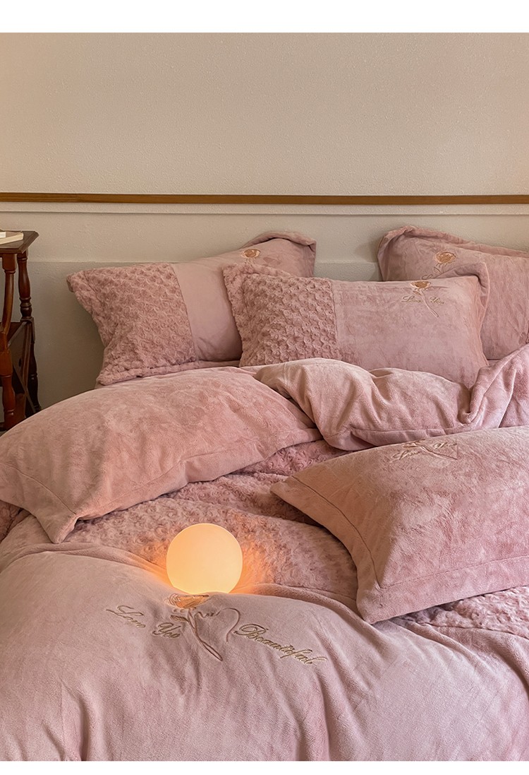 嗯呢2023新款高克重双拼兔毛绒牛奶绒保暖刺绣绒四件套 玫瑰之恋-豆沙