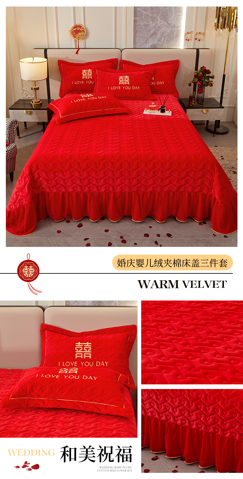 宜凡家纺 2023秋冬新品婴儿绒婚庆床盖三件套 和美祝福