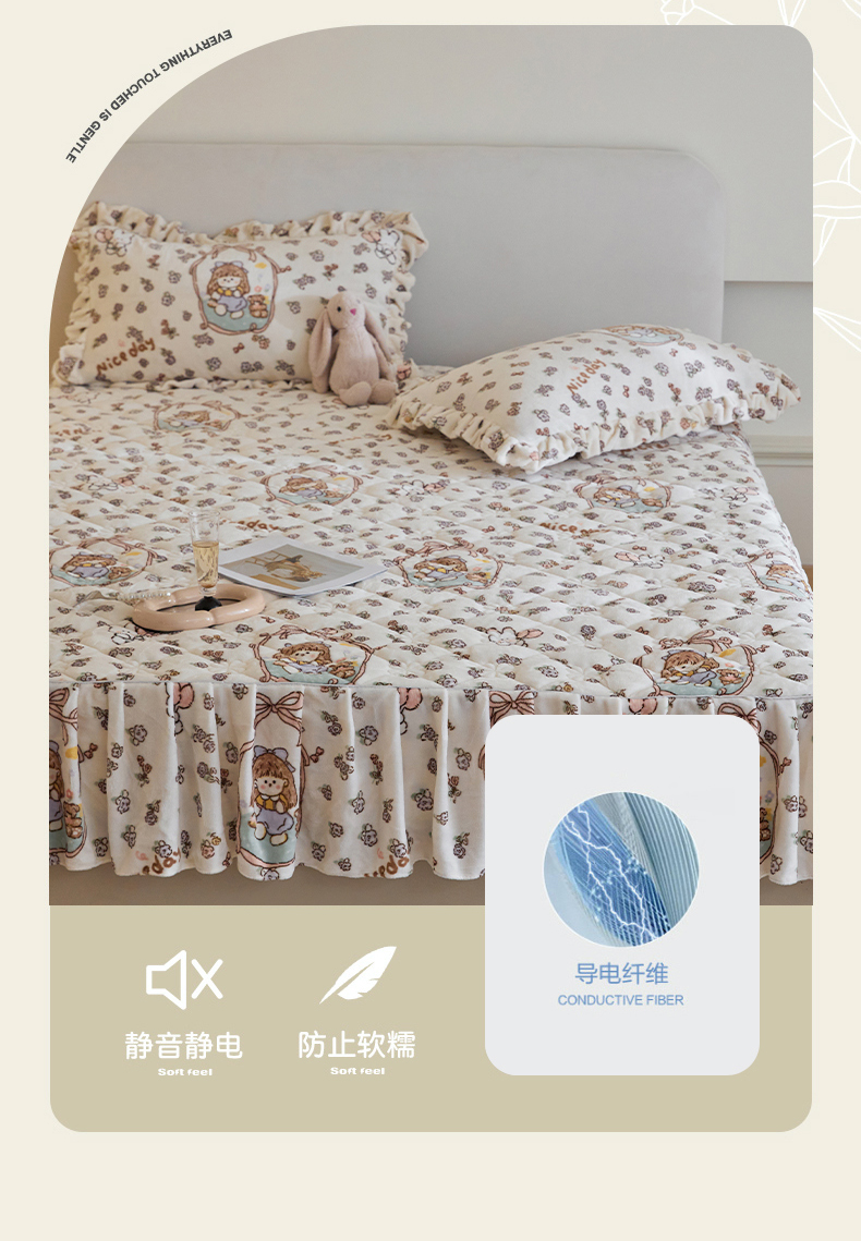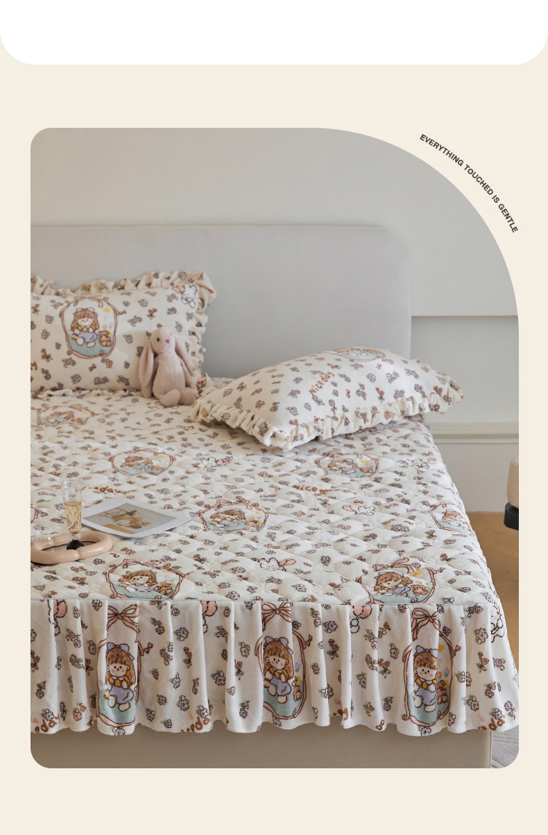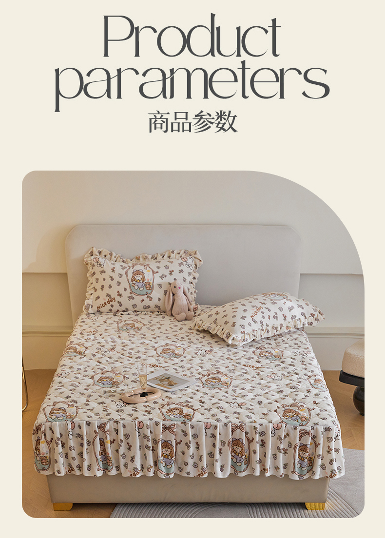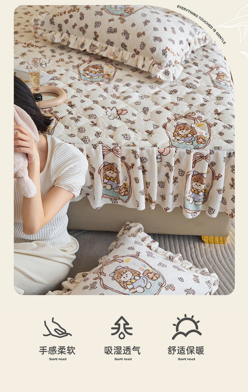铭动家纺 2023新款牛奶绒花边款床笠大豆夹棉加厚床罩三件套床裙款床笠 萝莉