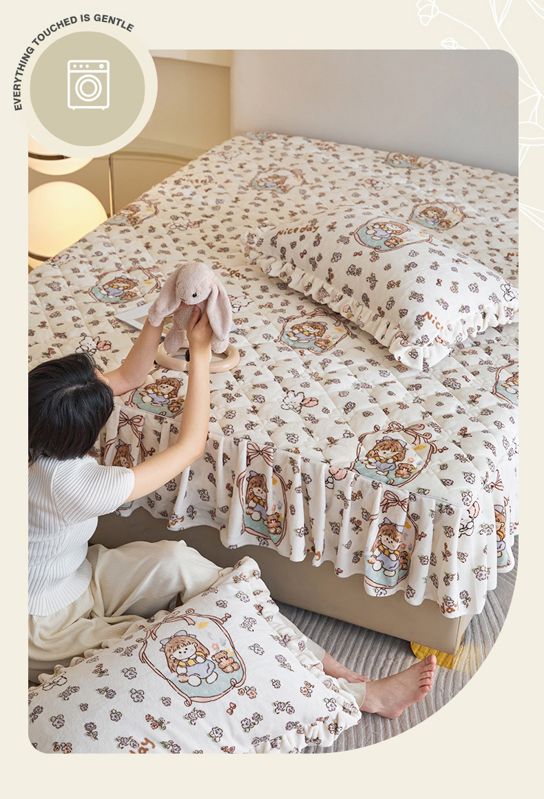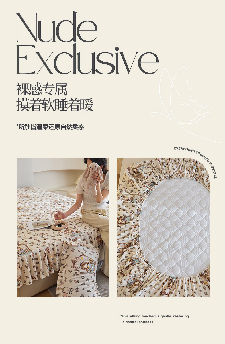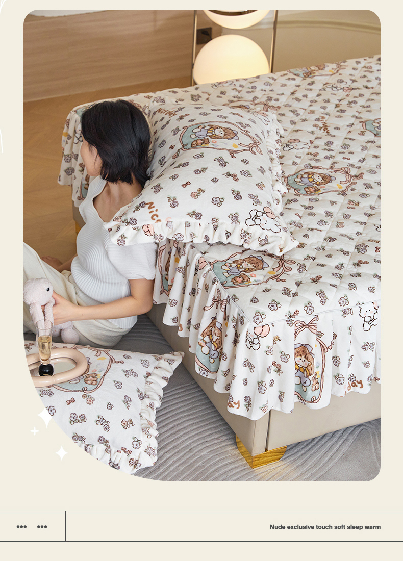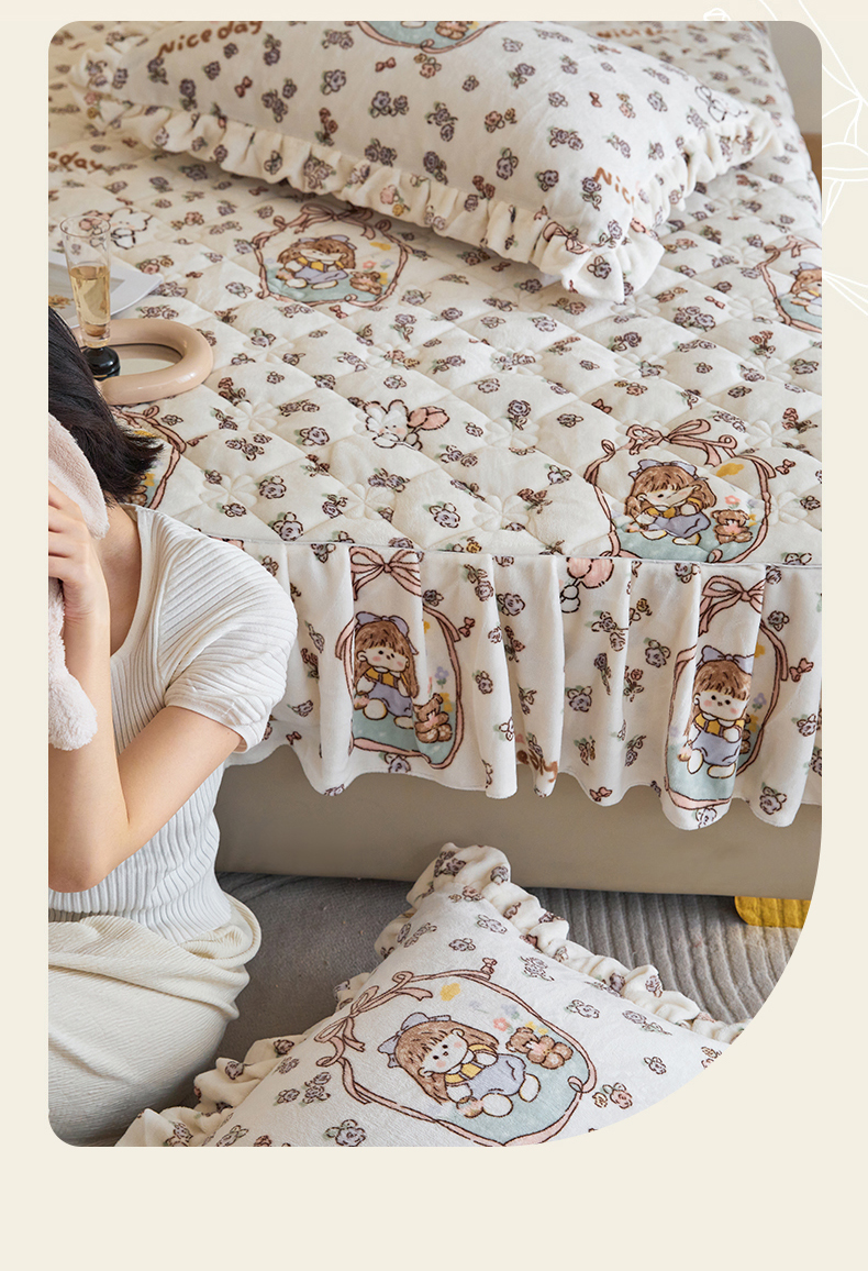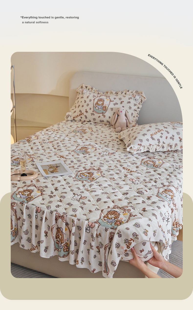 铭动家纺 2023新款牛奶绒花边款床笠大豆夹棉加厚床罩三件套床裙款床笠 萝莉
