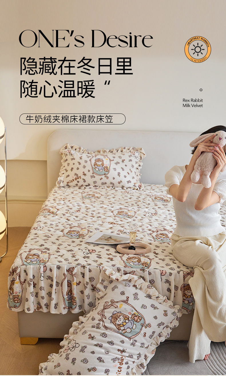 • 91家纺网 家纺一手货源 找家纺 铭动家纺 2023新款牛奶绒花边款床笠大豆夹棉加厚床罩三件套床裙款床笠 萝莉