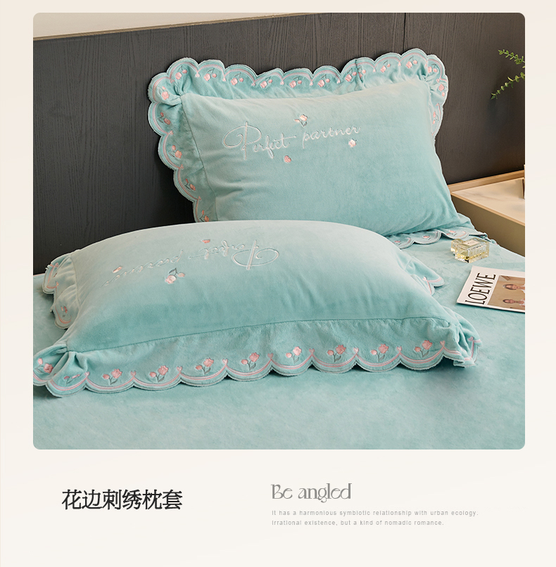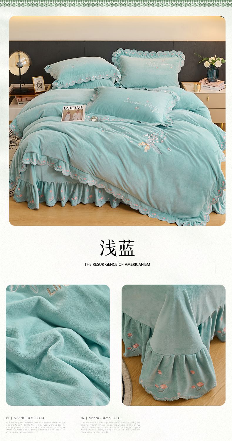 商品名称:恒爱2023新款加厚双面牛奶绒绣花花边款四件套-铃兰花 浅蓝