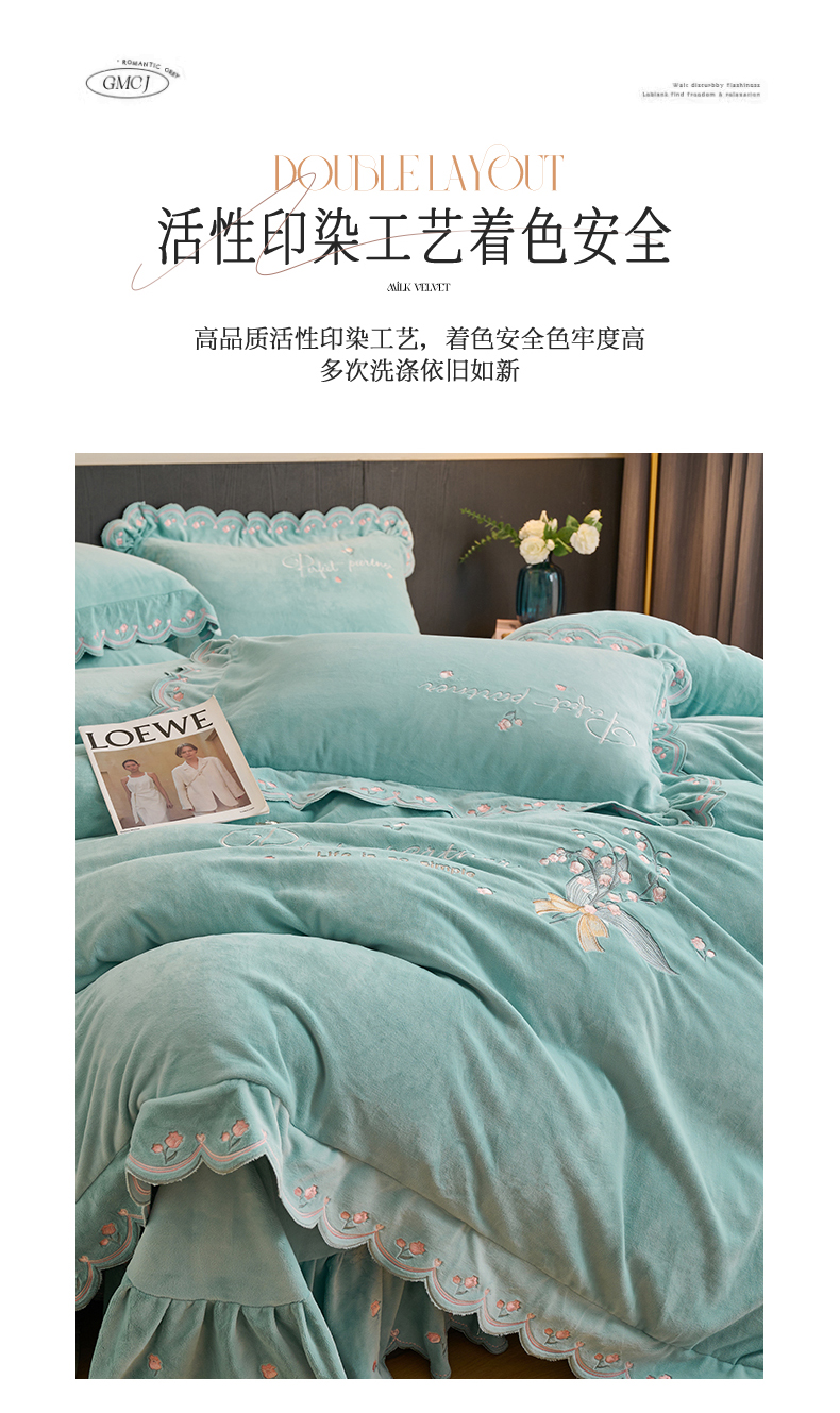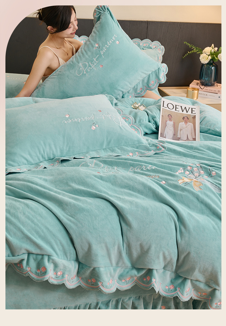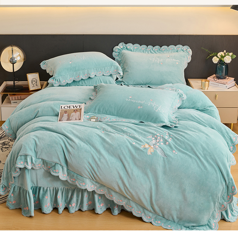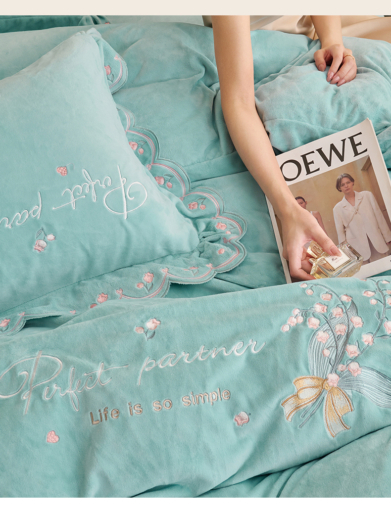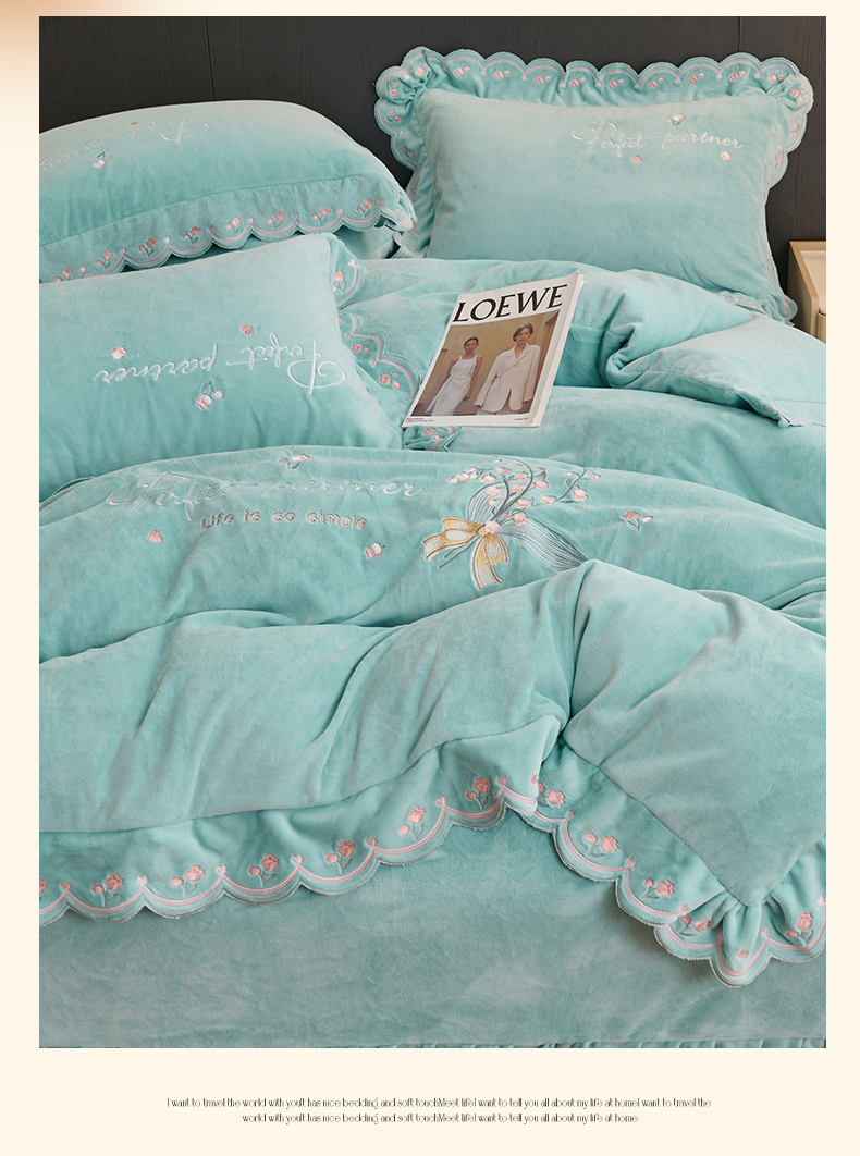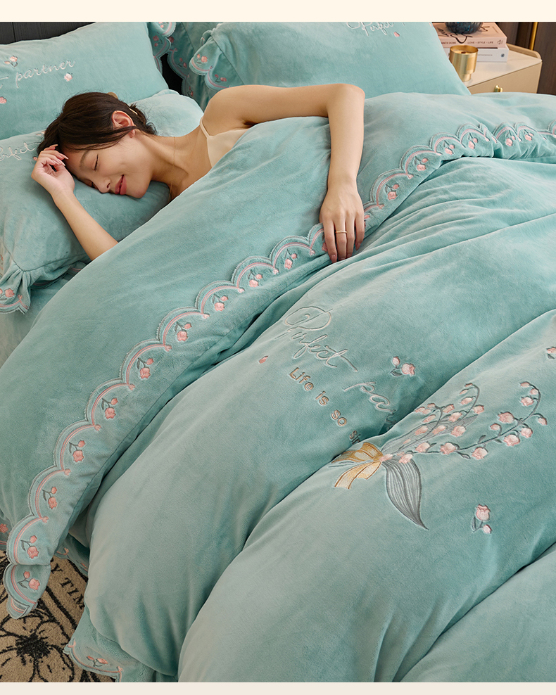 恒爱2023新款加厚双面牛奶绒绣花花边款四件套-铃兰花 浅蓝