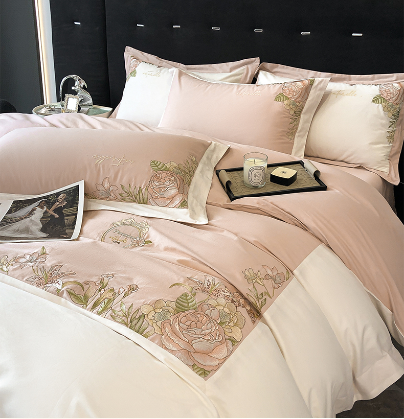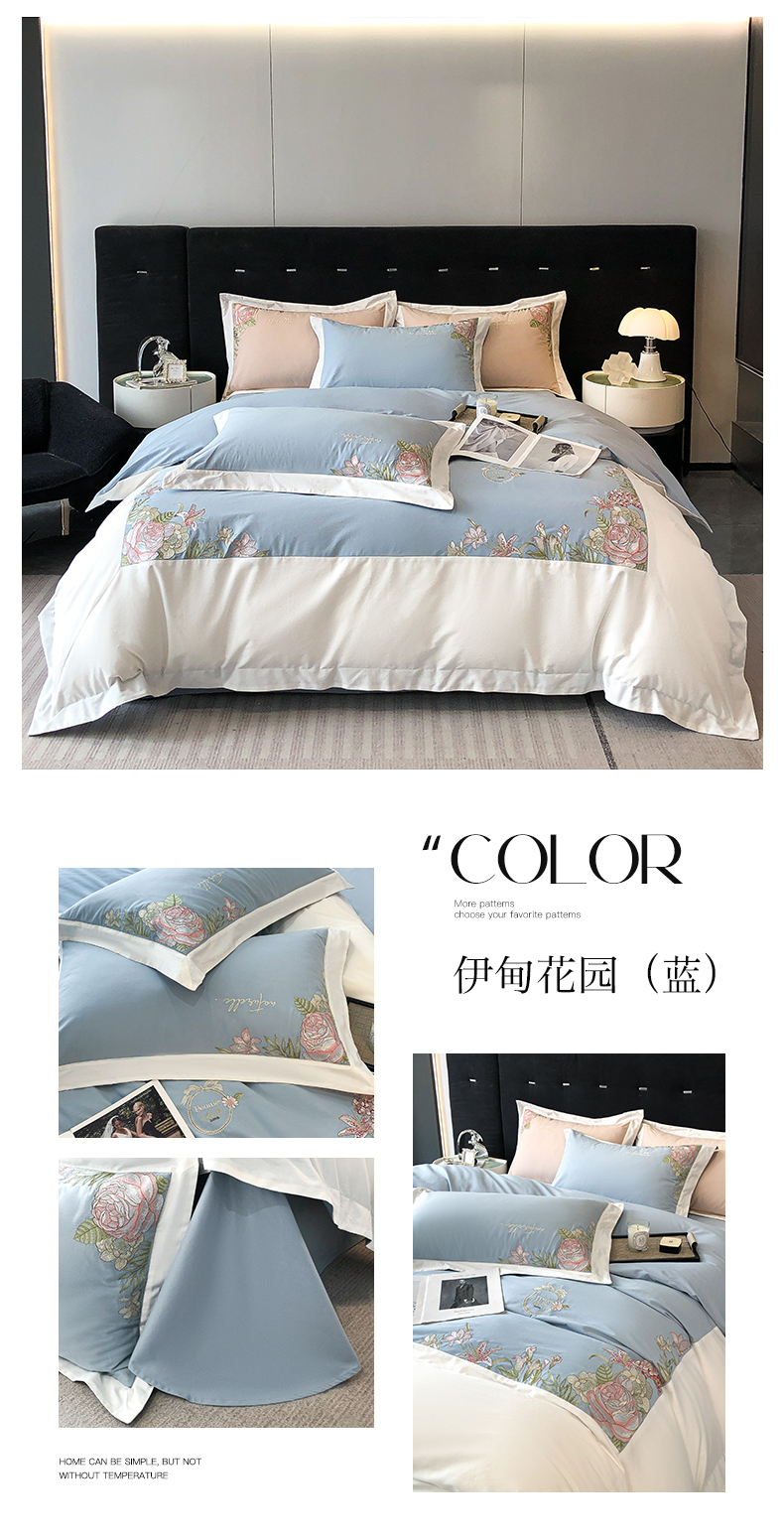 (总)理想家家纺 2025新款纯棉轻奢刺绣四件套--心愿系列场景二,心愿粉,心愿红,心愿黄,心愿蓝
