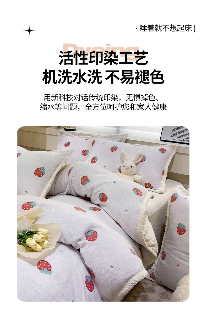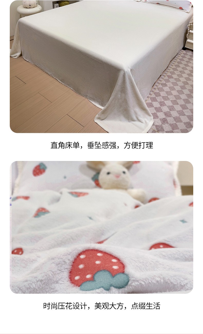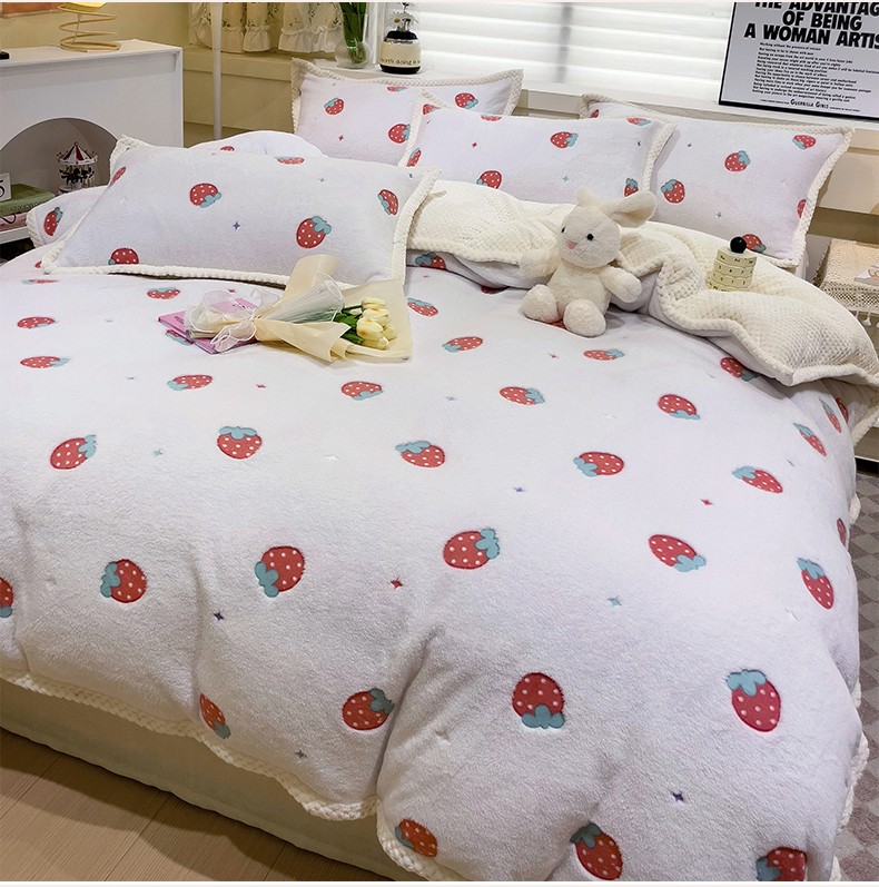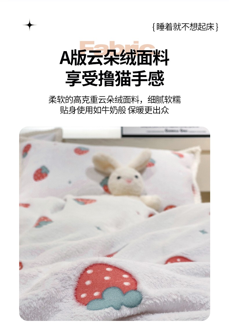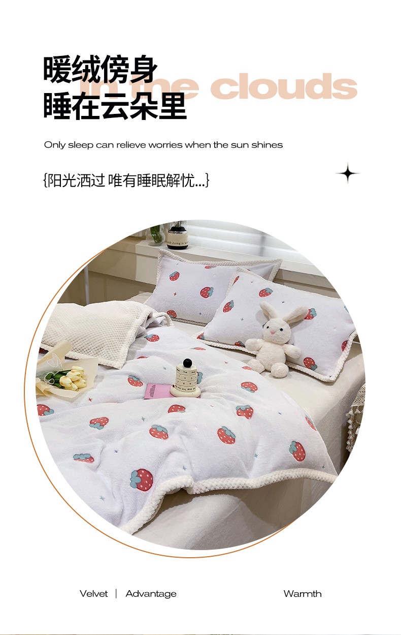 当前位置: 91家纺网 > 商品网购 > 床品套件 > 四件套 > 牛奶绒四件套 > 锦威郎 2023新款云朵绒保暖牛奶绒毛毯绒单被套加绒加厚法莱绒四件套 草莓白
