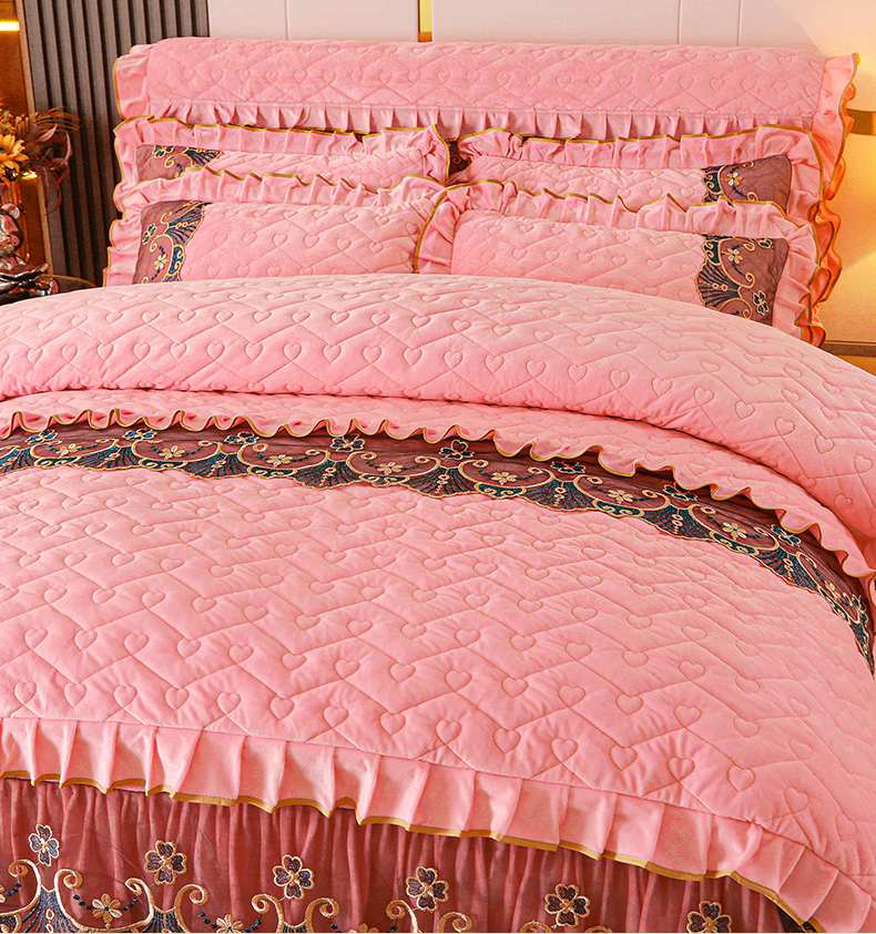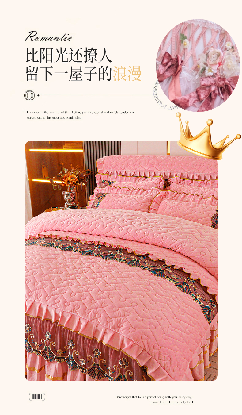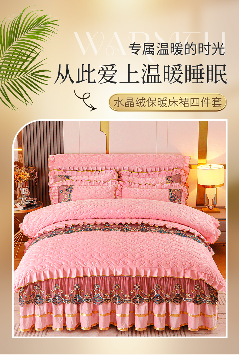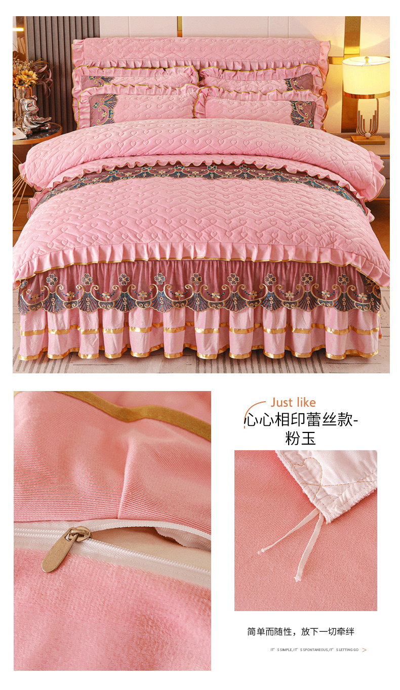 当前位置: 91家纺网 > 商品网购 > 床品套件 > 四件套 > 水晶绒四件套 > 新款心心相印蕾丝款水晶绒保暖床裙四件套 心心相印蕾丝款-粉玉