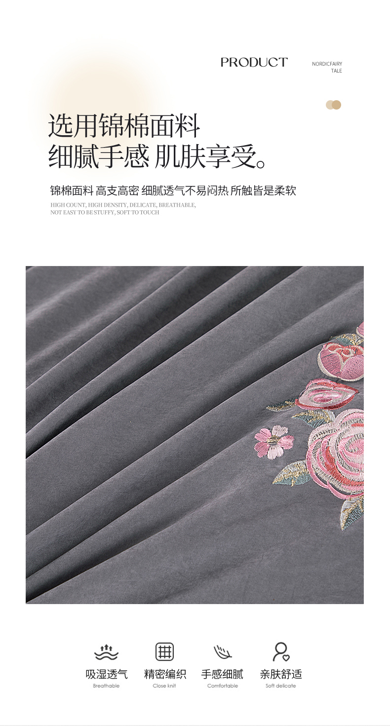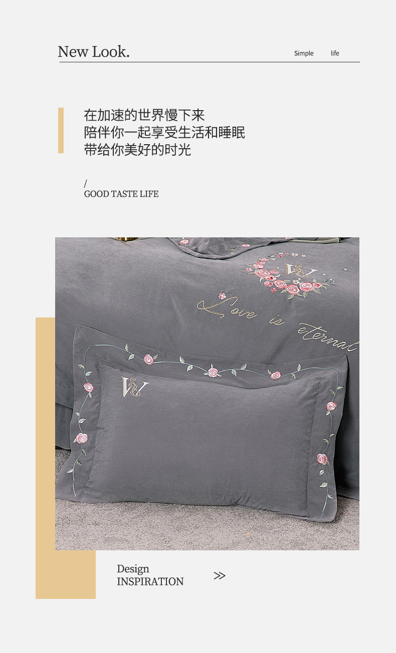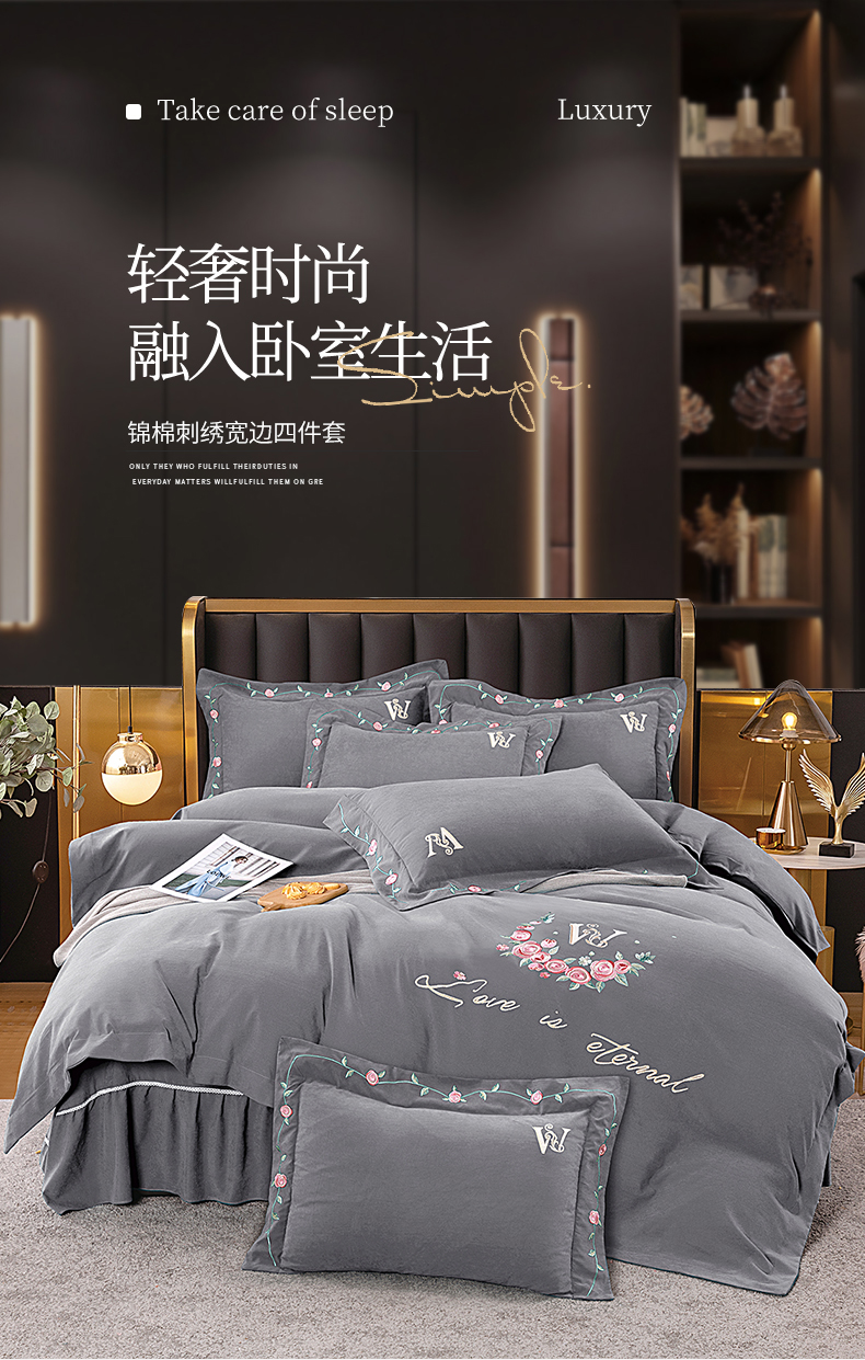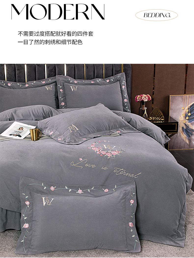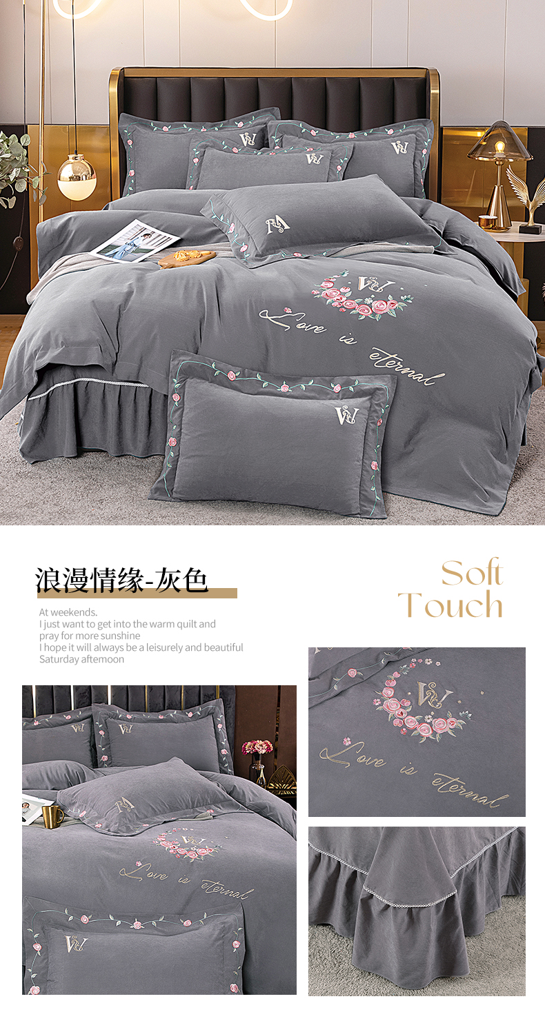 商品名称:伊而梦 2023新款锦棉宽边绣花四件套--浪漫情缘 浪漫情缘-灰色