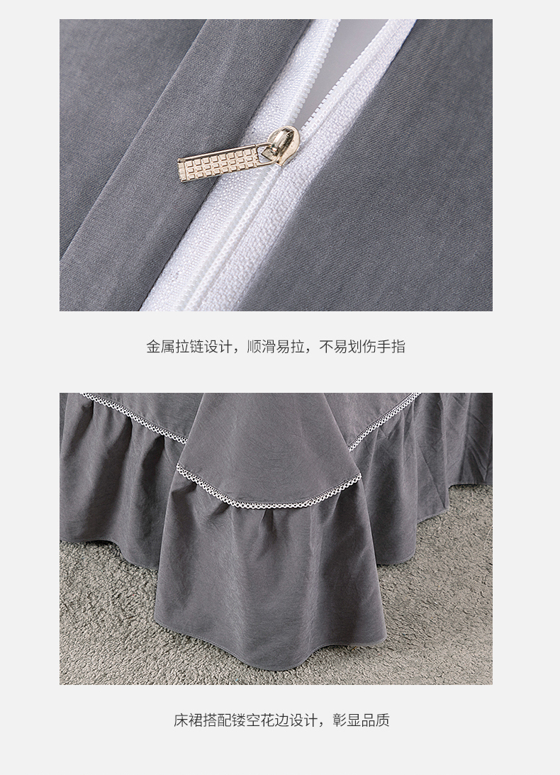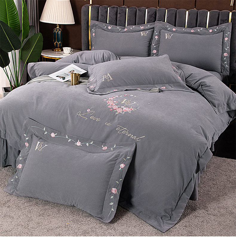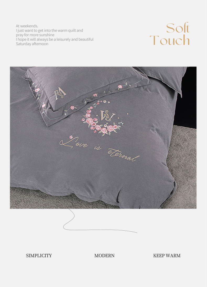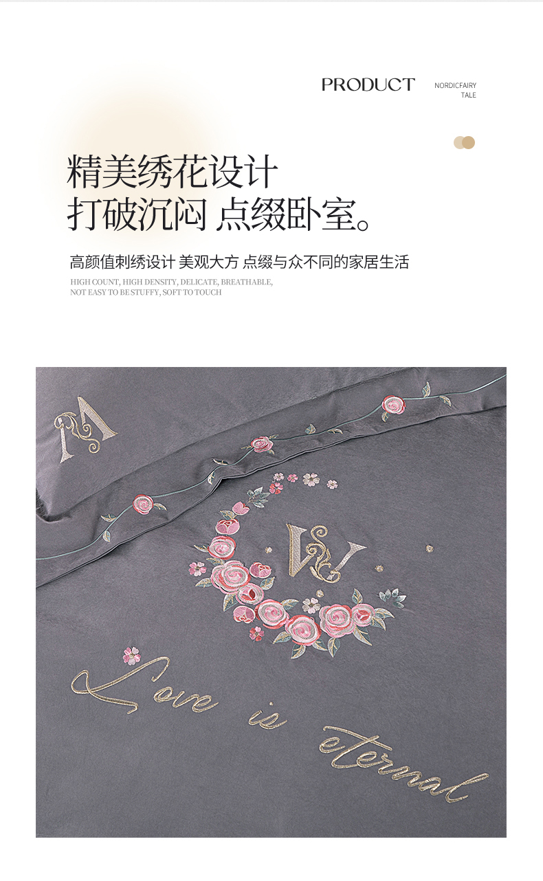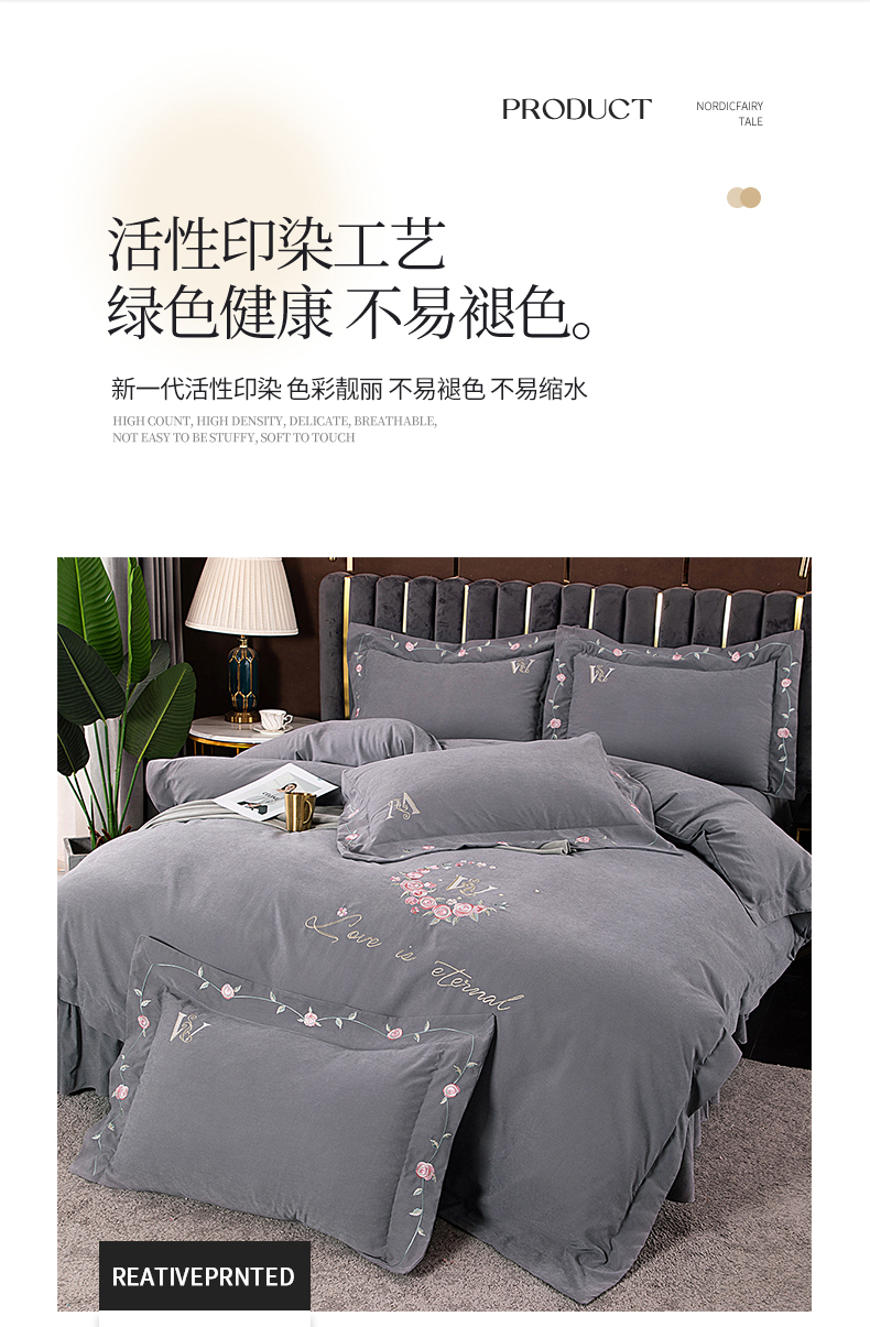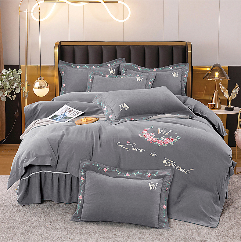 商品名称:伊而梦 2023新款锦棉宽边绣花四件套--浪漫情缘 浪漫情缘-灰色