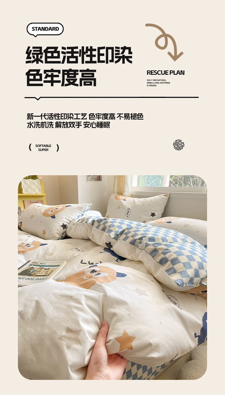 (总)雅居纺家纺 2022新款13070全棉印花四件套,波纹,多彩,简笔画,莓关系,奶油绿豹纹,倾心,数字