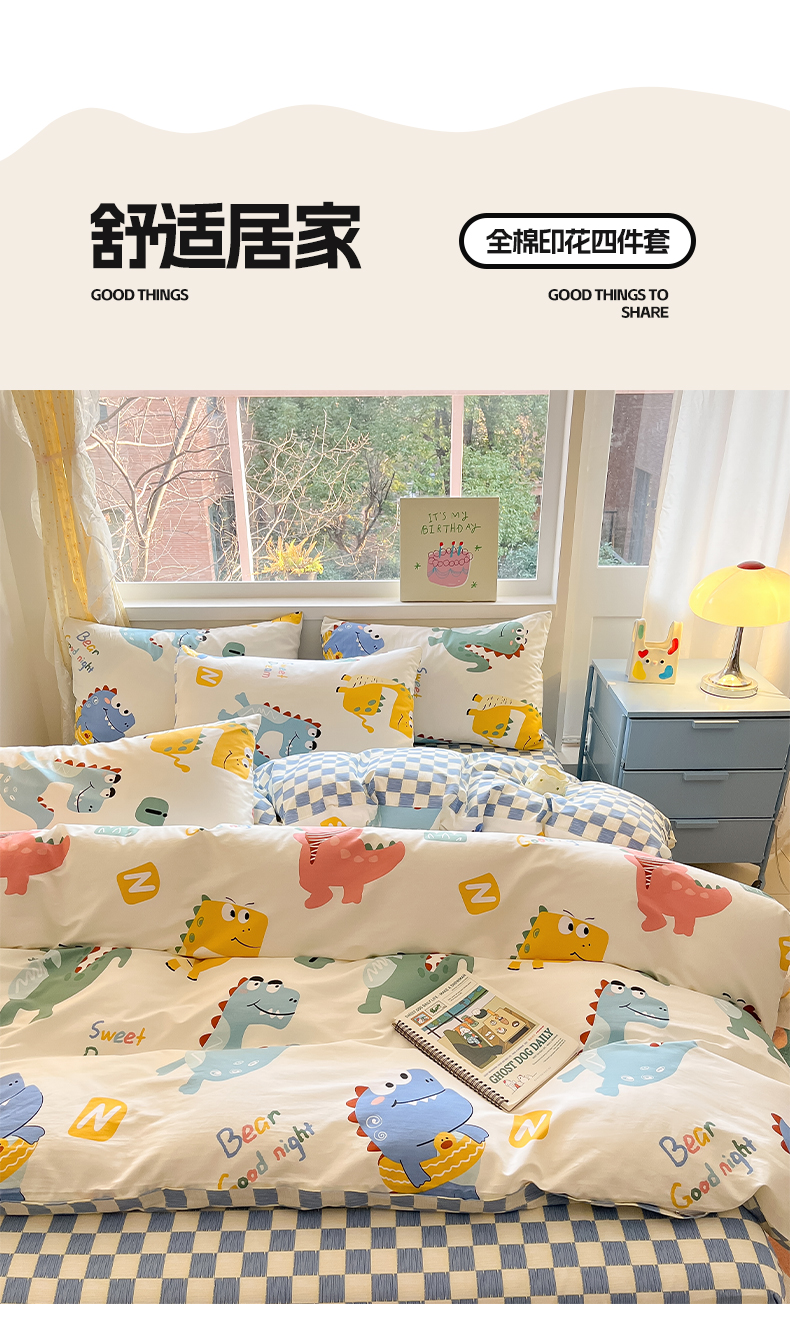 雅居纺 2024新款高密全棉13070印花四件套 恐龙家族