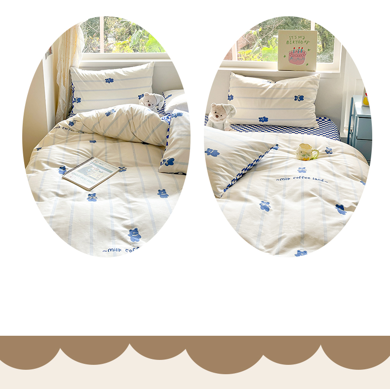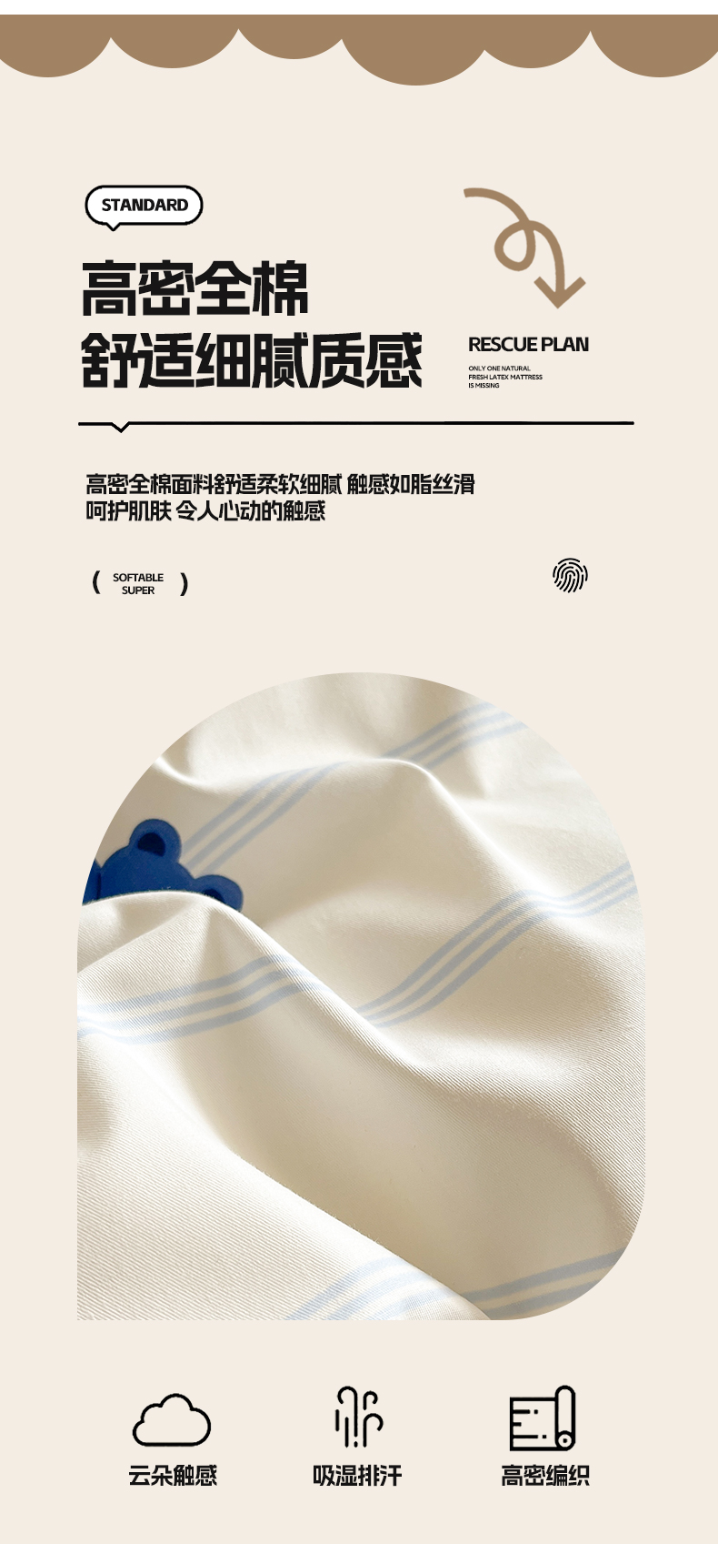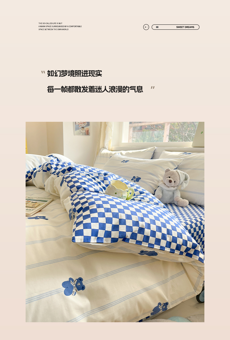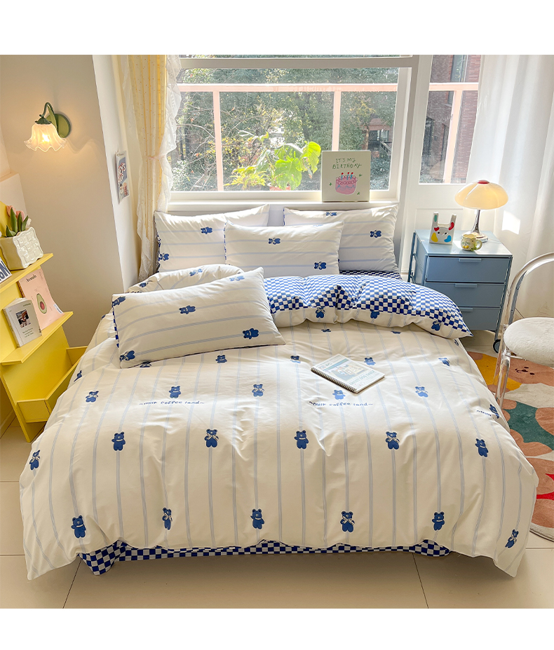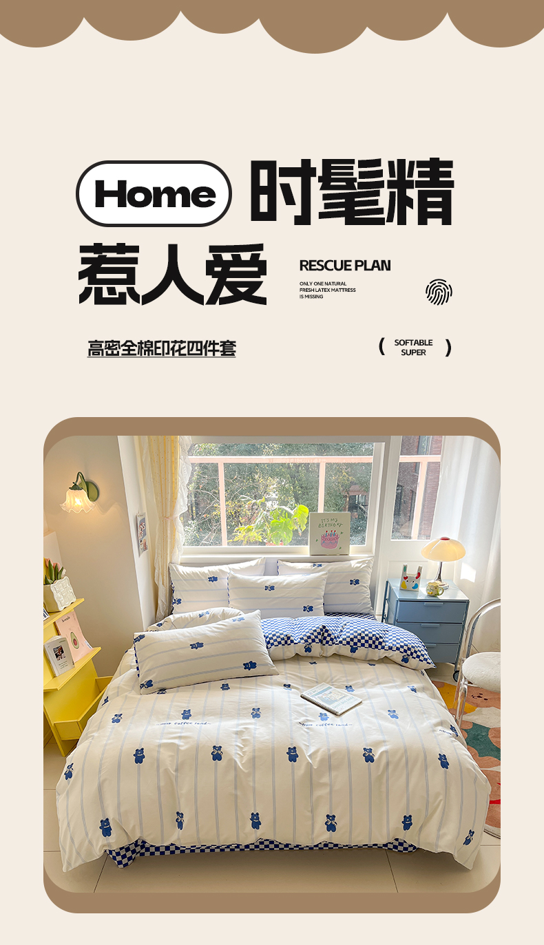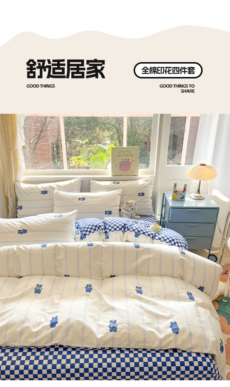雅居纺 2024新款高密全棉13070印花四件套 竖条小熊