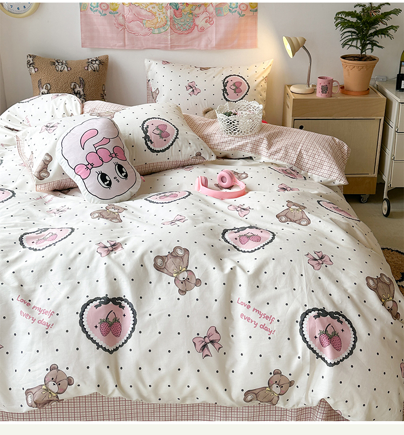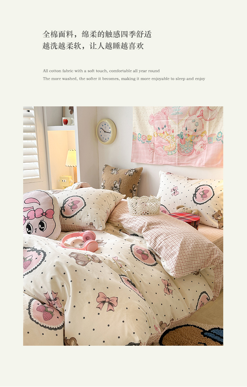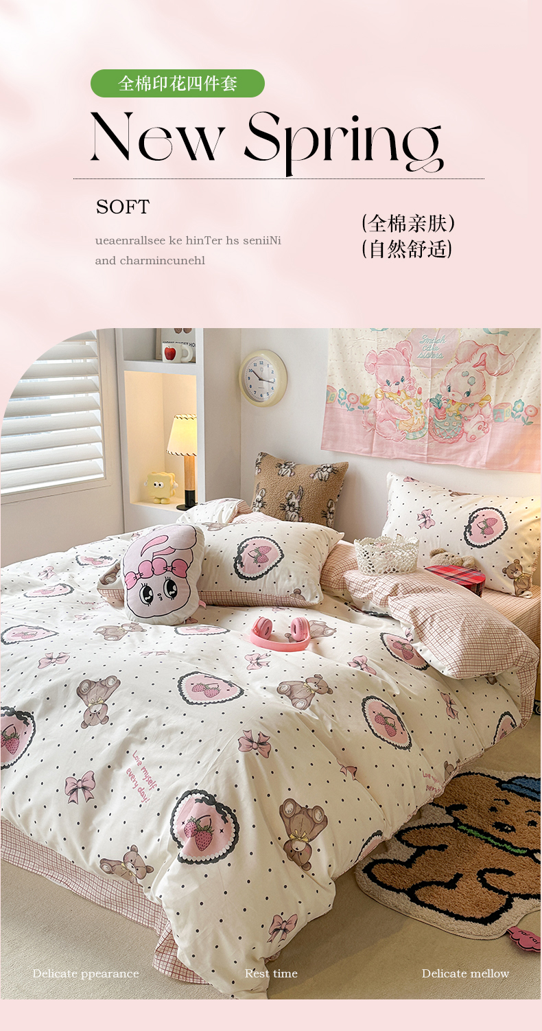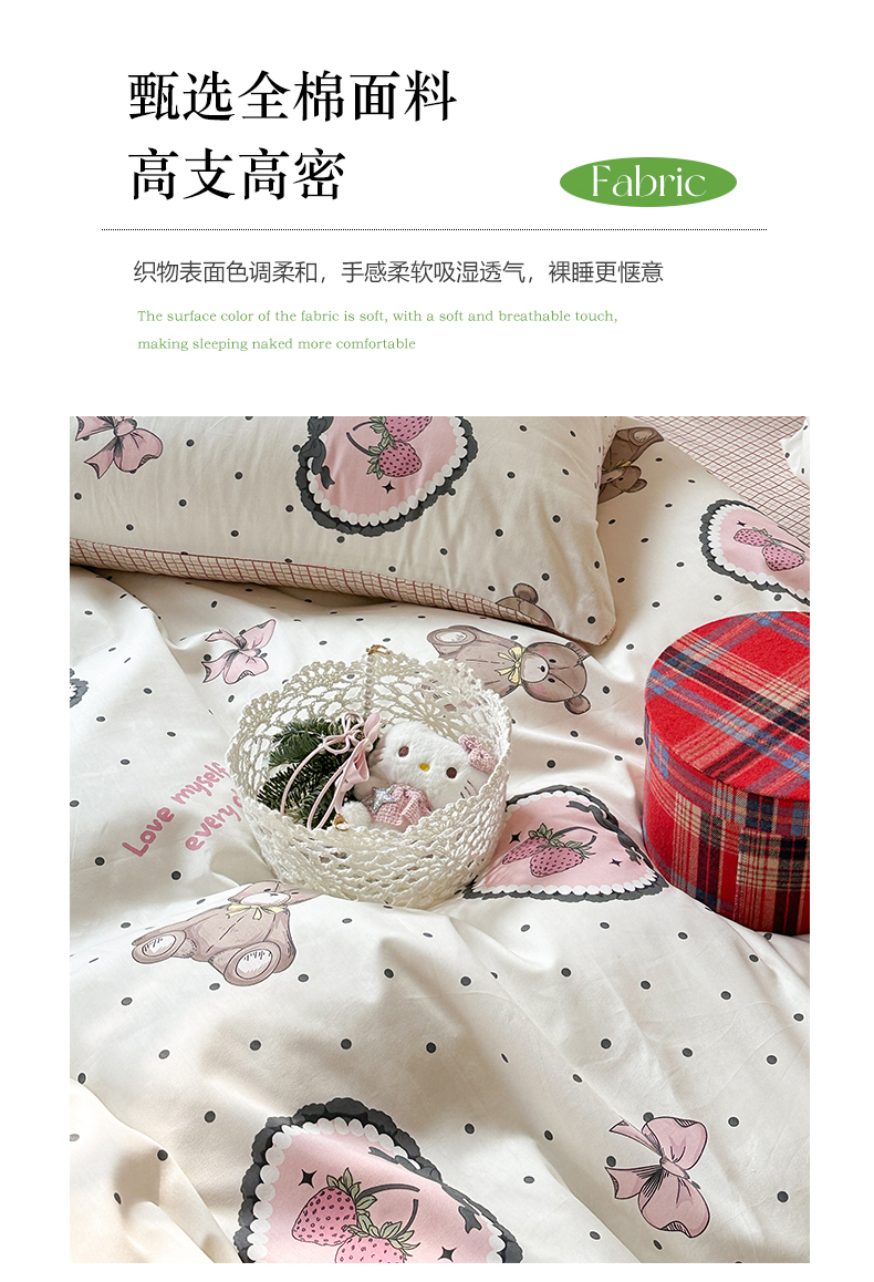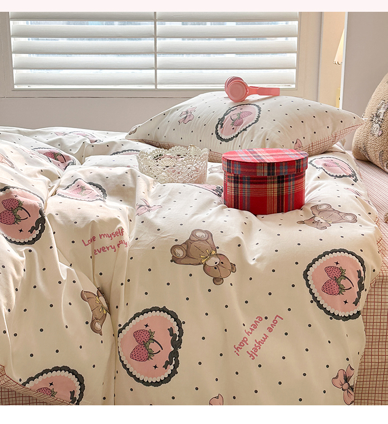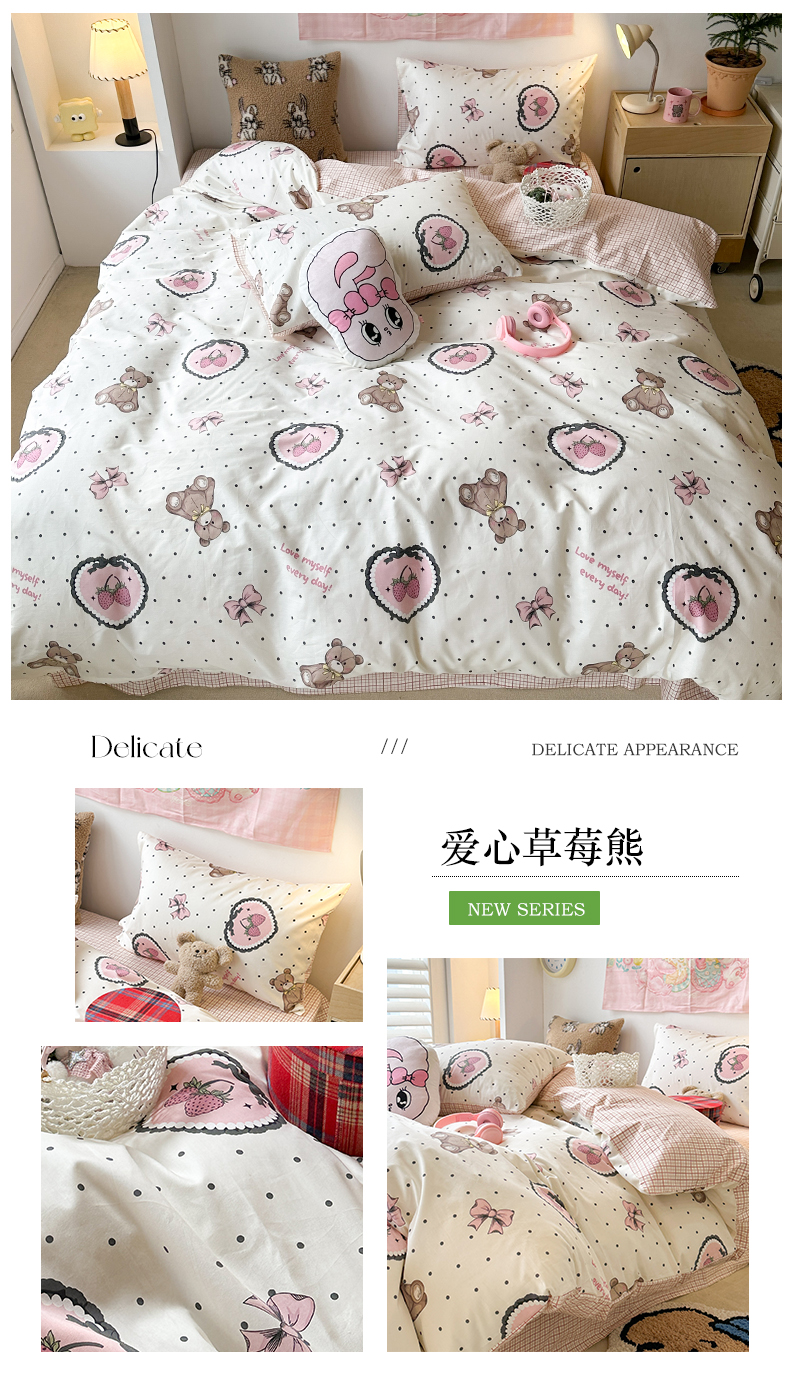 昔可家纺 2024开春新款全棉印花四件套 爱心草莓熊