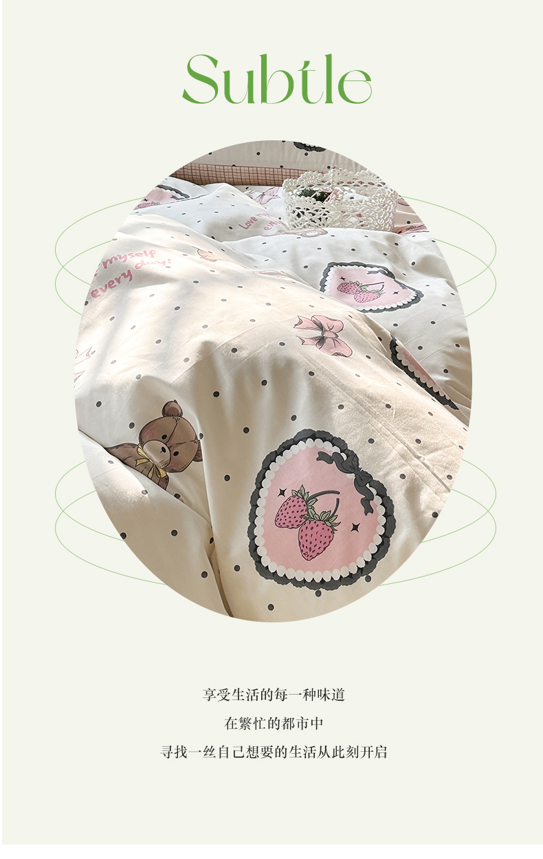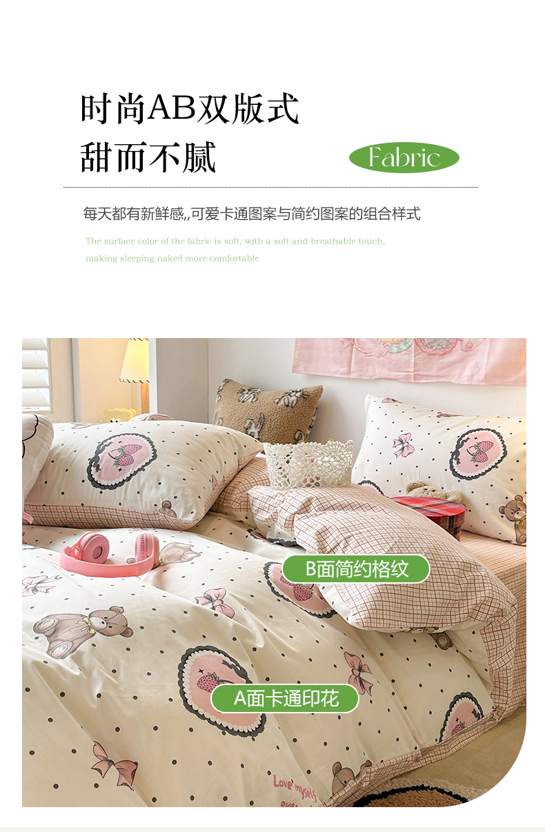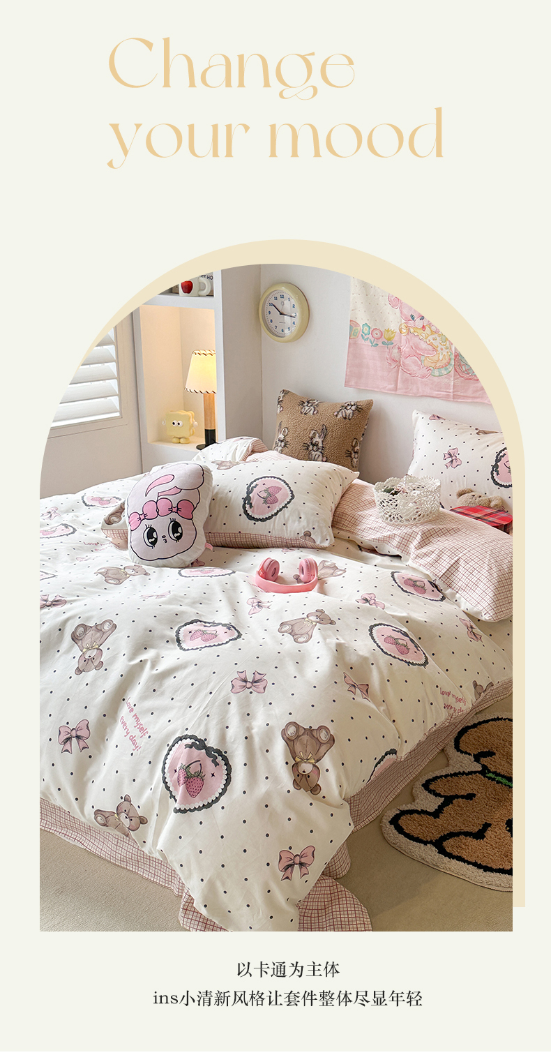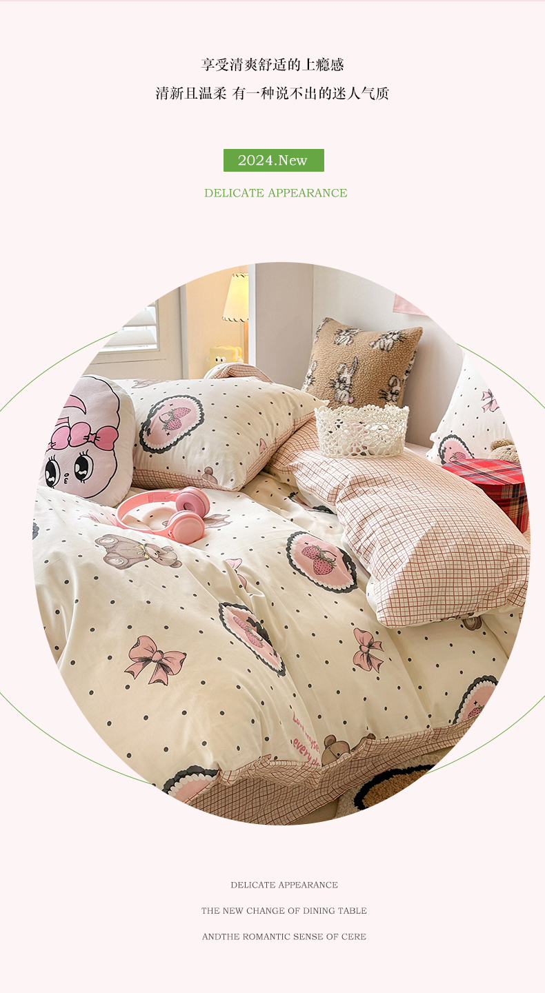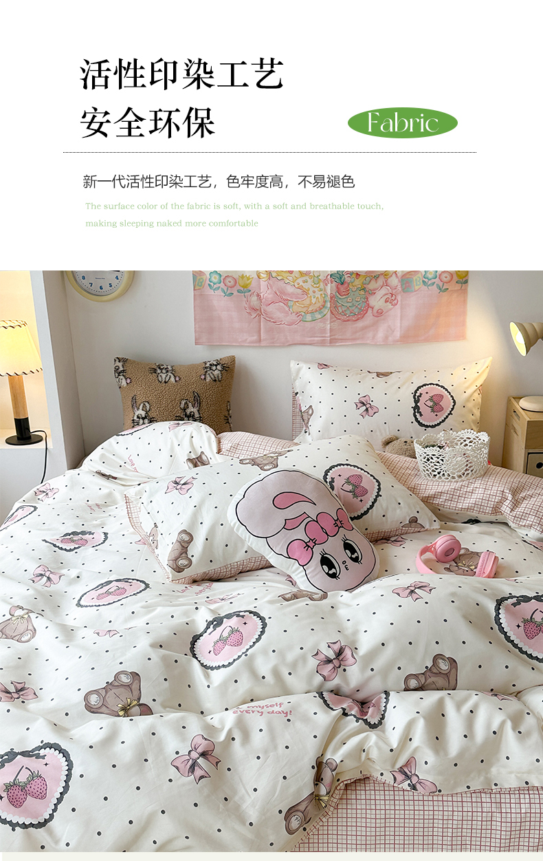 昔可家纺 2024开春新款全棉印花四件套 爱心草莓熊