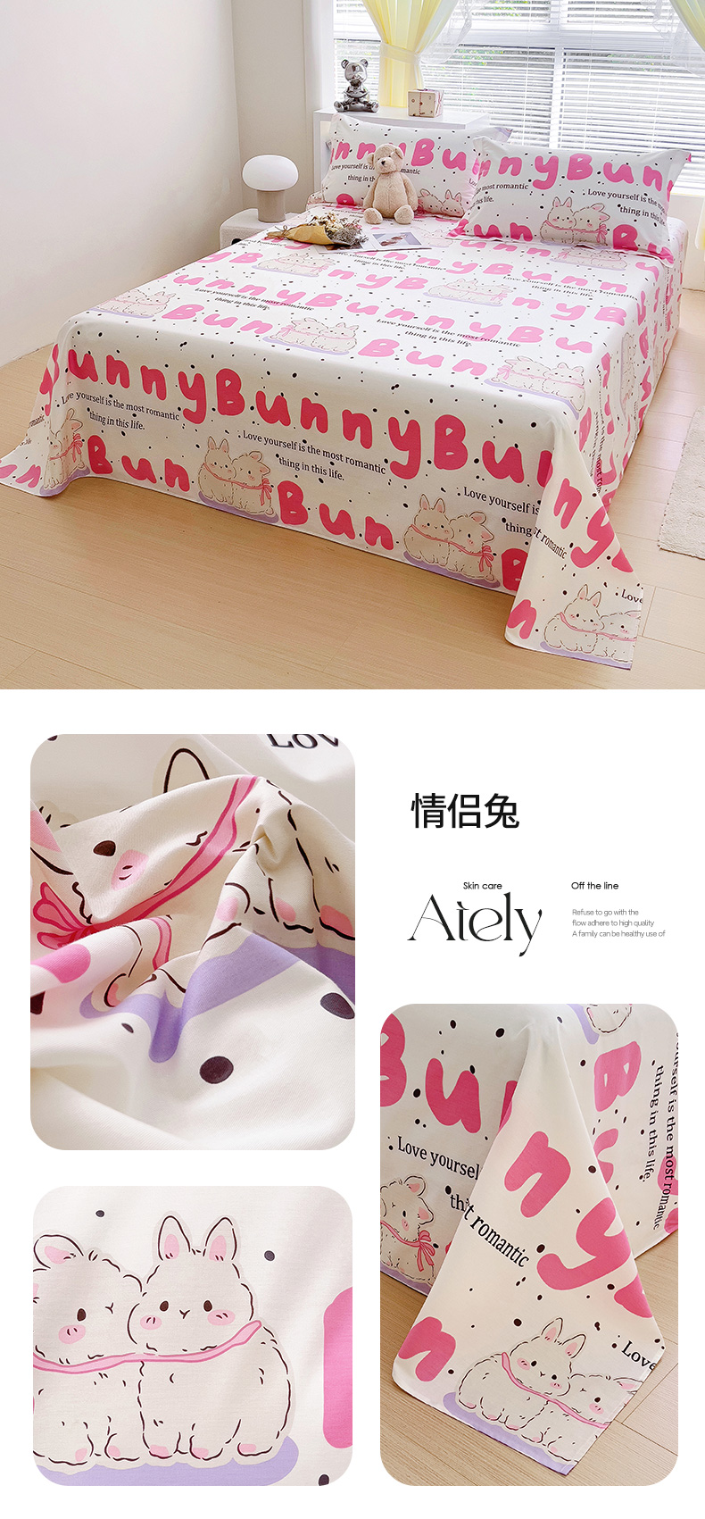 商品名称:锦罗绣 2024新款13372全棉印花单品床单 情侣兔