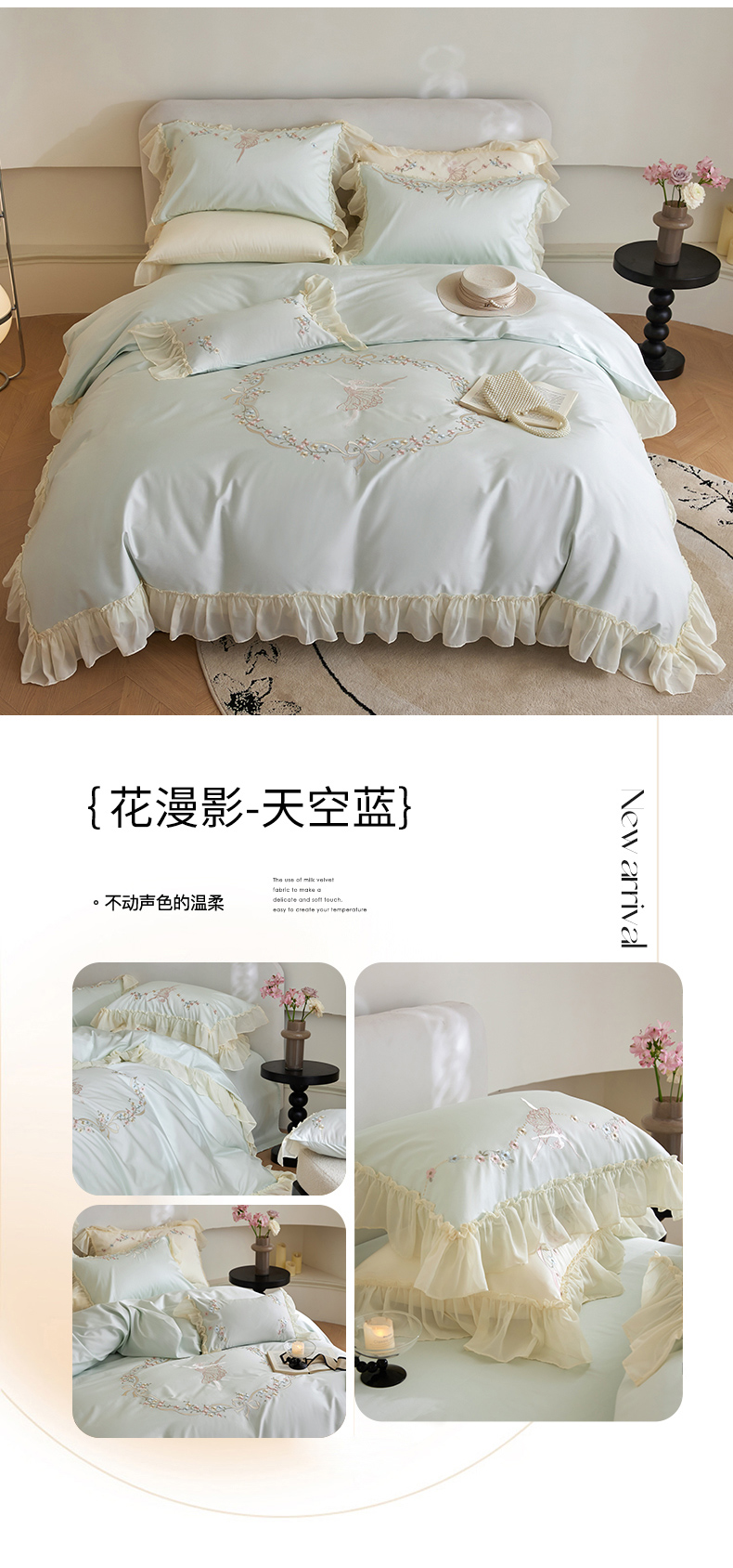 商品名称:嘉汀兰2024新款100S澳棉双股贡缎刺绣长绒棉六件套 天空蓝