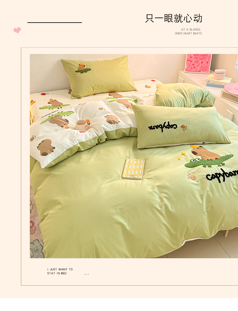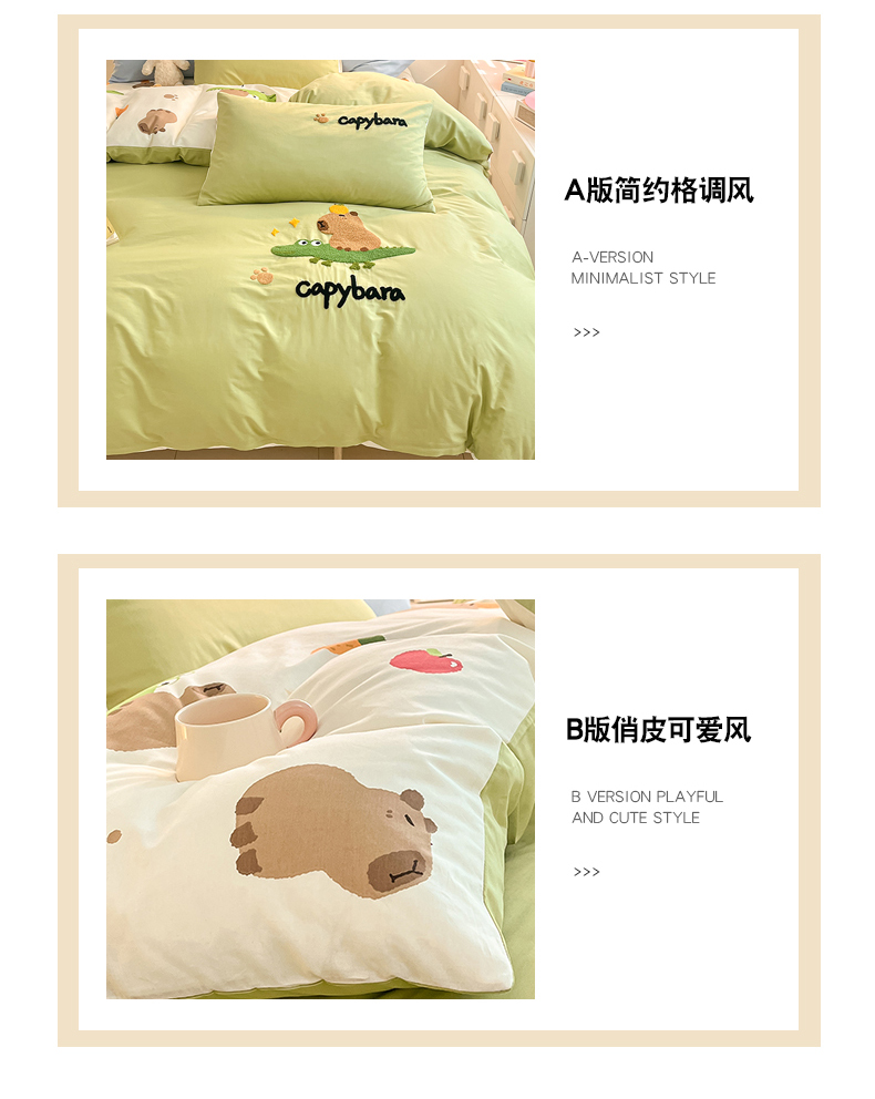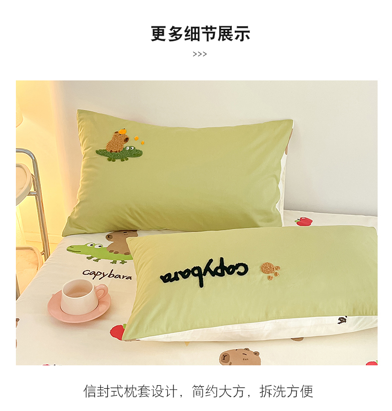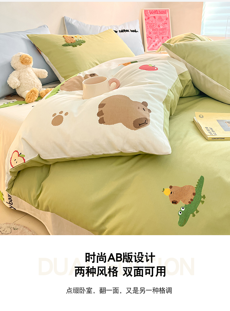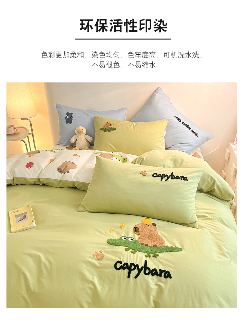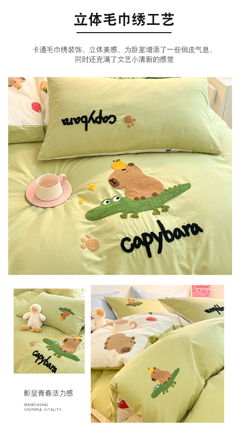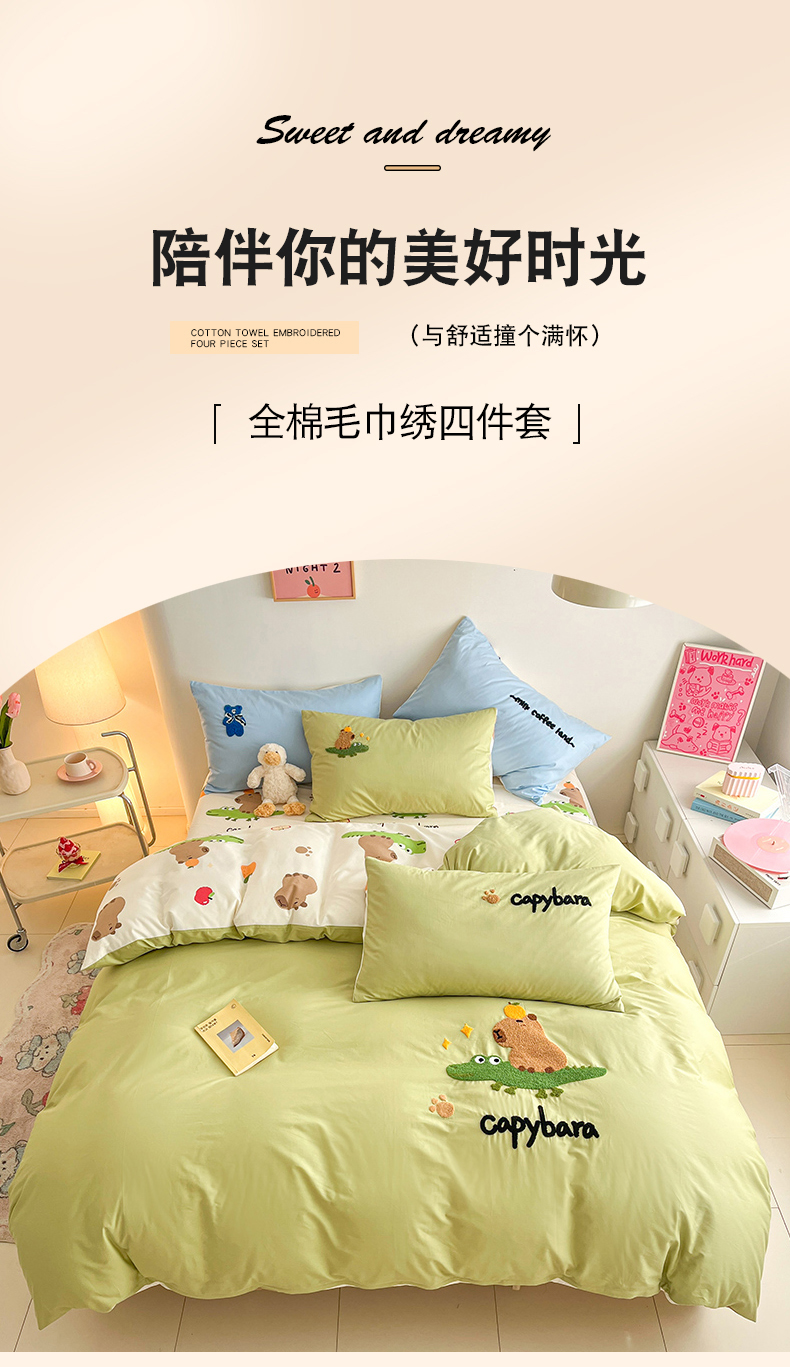 商品名称:金丝鸟家纺 2024新款全棉混搭毛巾绣四件套可爱卡通库洛米系列 绿色鳄鱼卡皮