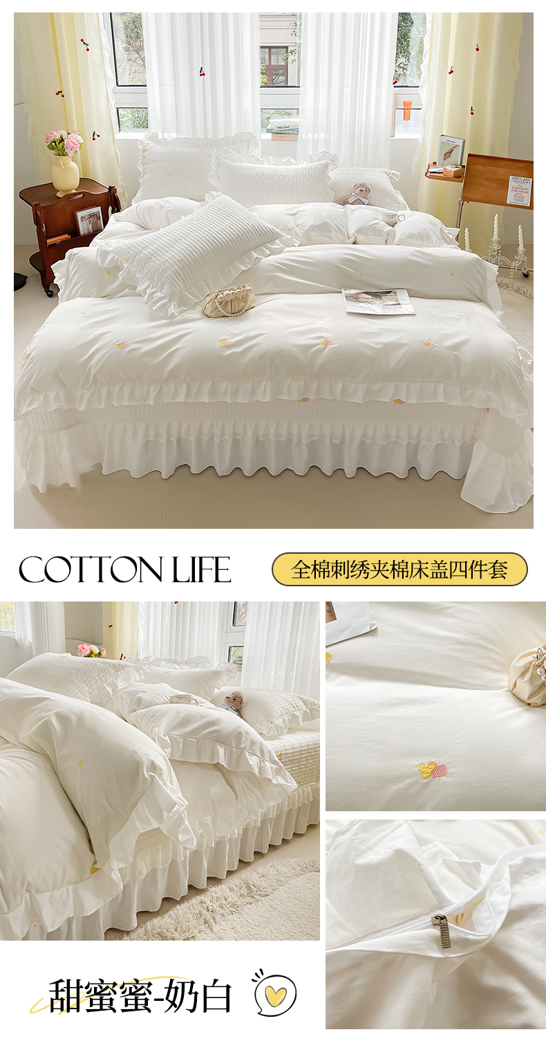 宜凡家纺 2024新款全棉夹棉绣花花边系列床盖四件套 甜蜜蜜-奶白