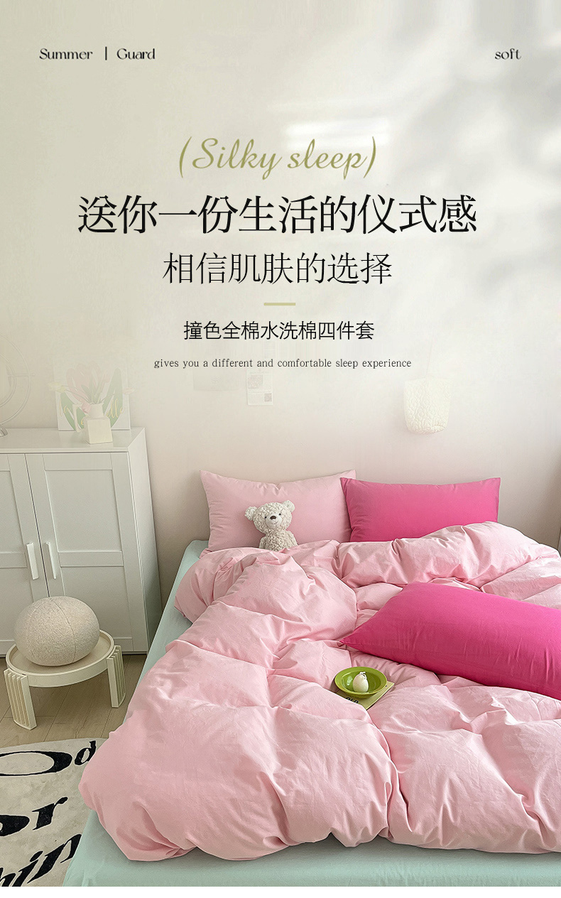 (总) 寐居 2023新款双拼全棉水洗棉纯色四件套,ins风-草绿色,ins风-湖绿色,ins风-裸粉色,ins风-迷雾蓝,ins风-奶油黄,ins风-柠檬黄,ins风-樱花粉,鹅黄+香芋紫,焦糖+卡其,军绿+焦糖,米黄+卡其,米黄+深粉,奶油玉+鹅黄,深粉+湖蓝,深蓝+焦糖,藏青+浅灰,绿+牛油果绿,米黄+浅蓝,抹茶绿+橡木黄,奶油玉+橄榄绿,奶油玉+香芋紫,浅豆沙+浅灰,深蓝+灰