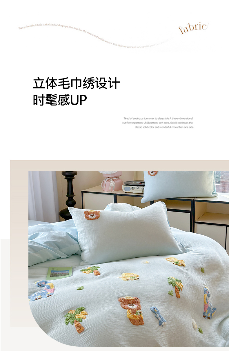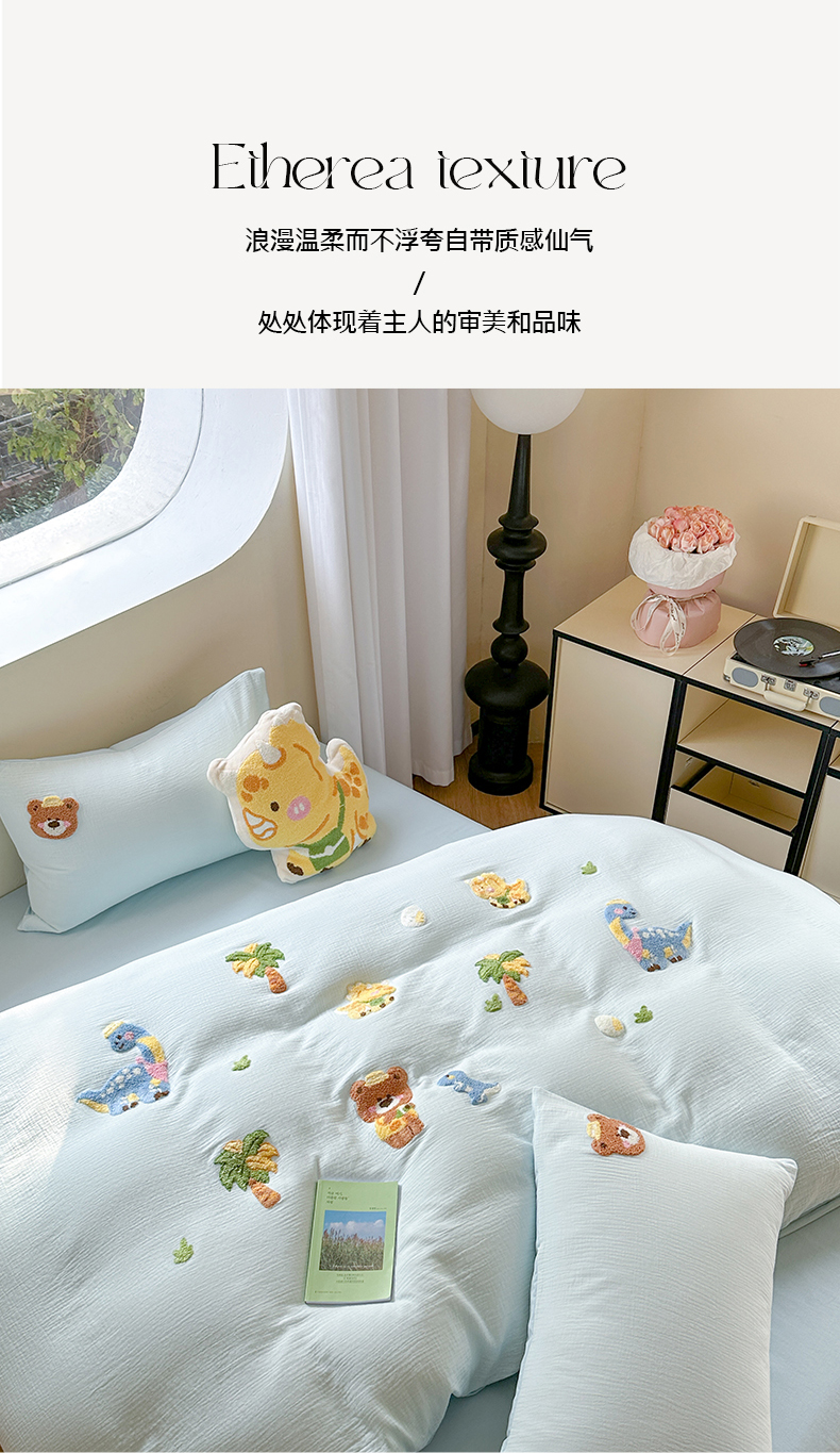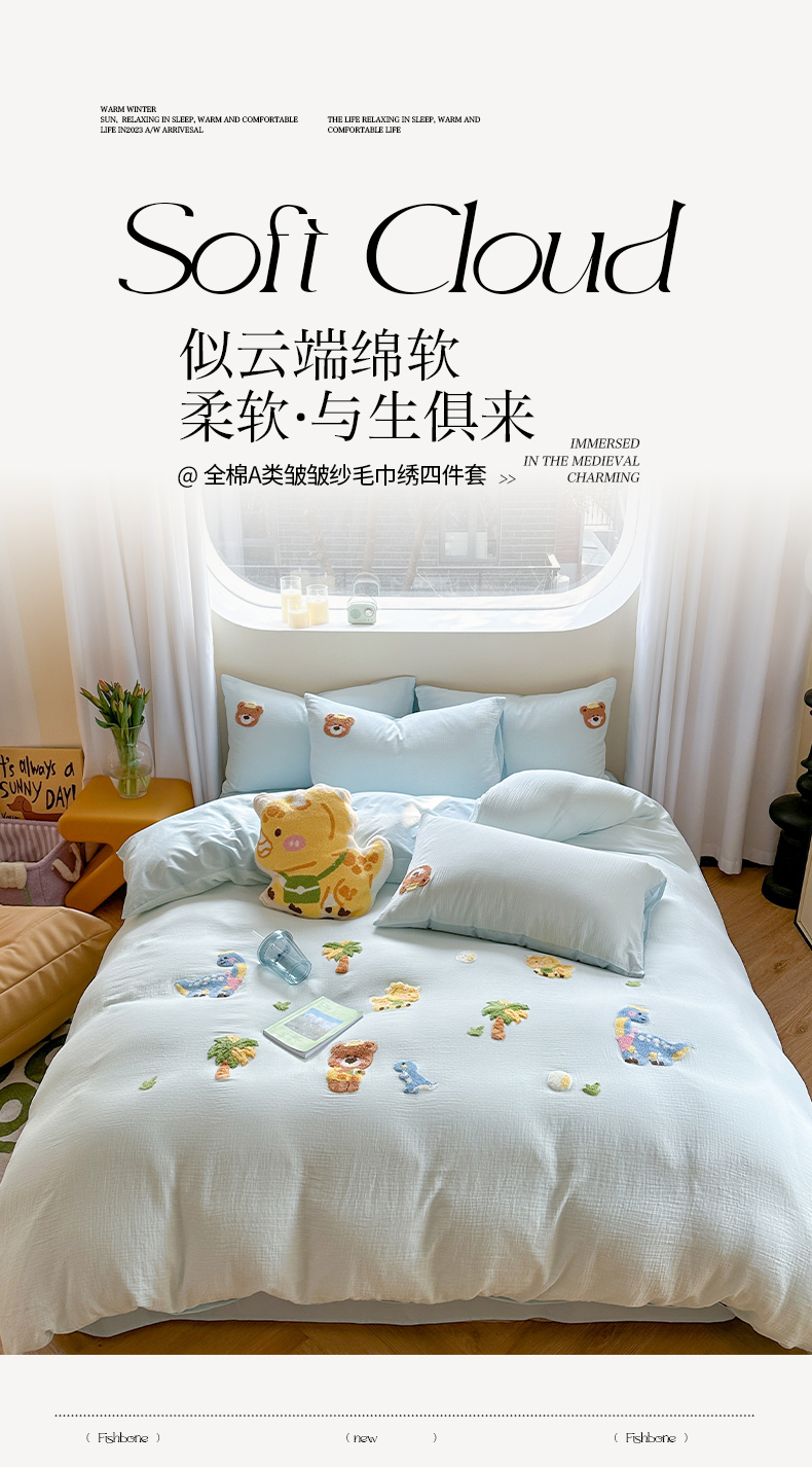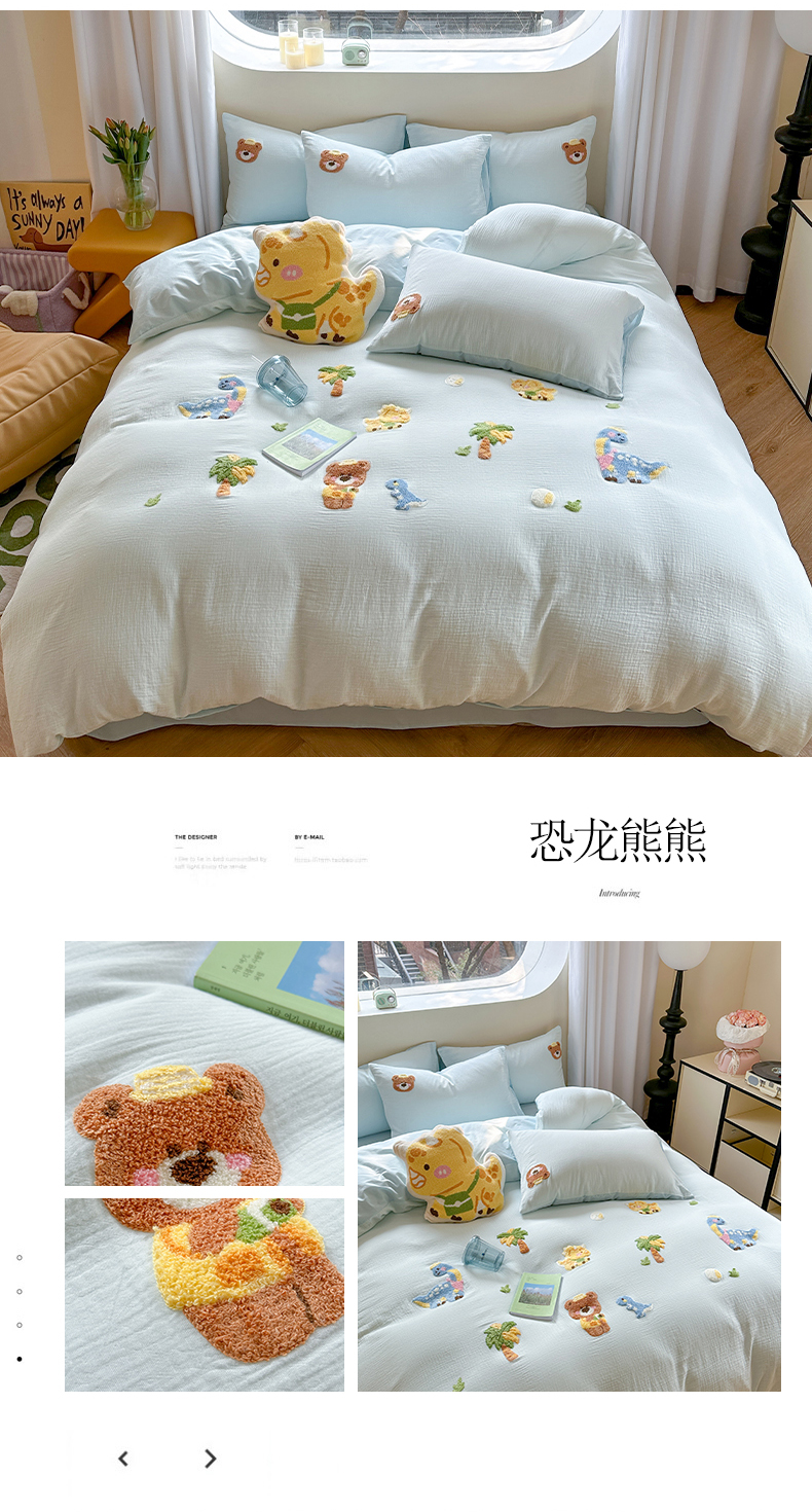 商品名称:眠屿 2024全棉A类皱皱纱毛巾绣四件套 恐龙熊熊