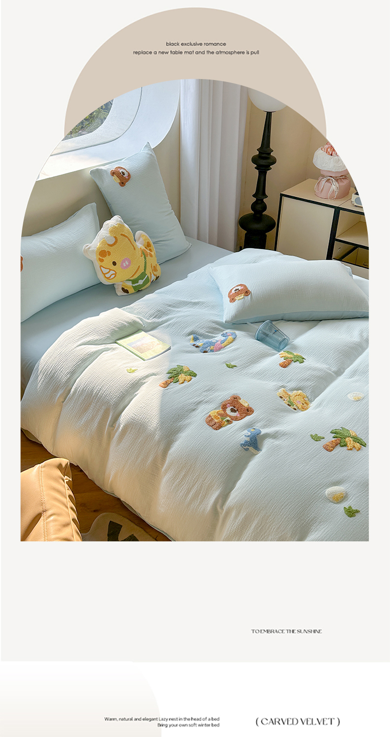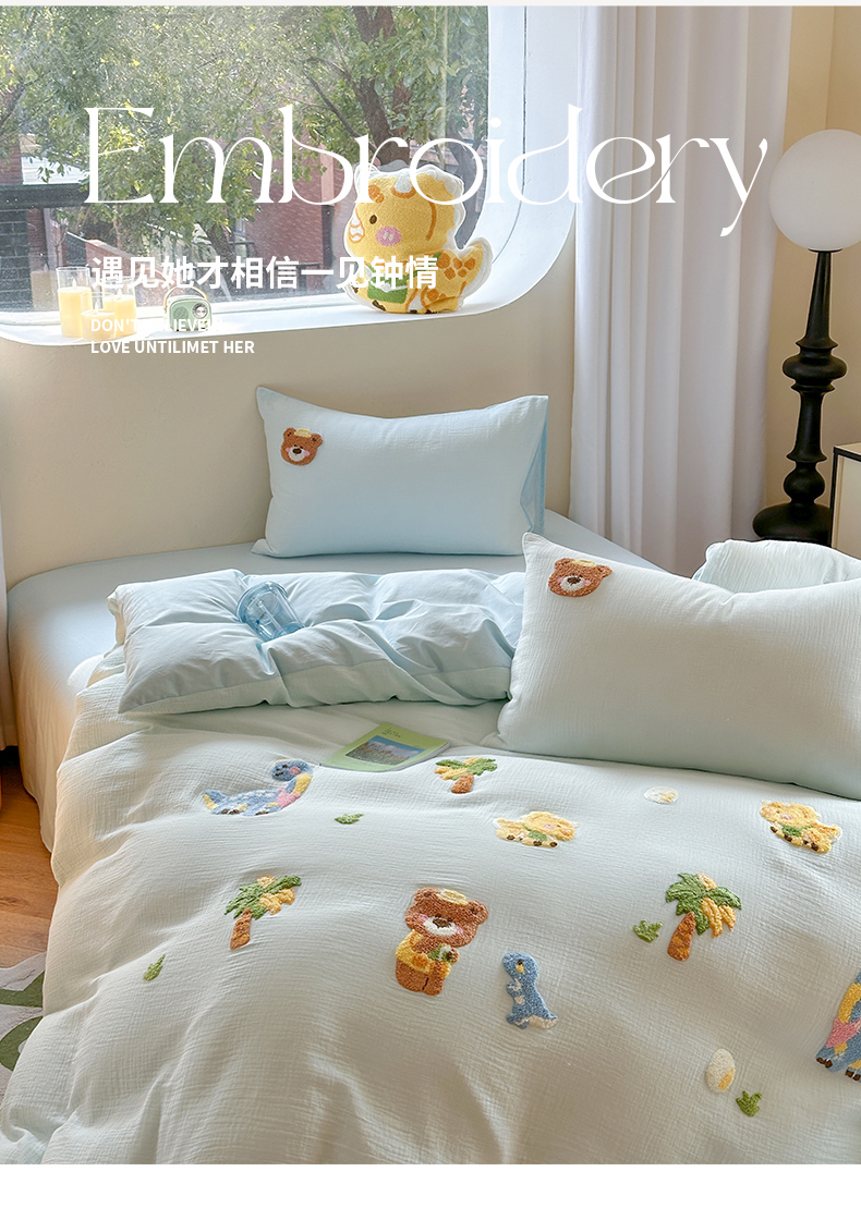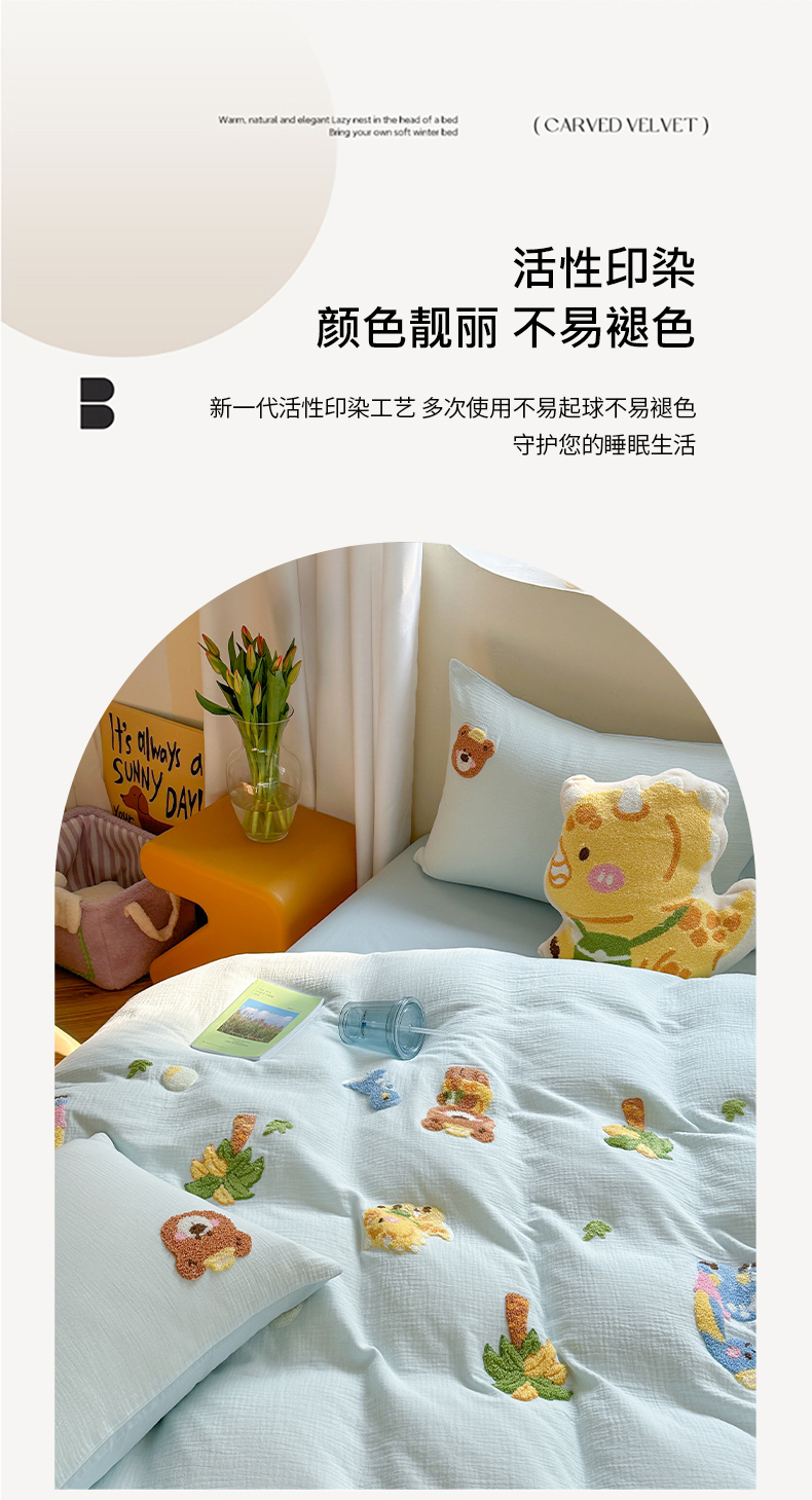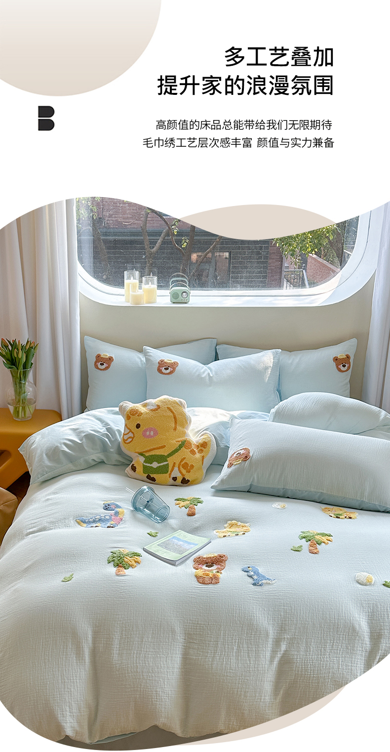 商品名称:眠屿 2024全棉A类皱皱纱毛巾绣四件套 恐龙熊熊