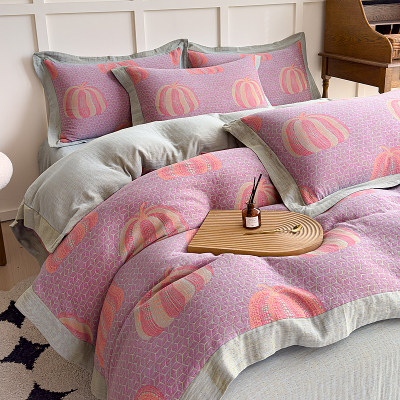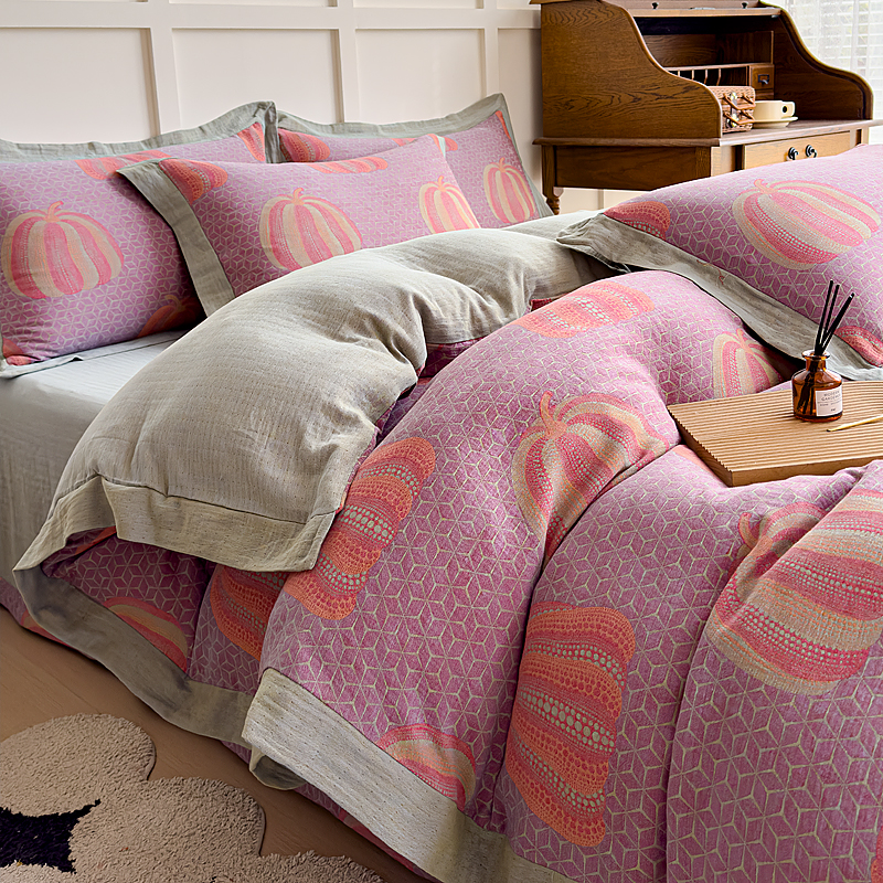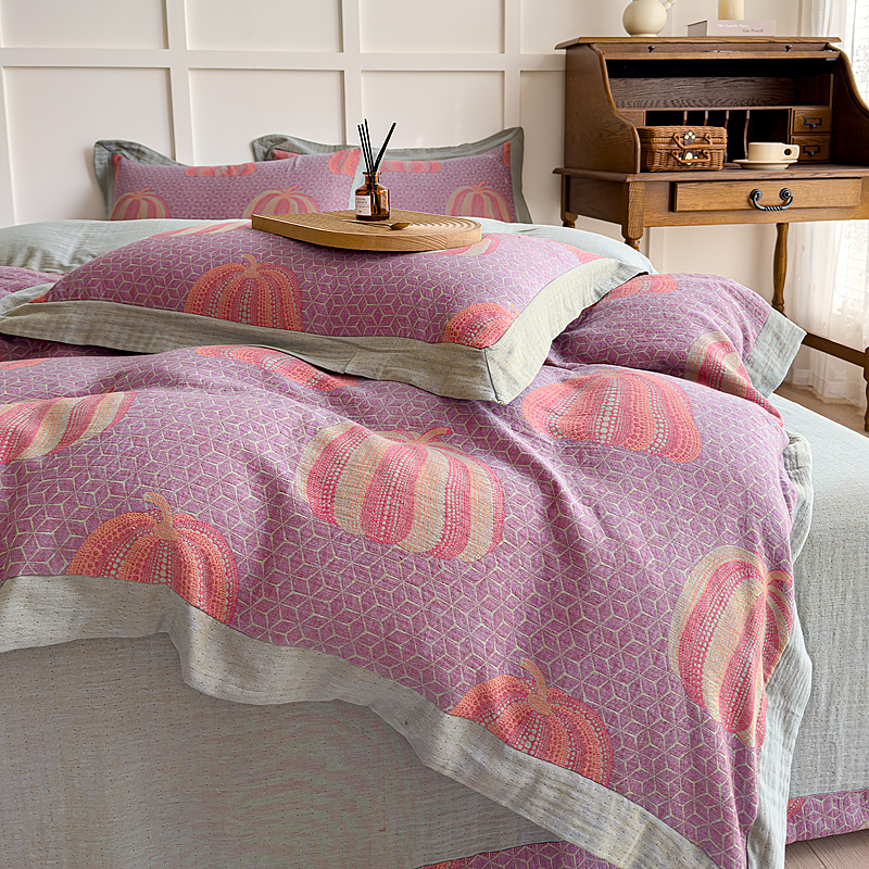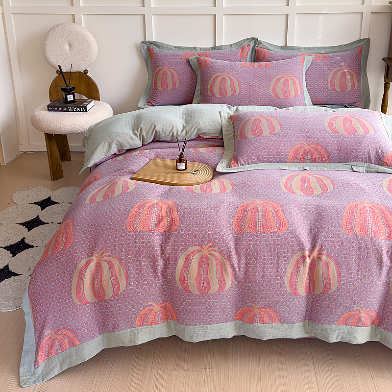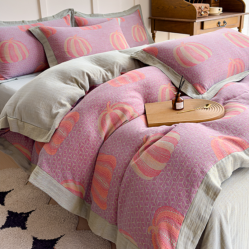 商品名称:小欢喜 2024新款全棉A类色织双层纱大提花四件套-宽边款 波点南瓜-紫