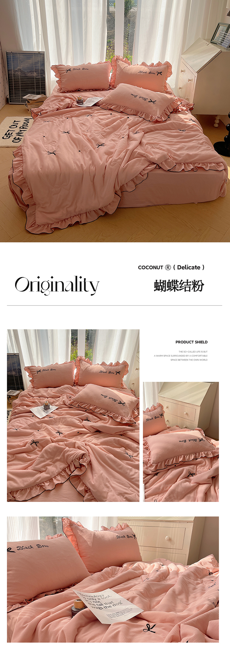 当前位置: 91家纺网 > 商品网购 > 床品套件 > 四件套 > 化纤普通四件套 > 顾里家纺 新款花边少女刺绣华夫格夏被四件套 蝴蝶结粉