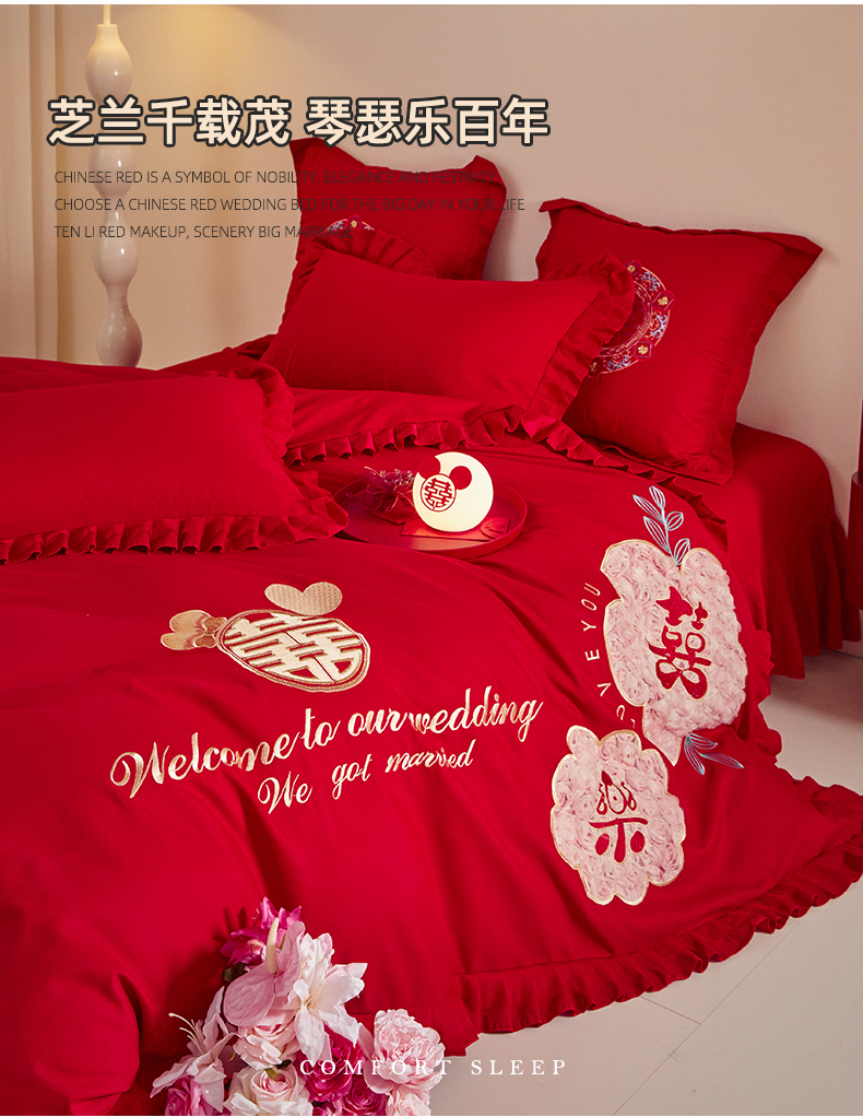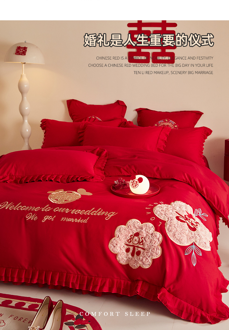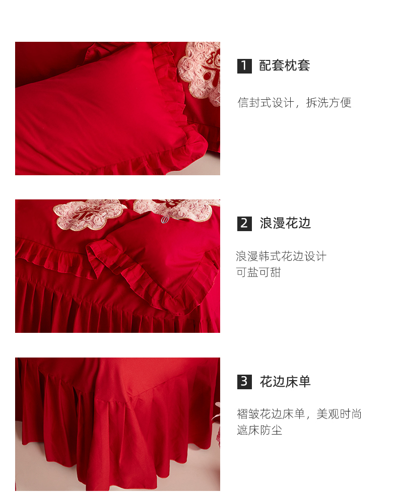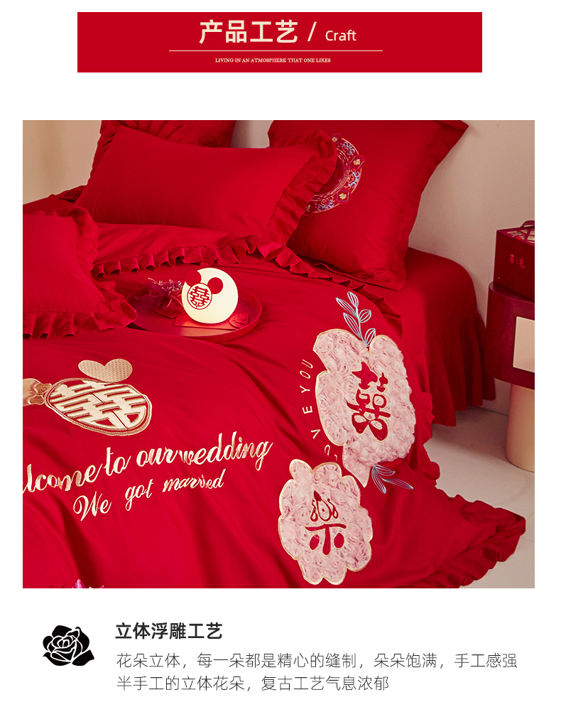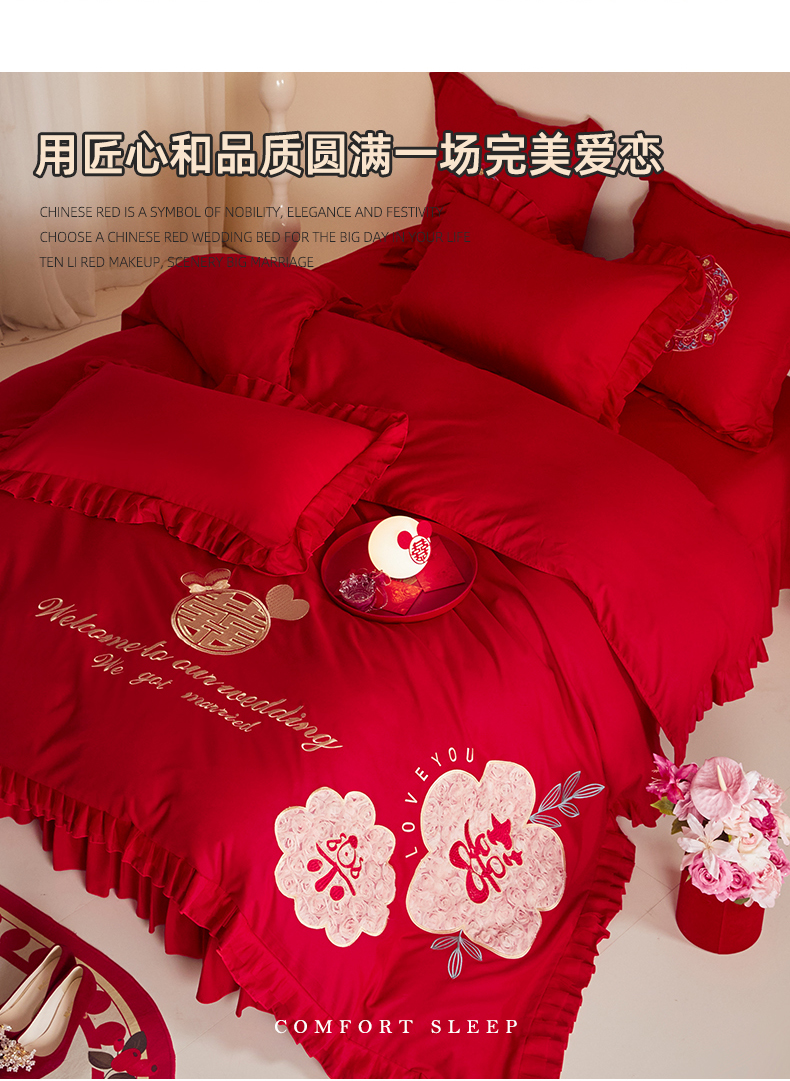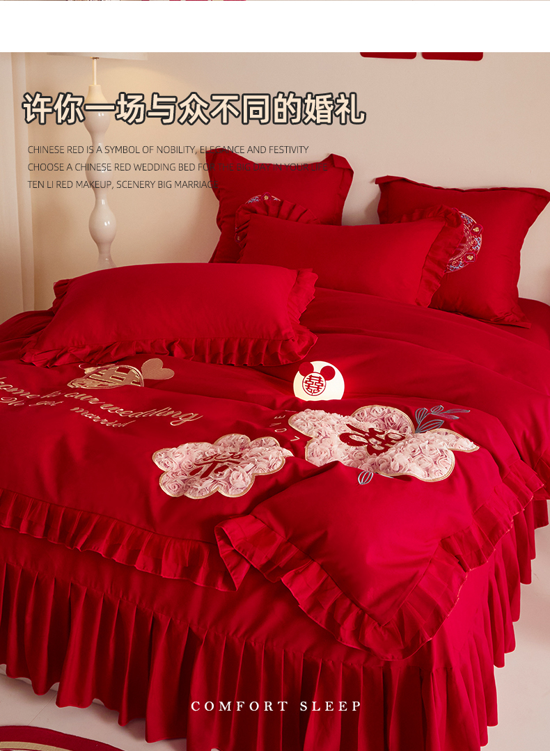 当前位置: 91家纺网 > 商品网购 > 床品套件 > 四件套 > 婚庆四件套 > 玉雅家纺 2025新款磨毛时尚浮雕花边款床裙婚庆四件套 浮雕花边款-幸福喜乐