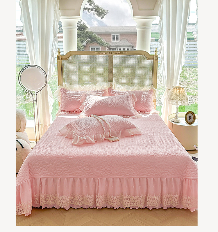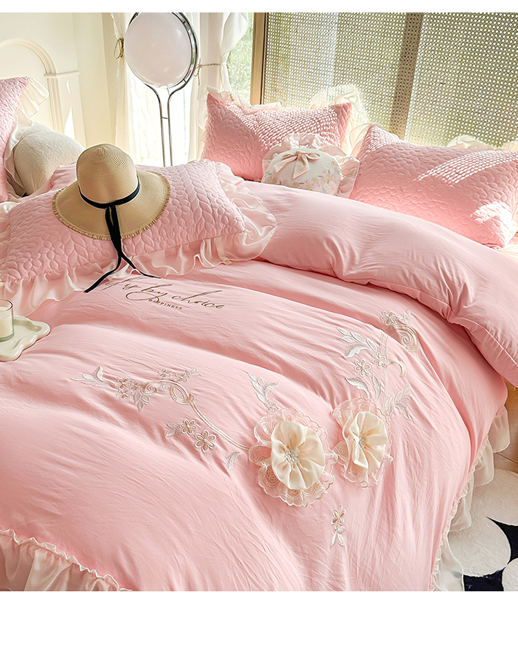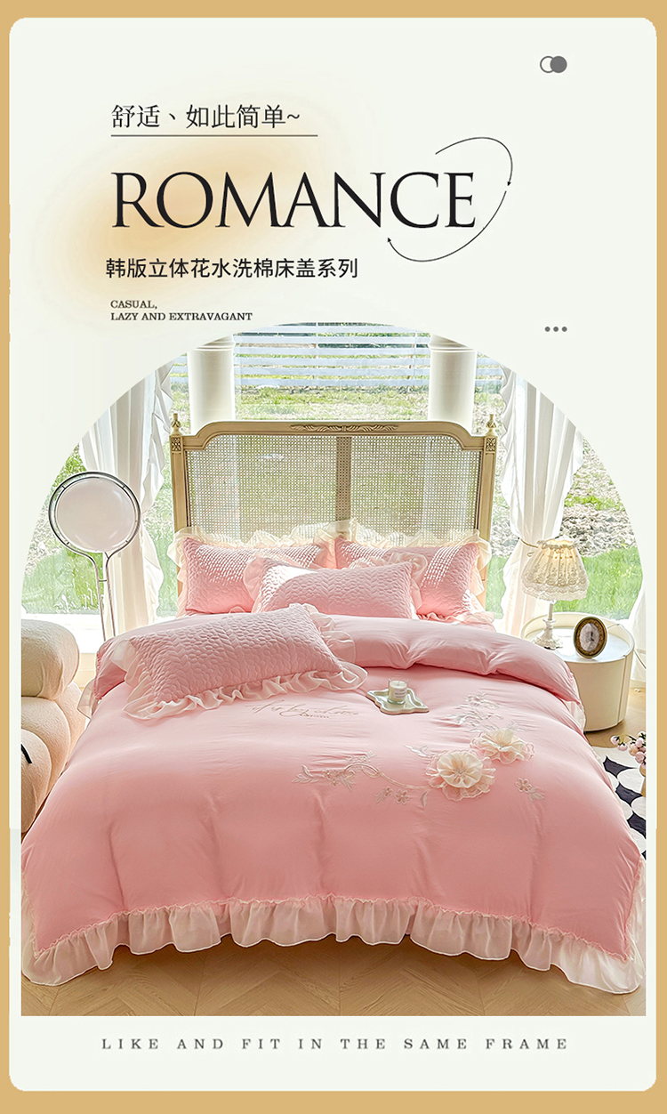 2025韩版法式公主风水洗棉立体花绣花床盖款四件套蕾丝床盖款三件套