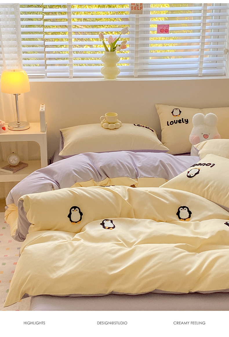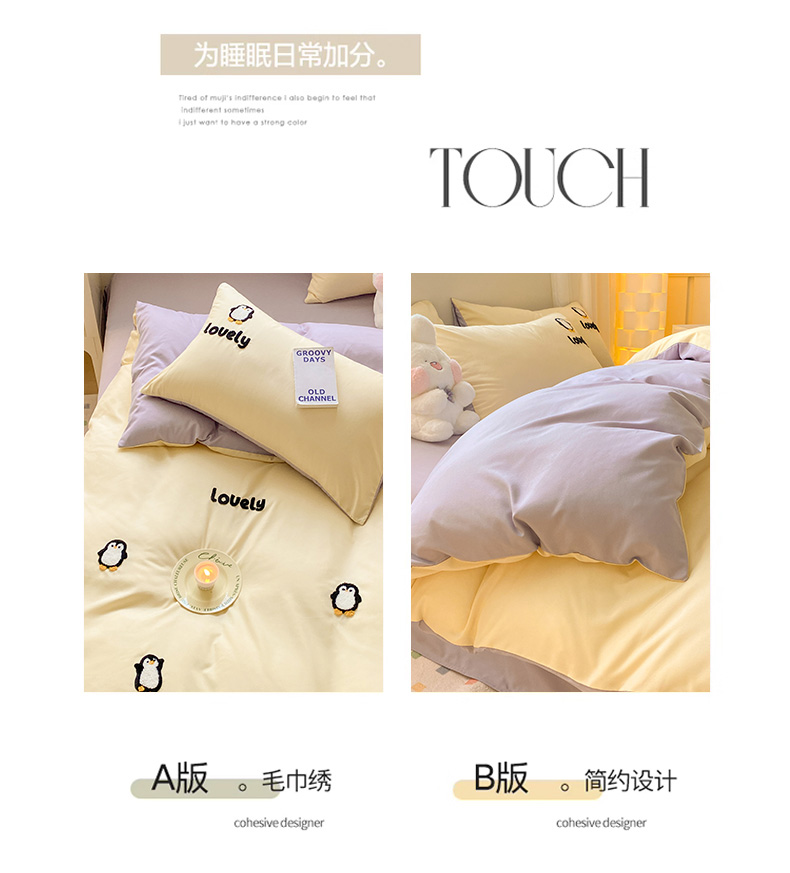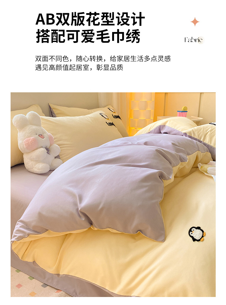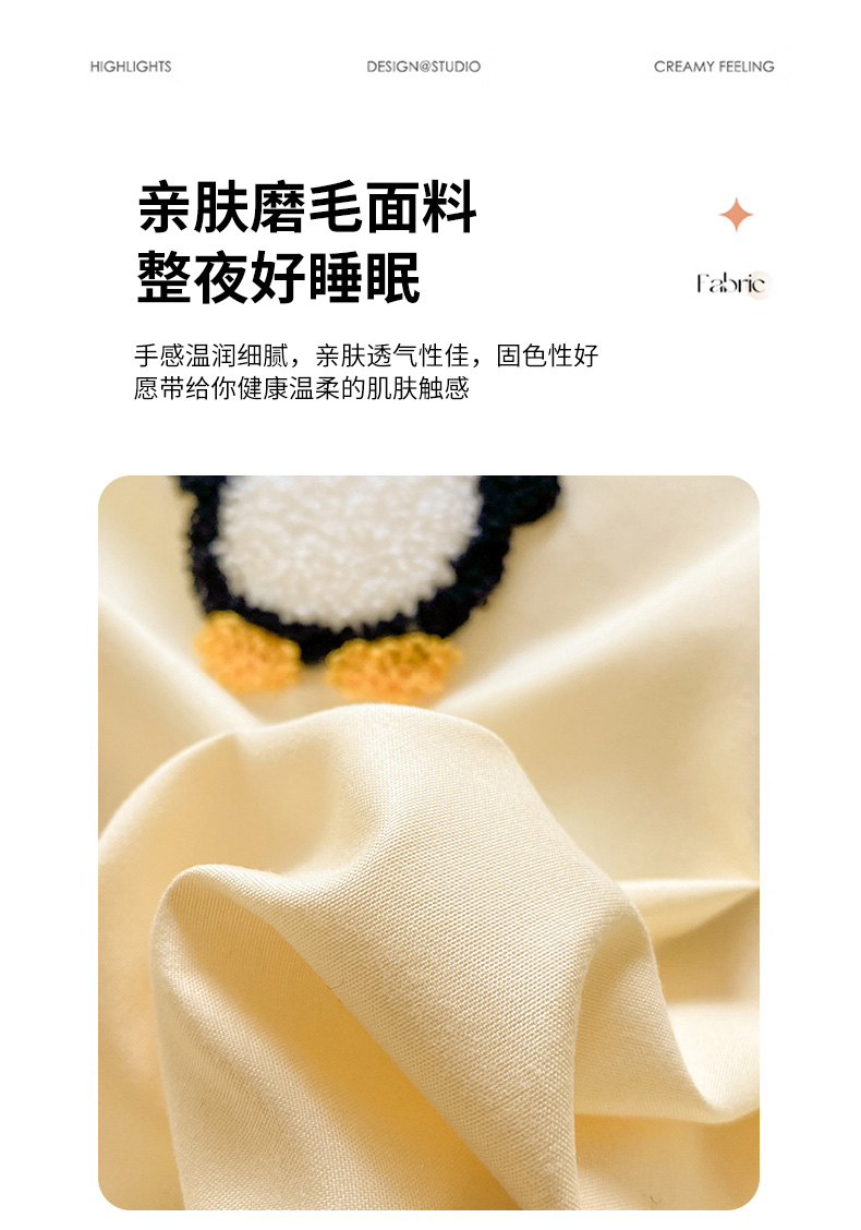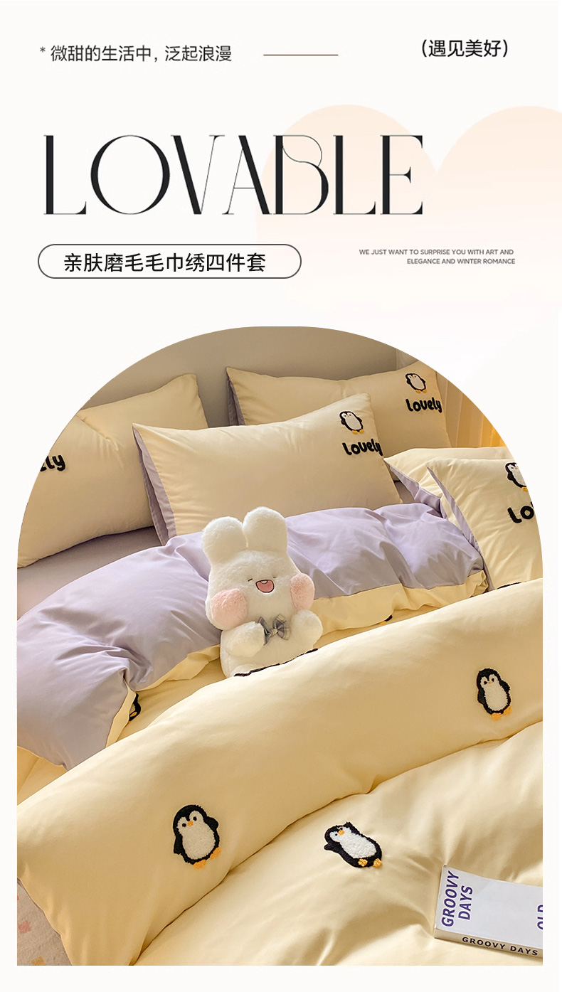 当前位置: 91家纺网 > 商品网购 > 床品套件 > 四件套 > 毛巾绣四件套 > 眠帛 2024新款亲肤棉卡通毛巾绣四件套 企鹅蛋-奶黄浅紫