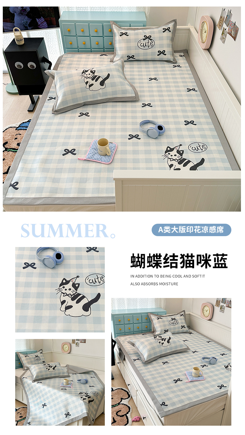 昔可家纺 2024新款A类900D大版冰丝席 蝴蝶结猫咪蓝