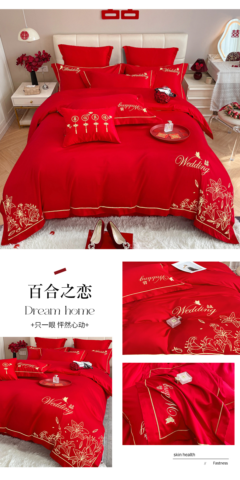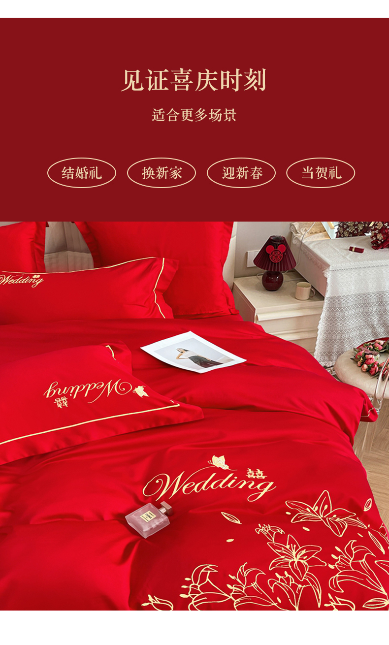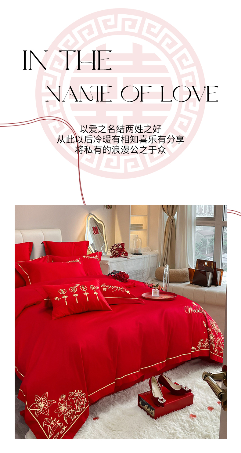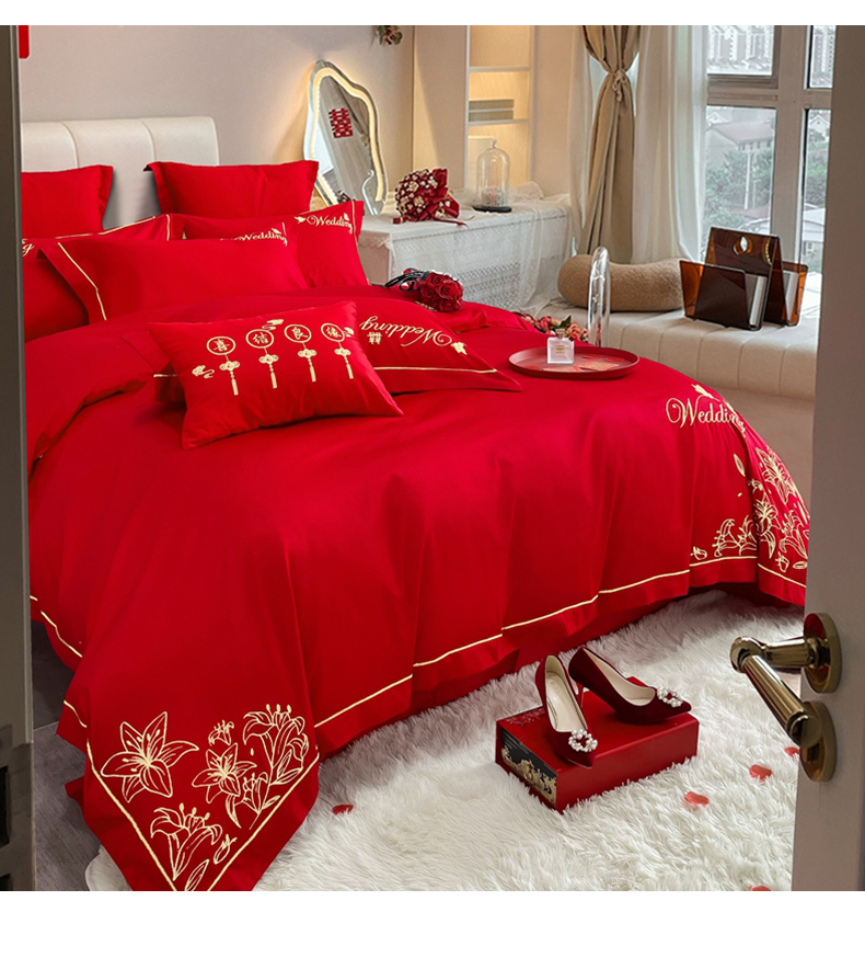 当前位置: 91家纺网 > 商品网购 > 床品套件 > 四件套 > 婚庆四件套 > 卓缦家纺 2024新款婚庆加厚亲肤棉刺绣套件 百合之恋