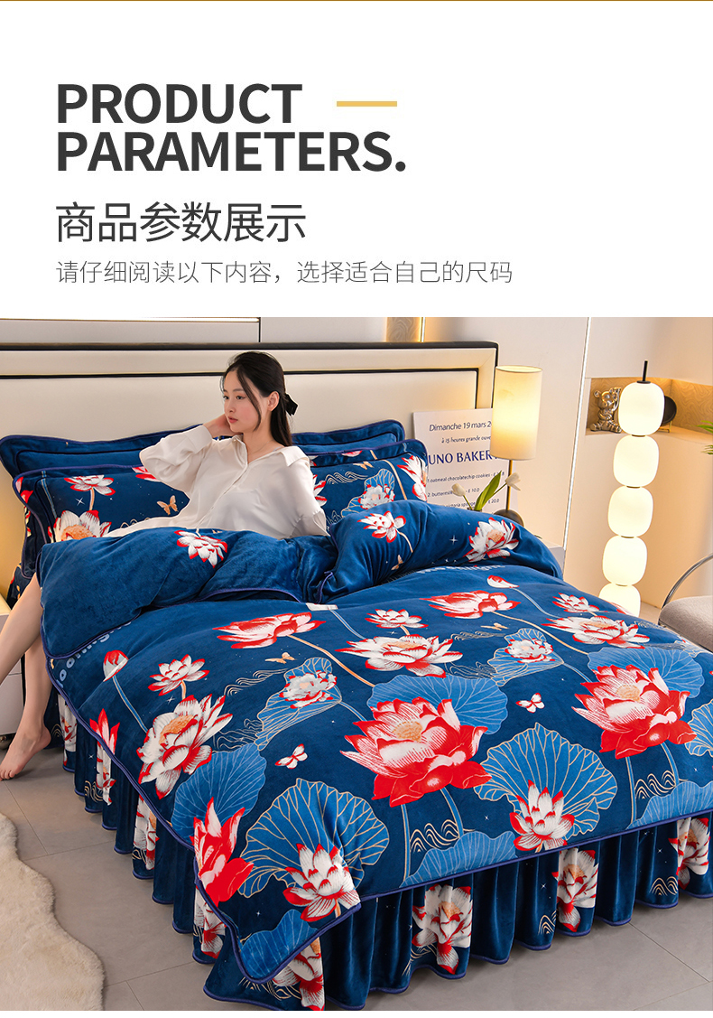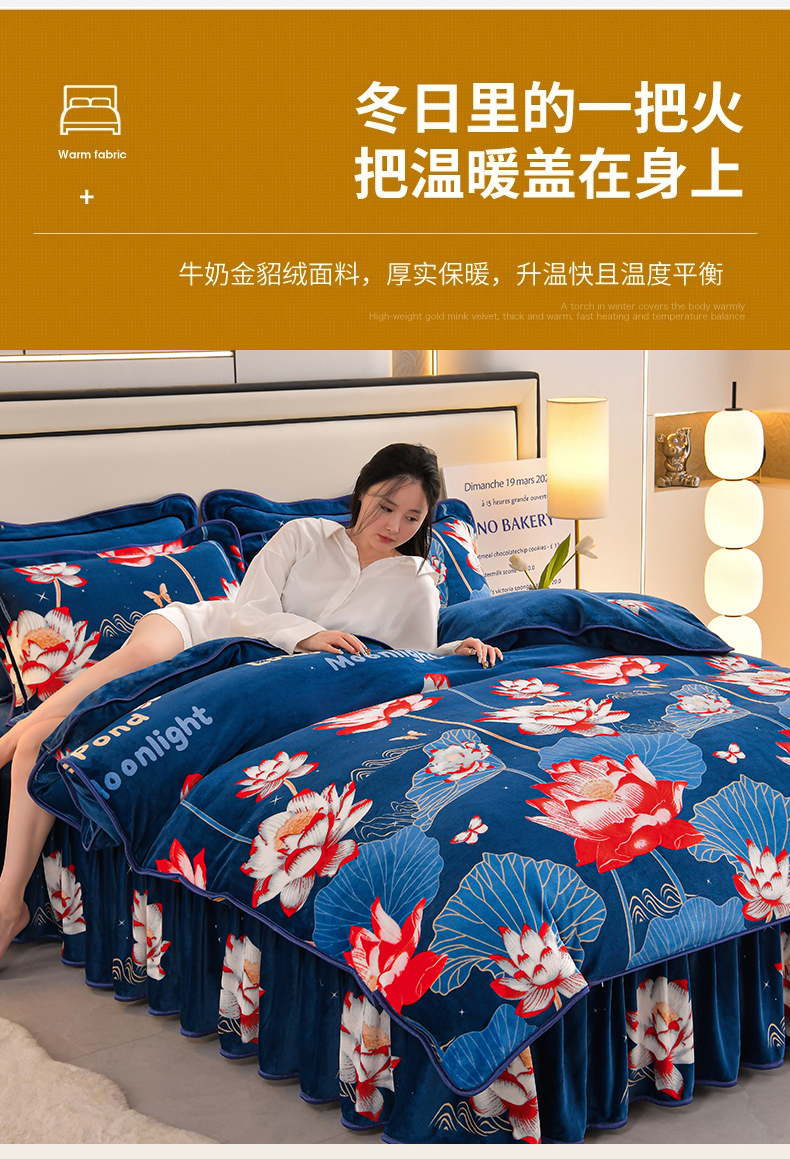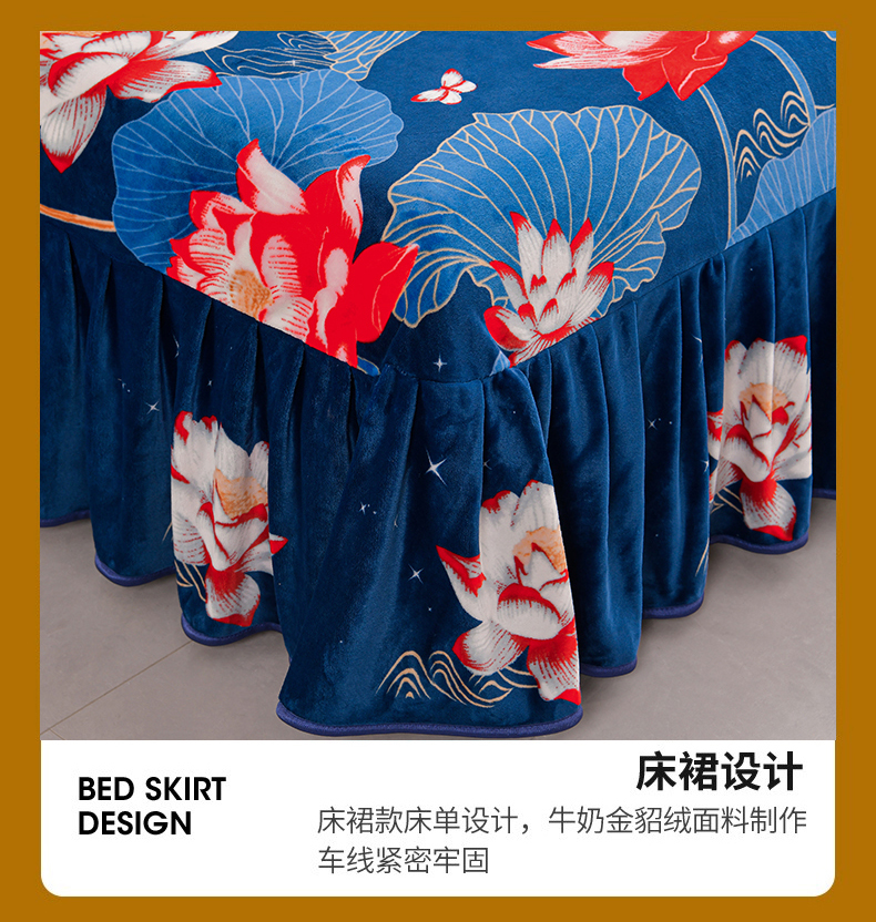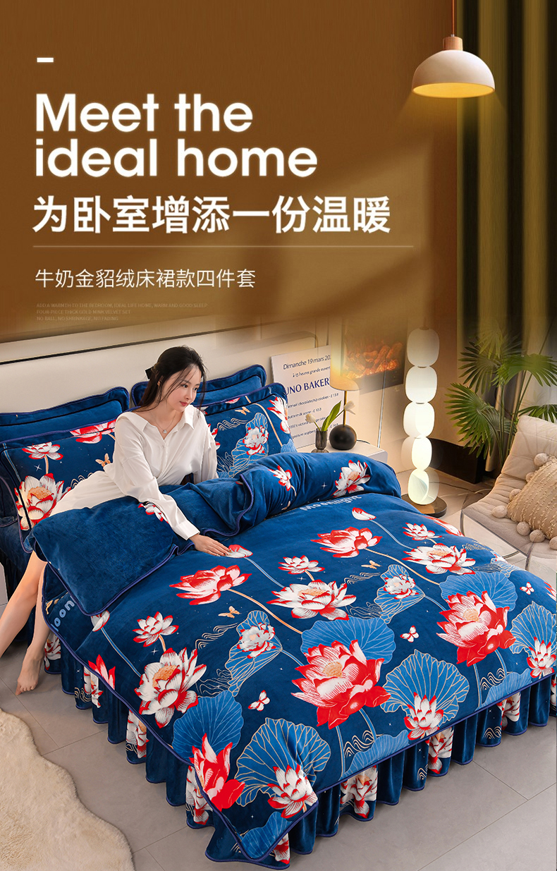 商品名称:馨梦缘 2025新款小包边款牛奶绒8.5斤高克重牛奶绒金雕绒床裙款四件套 富贵花开
