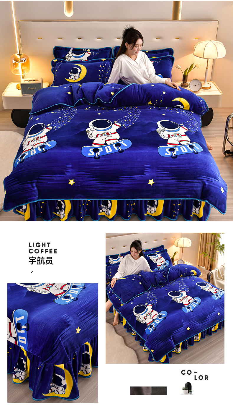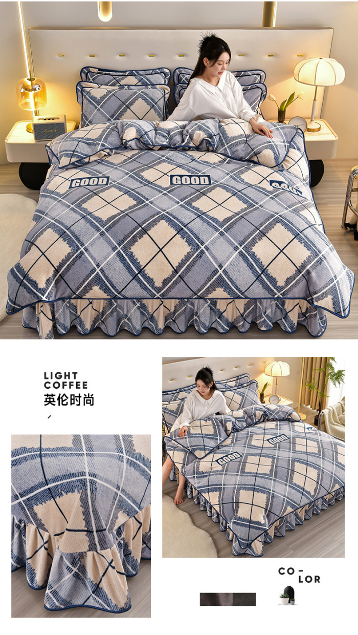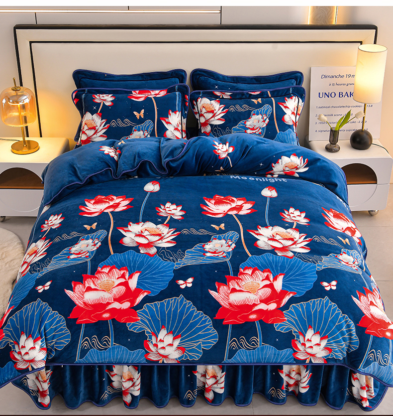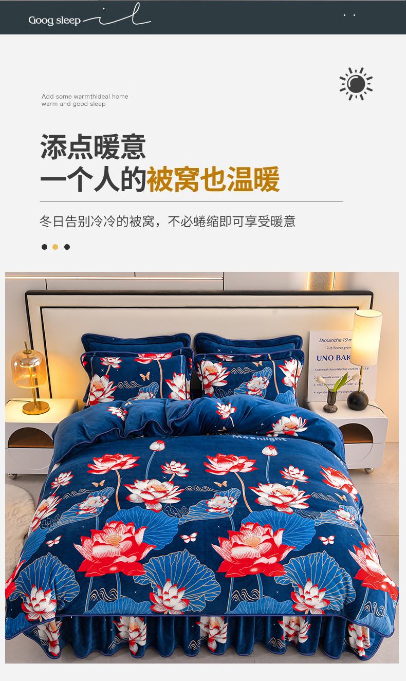 商品名称:馨梦缘 2025新款小包边款牛奶绒8.5斤高克重牛奶绒金雕绒床裙款四件套 富贵花开