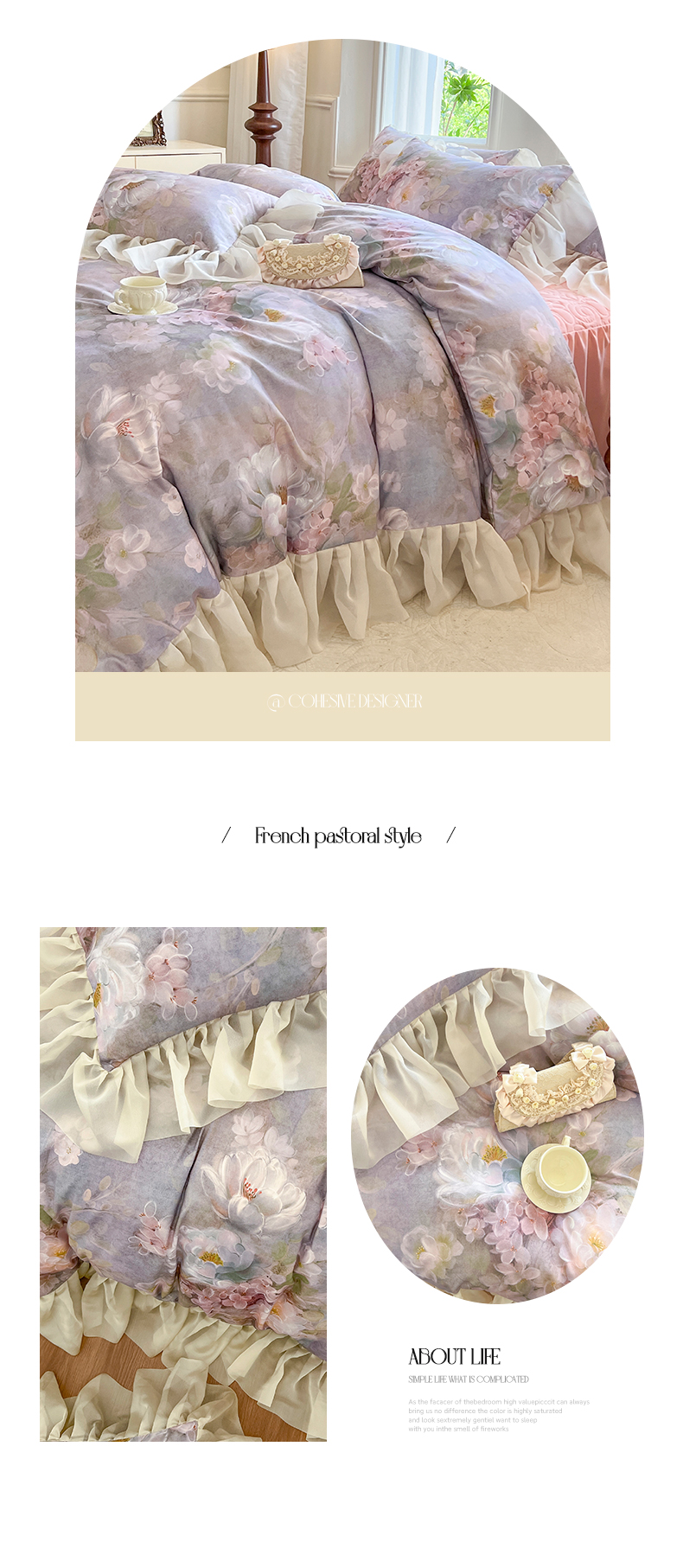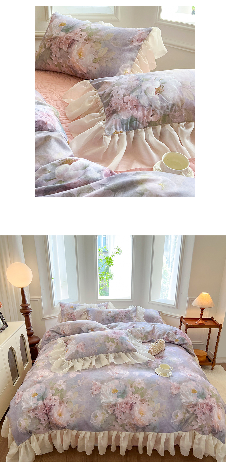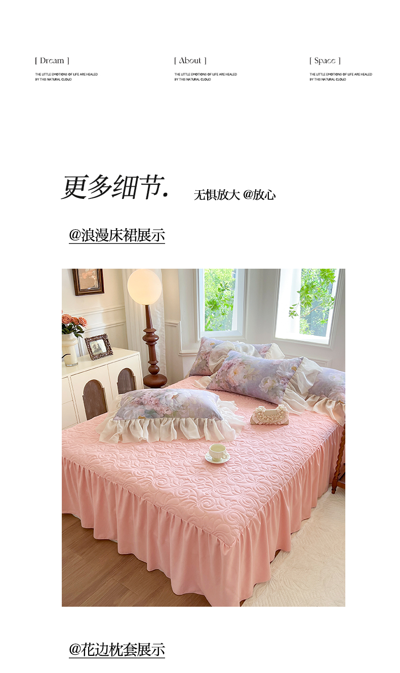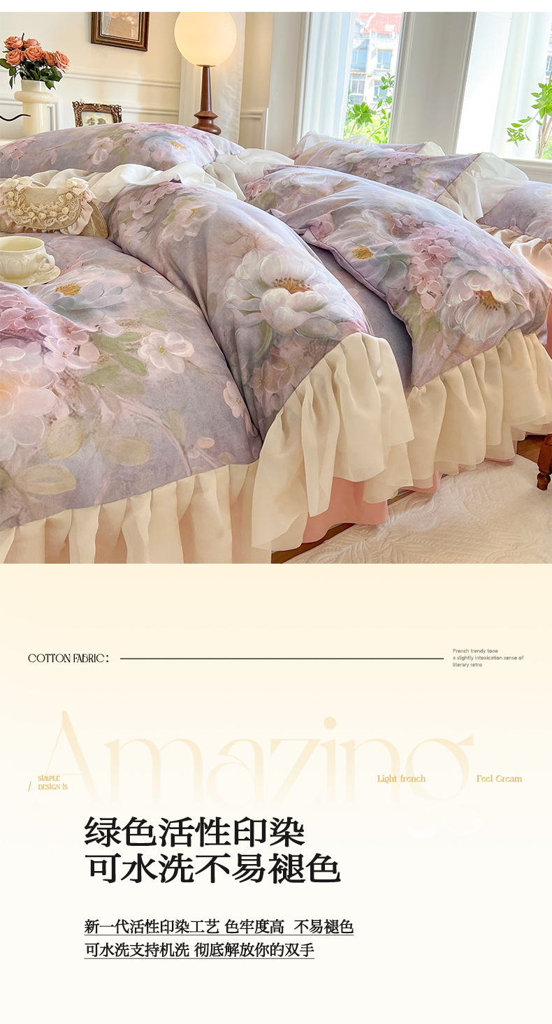 (总)网红馆(ck家纺) 2026新款全棉蕾丝花边床裙款床笠晨暮花间系列,绯红,粉色,麦绿,米色,浅紫,雾蓝