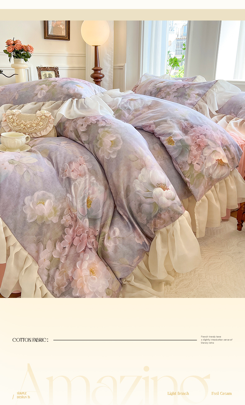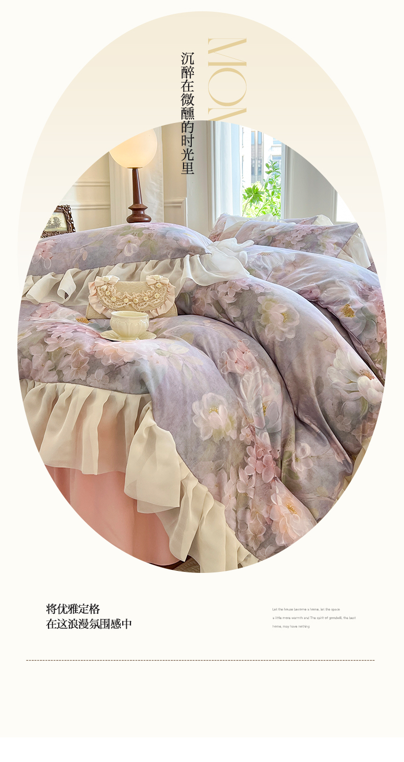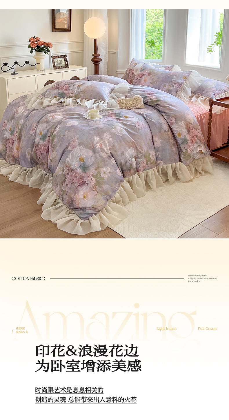 (总)网红馆(ck家纺) 2025新款全棉磨毛印花床裙款复古法式优雅四件套,花舞漫天-粉,玫瑰趣事-粉,玫瑰趣事-灰,梦语-桔