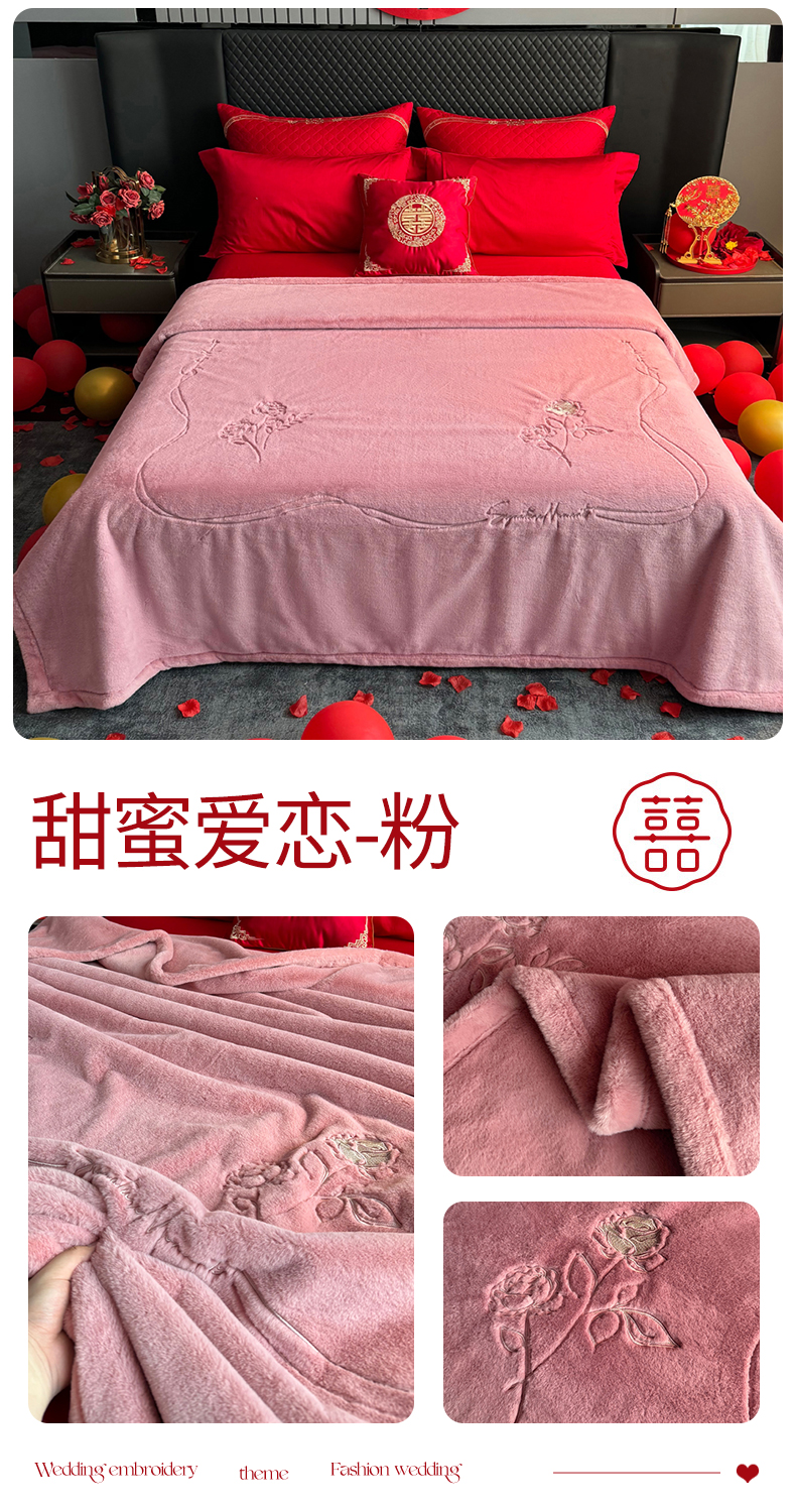商品名称:2024新款仿皮草兔绒精品绣花毛毯毯子 甜蜜爱恋-粉