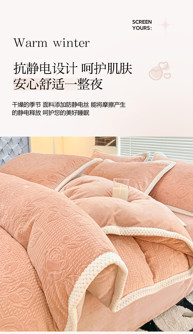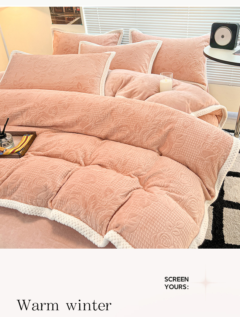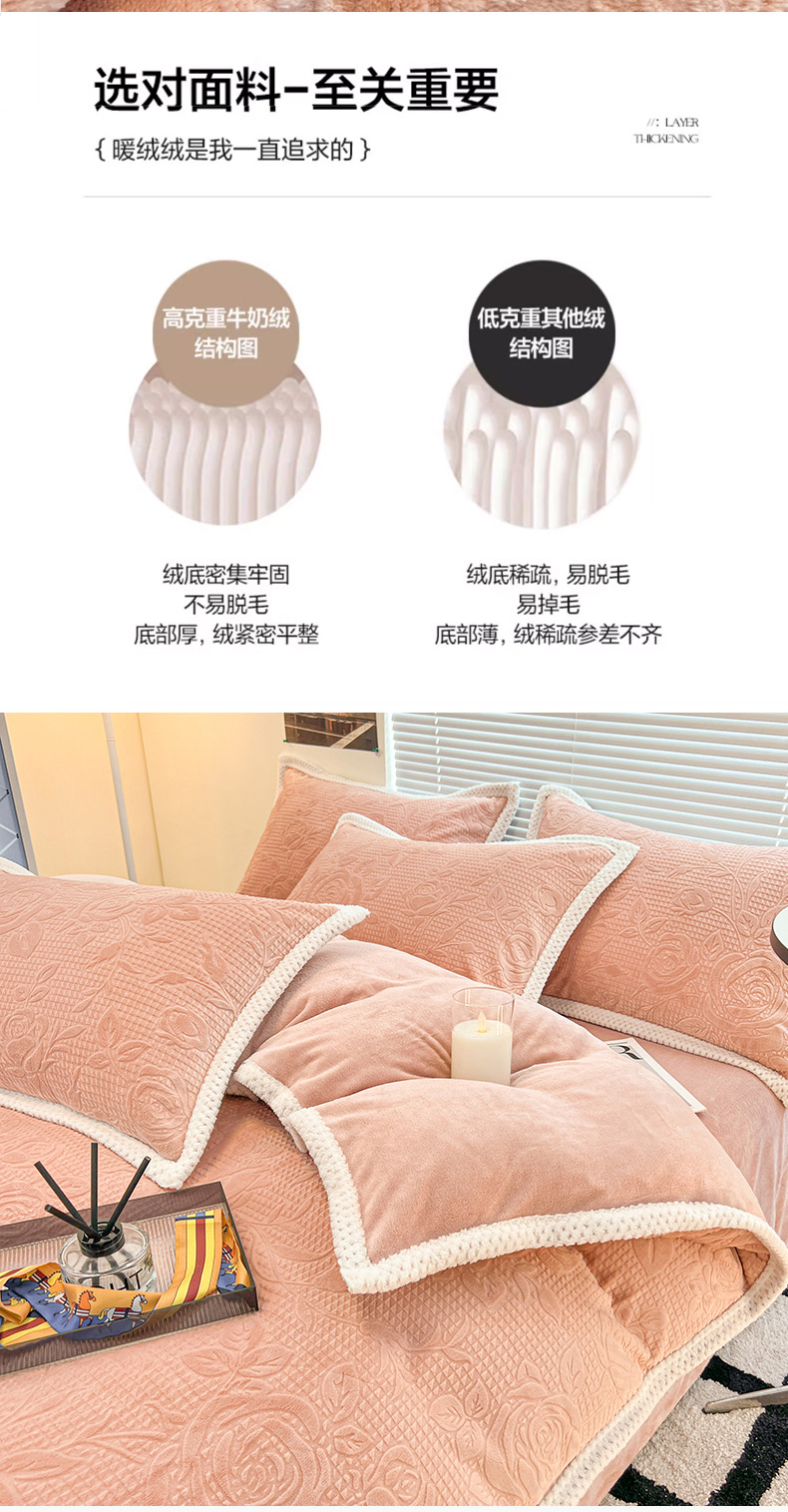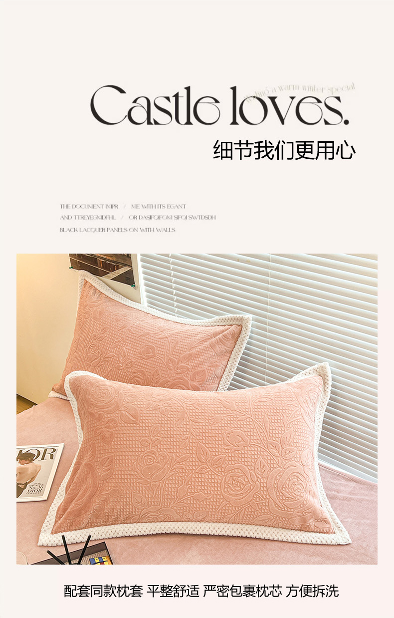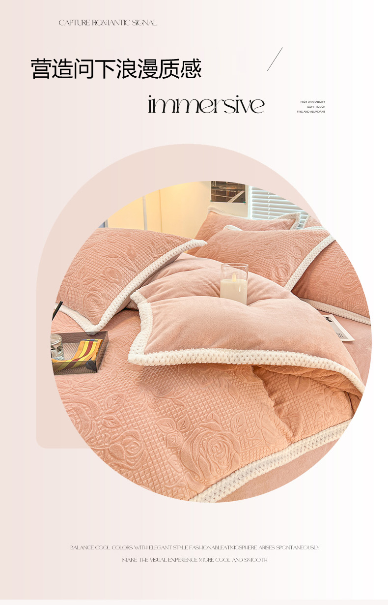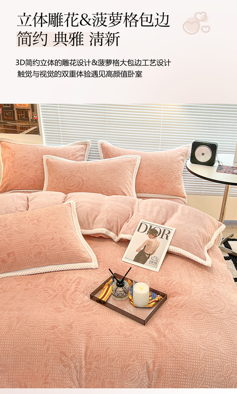 商品名称:2024新款A类高克重3D立体雕花牛奶绒保暖系列套件单品-被套 玫瑰恋情粉