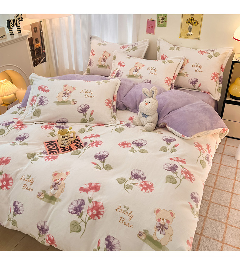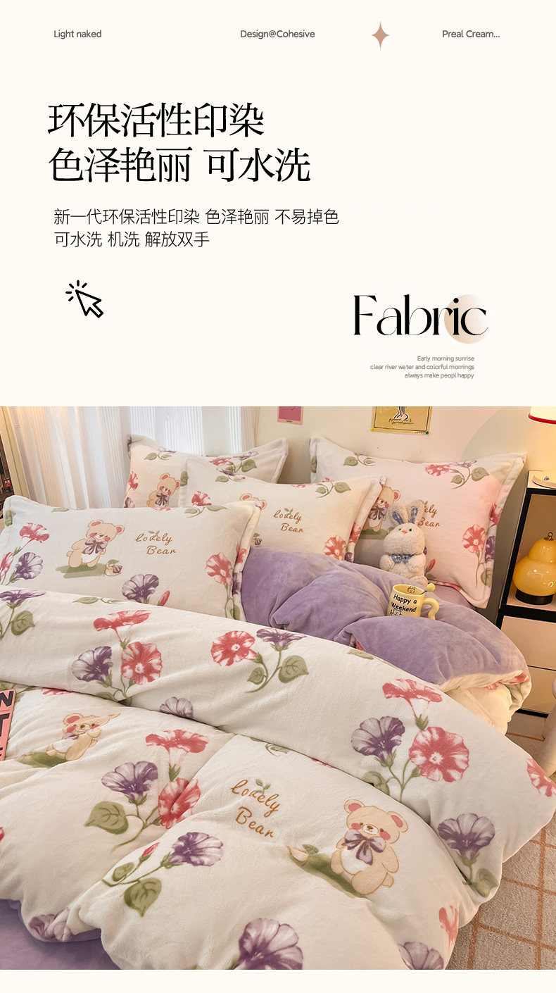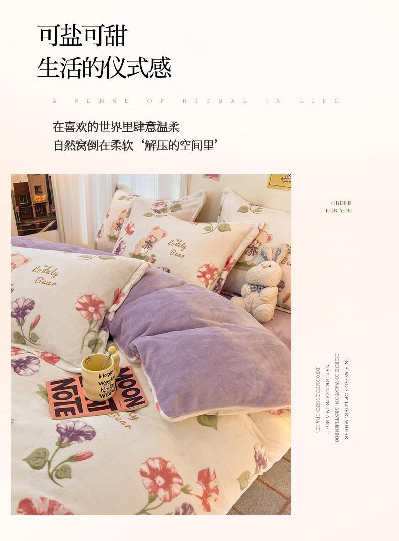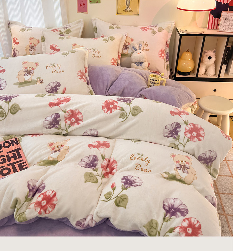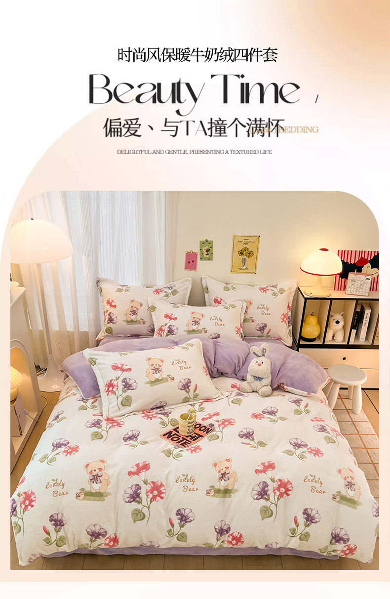 当前位置: 91家纺网 > 商品网购 > 床品套件 > 四件套 > 牛奶绒四件套 > 2024新款A类高克重时尚风牛奶绒加厚保暖系列套件单品-四件套 牵牛花小熊